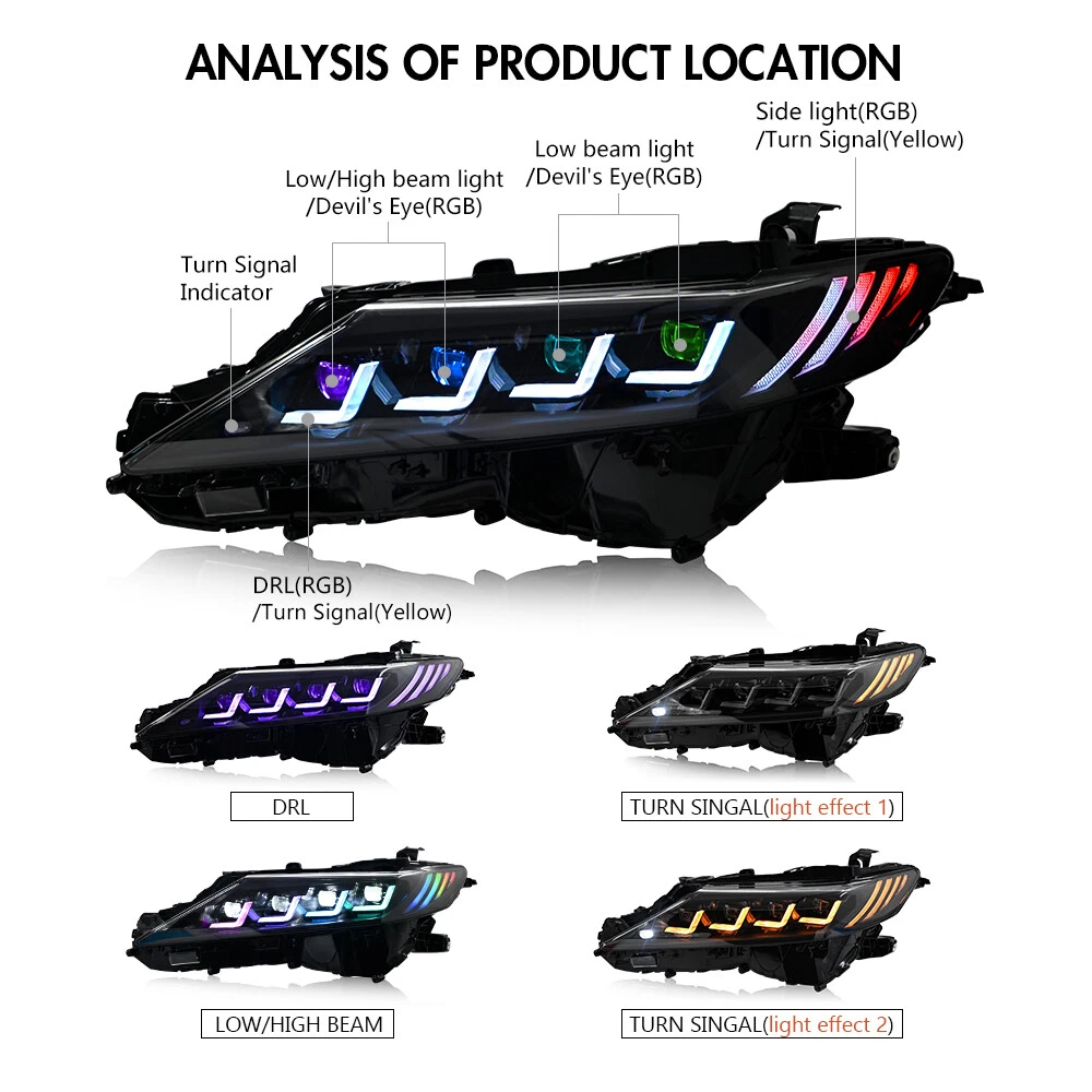 RGB LED Headlights For Toyota Camry 2018-2023 RGB DRL 8-Lenses Headlamp Assembly RGB LED Headlights For Toyota Camry 8Th Gen 2018-2022 Sequential Turn Assembly COMPATIBILITY: For Toyota Camry 8th Gen SE/LE/XSE/XLE/TRD 2018-2023 2018-2024 Please contact us before returning the products, we will do our best to help you solve all the problem well with good service! PACKAGE INCLUDES: 1 Pair headlights ( 1 x driver's side and 1 x passenger's side ) Plug & Play Harness Adapter FEATURES: 【Fitment】TT-ABC LED Headlights compatible with Toyota Camry SE LE XSE XLE TRD 2018 2019 2020 2021 2022 2023 2024 (Plug and play), headlights customized according to the original vehicle, perfectly fit your car. Package includes a pair of headlights (driver's side headlight and passenger's side headlight) 【Turn Signal with Special Design】Sequential Turning Signal/Dynaic Animation w/Breath Running Light. Breathing light and sequential turning signal in motion greets you upon your arrival or bid you farewell. 【Professional safety testing】Passed the IP67 test, with reverse polarity protection and open circuit protection, waterproof, shock resistant, dust-proof provide protection for your long-term use. 【Easy installation】Plug and play, no complicated procedures during installation, and no need for many tools. Please feel free to contact us, if you meet any problem while using or installing, we will reply you as soon as possible. 【After-sales】We provide perfect after-sales service, provide guarantee for product qualityand after-sales service guarantee. Sequential LED Turn Signal Plug and Play, Harness Adapter is included, All bulbs are built-in, no extra bulbs needed Black housing Great upgrade to enhance your vehicle's exterior Easy to install ( professional installation recommended ) DRL (White color)+Turn Signal (Yellow color)+High Beam+Low Beam lights High quality direct replacement part of the original headlights Waterproof, Dustproof, Shockproof These are the NEW redesigned version with better sealing and better LEDs Three year warranty Note: Please confirm the year of your car/light shape/ plug of your original lights whether these information as same as our lights, if you can't confirm it, please contact us. Please double check shipping address, We are not responsible for incorrect or undeliverable addresses.You can't change your shipping address after placing an order. Please Using your factory supplied connector/harness will avoid cutting or modifying any wires. We only provide electronic invoice "packing slip", if you need it, please note or contact us when you place an order. We will open the box and inspect the returned item to see if it is intact and the correct item before refunding you. If there is a problem with the product, please feel free to contact us, we can help you solve it as soon as quickly! Payment Delivery details After sales Contact us For tips Payment We only accept payment via eBay. Please make sure your eBay address is correct before you pay. Insufficient information will delay the order process so please read the invoice carefully during checkout. Delivery details To United States: 3-6 business days. Package will be sent out within 24 hours after the pament is received. Pick-up is unsupported servise. We will not be responsible for any delivery failure due to unclear address. Delivery is not available on weekends, public holidays or after business hours. After sales After-sale If it happens that the lights get moisture after you install them on your car, it would be normal for first time using. You just need to keep using for a period of days, the moisture will disappear. because there is inner air cycling in the lights as we design. As for headlights, you can also open the cover of low/high beam so that the moisture will out more quickly. If the moisture still exist, please feel free to send us message for help, we will try our best to help you. After you install, if you find that there have function does not work, please check if the harness is connected correctly, and exchange the left and right , If it still does not work, please rember take some photos or videos, please feel free to contact us. We will appreciate if you can takes some pictures or videos about your problem, and also send us the barcode of the products(every product we sell has a barcode on the backside of the light and outside of the package, it's very important for us to find the problem) If you open a request or case optionaly before communication, it would be hard for us to serve you. Contact us If you have any problem, please contact us or leave message for us for free. We will reply at once when convient. Don't worry, we always here waiting for your and like to help you. For tips There are some tips for you: 1. If There are any problems with the product, please contact with us before leaving any feedback or raise any dispute. 2. If you are in our exclusion countries. Please write to us for shipping .If When the goods arrive, please check them carefully 3. If you find that the goods have been damaged, please be sure to refuse to collect the goods and ask the courier to return the goods to us. If the goods are damaged, please do not collect. 4. If the item you have ordered is defective, contact us within the warranty period, we will replace the defective item for you with an item of equal functionality at first. 5. If buyer do not want neither replacement nor partial refund, but want returning,buyer should be responsible for all the returning ship charges.