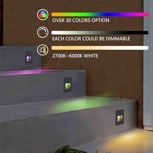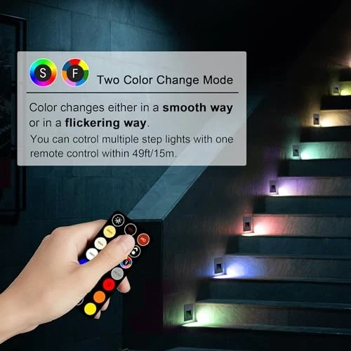 Return Policy Fast Delivery Trusted seller RGB LED Step Lights Indoor Outdoor Color Changing Stair Lights with Remote Control, 2700K-6000K Over 30 Colors, 12V 4W Low Voltage Deck Stairway Light for Steps, Black Vertical 6-Pack Product Description 【RGBW Color Changing Step Lights】Compared to other rgb outdoor indoor step lights that have only 16 colors, this rgb step lights low voltage have over 30 colors and daily warm white to daylight white color for you to choose, much more color choices for you. 【Remote Control Stair Lights】These 4w indoor outdoor stair lights have remote control function, very easy to change color/brightness/timer/mode of the 12v led stair lights. Max control distance is 49ft/15m. 【Dimmable By Remote】Each color could be dimmable by using the remote controller. Brightness can be dimmed from 10%-100%. 【2 Color Cycle Modes+DIY Mode】The outdoor step lights have 2 color cycle modes(Smooth Mode and Flash Mode) to let colors change automatically, which is suitable for creating party atmosp. You can also speed up/down the changing speed by remote control. Besides, you could also DIY a lighting mode, choose your favorite color, then long press the “DIY” button. The light color will be saved and can be used next time you press the button again. 【Timer Function】The indoor stair lights can be auto-off using timer function. If you want the 12v led step lights turn off itself after 2 hours, just press the timer button once. If 4 hours, press twice. The maximum you can set is 24 hours. Beside, the remote controller also have a preset timer button which can set the low voltage stair lights turn off after 10 hours directly. 【Memory Function&Synchronization】The low voltage step lights with remote control can memorize the last color or mode you set. One remote controller can control all the color changing stairway lights in same area within sensing distance. 【IP65 Waterproof Step Lights】With die-cast aluminum cg material, and water-tight connections, the deck stair lights for steps are IP65 waterproofing. Perfect for decorating your home, garden, yard, especially for Christmas, Halloween party. Shipping Returns Payment Shipping Shipping is FREE to all addresses other than APO/PO boxes in the lower 48 states. All our stock ships from US-based warehouses. Shipped via USPS or UPS (depending on location and package weight) Unless stated otherwise, all orders will ship within 24-72 hours of your payment being processed. Check our feedback to see the great reviews of FAST shipping we offer. Returns Seller does not accept returns Payment We currently accept payment via eBay managed payments only. Once payment is cleared, we will dispatch your shipment within 1-3 business days. Please refer to the "Shipping" tab for more information regarding shipping speed to your destination.