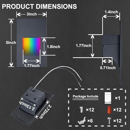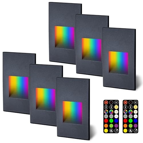 Assembly Required: No Country of Origin: China Part Number: A-SLW4-RGB-VB-6 Shade Material: Aluminum Material: Aluminum Voltage: 12 Volts Item Length: 1 Light fixture form: Wall Power Source: Corded Electric Lighting Method: Downlight Color: Black Number of Items: 6 Brand: Does Not Apply MPN: Does Not Apply EAN: Does Not Apply Item Weight: 3.23 pounds Size: 2.95 inches Type: Does Not Apply Switch Type: Push Button Item model number: A-SLW4-RGB-VB-6 Included Components: RGB Step Lights Number of Light Sources: 1 Control Method: Remote Water Resistance Level: Waterproof Theme: Rainbow Manufacturer: Does Not Apply Recommended Uses For Product: indoor outdoor use Product Dimensions: 2.95"L x 1.42"W x 4.88"H Mounting Type: Wall Mount Room Type: Storage Room Item Width: 1 Finish types: Painted Shade Color: Black Indoor Outdoor Usage: Outdoor, Indoor Wattage: 4 watts Shape: Rectangular Specific Uses For Product: Patio Unit Count: 6.0 Count Item Height: 1 Finish Type: Painted UPC: Does Not Apply Style: Modern Light Source Type: LED Special Feature: Adjustable Color Temperature, Waterproof, Timer, Low Voltage, Col Model Name: LED 12V RGB Step Lights VB 6Pack gtin13: Does Not Apply