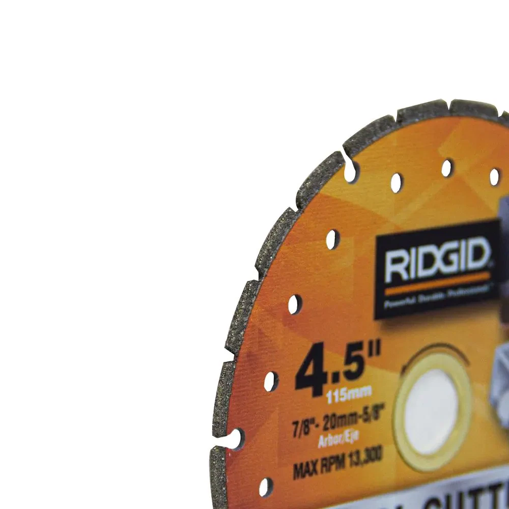 Material Cut: Metal Tools Product Type: Power Tool Tool Type: Saw Blade Type: Does not apply gtin13: 313103654699 Number in Package: 1 Brand: RIDGID Returnable: 90-Day Teeth per Inch: 0 Rim Type: Segmented UPC: 313103654699 Color Family: Orange Saw Blade Material: Diamond Ideally Used With: Angle Grinders Blade Diameter (in): 4-1/2 in Blade Type: Diamond Diameter (in): 4.5 in Power Tool Accessory Type: Circular Saw Blade