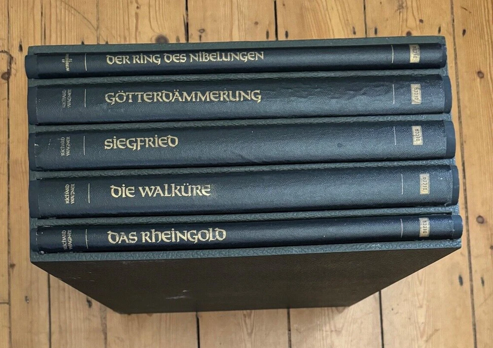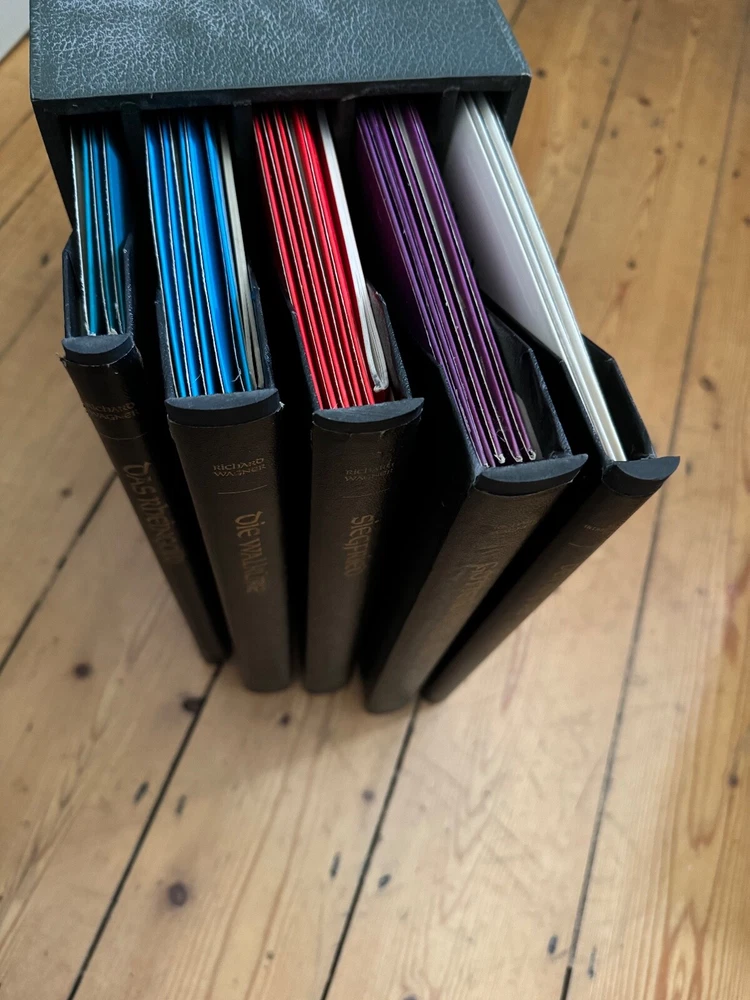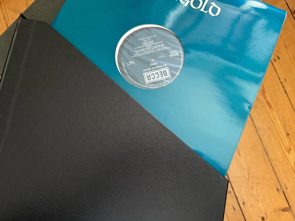 Decca UK pressing. Includes all libretti. Wooden slipcase with wooden-edged record envelopes, embossed front to box. All four operas + an introduction to The Ring. Record condition: Near Mint Box/booklets condition: Excellent+ (stereo)