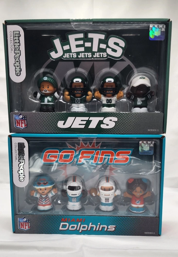 Package of 2. NFL Rivals New York Jets and Miami Dolphins. Unique bundle sold together! ***Check out my other listings for other collectors items!*** NFL officially licensed. New, sealed in box. Model # HND10 AND HND14/ Series 1 Free shipping for both! In Stock. Ships same day when ordered before 6pm EST. Get ready for some fun with the RIVALS Jets vs Dolphins NFL Little People Limited Ed New Sealed 2-Pack! This set features two adorable plush toys with the beloved characters from the NFL Dolphins team. The toys are made by Fisher-Price, a trusted brand in the world of toys.