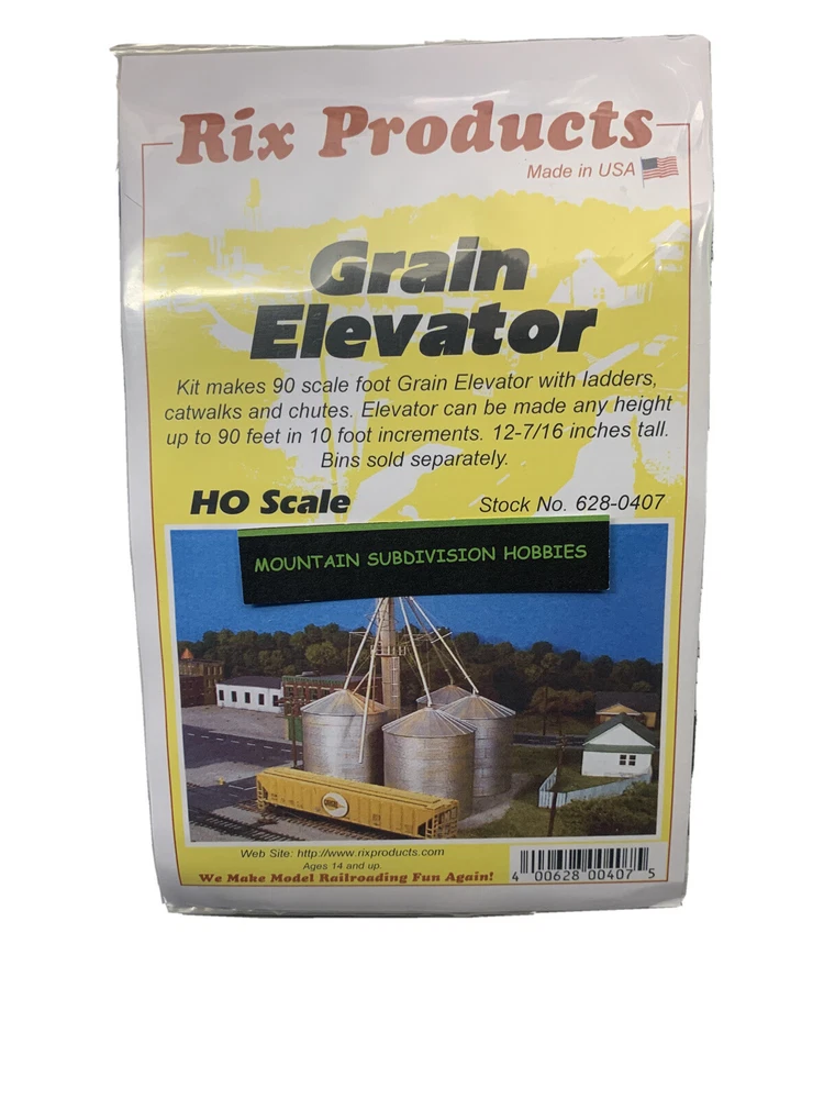 EVERY ORDER now gets a $5.00 coupon code toward a future order! (details inside shipment) Mountain Subdivision Hobbies modelrrsupply RIX Products #407 HO GRAIN ELEVATOR (KIT) The Rix Grain Elevator offers a highly detailed elevator with ladders, safety cages, platforms, chutes and tubes. The Grain Elevator can be built in 10 foot increments up to 90 feet tall. Color matches Galvanized metal. Grain bins shown in photo (stock no. 628-0304 and 628-0305) sold separately. Listing is for elevator only - HO Scale kit __________________________________________________________________ Questions, Special orders, Inventory requests: Please contact us using eBay's message system. Your shipping address : IMPORTANT!! Please confirm your shipping address is correct before making payment. You know where you live, we don't! eBay does not allow us to change an address after payment is made. If you ask us to change address, it will require us to cancel your order, ask you to correct your address and redo order. Combined Shipping: International Due to eBay's new policies, they require us to require immediate payment on your purchase. PLEASE use the eBay shopping cart - it may save you money! In the event eBay overcharges you for shipping, we will send a refund for the correction. Combined Shipping Discounts: USA Due to eBay's new policies, they require us to require immediate payment on your purchase. PLEASE use the eBay shopping cart - it may save you money! If we issue a credit for overpayment of shipping, we may deduct a portion of the overpayment to cover eBay fees. eBay DOES NOT refund the fees we pay based on shipping charges if we issue a refund for shipping! Paid orders may be combined or ship as seperate orders with no shipping refund. USA Shipping: We ship using USPS First Class, Parcel Post, Priority Mail, and occasionally FedEX. We may upgrade your shipping method at our discretion. Tracking is provided. Orders over $750 will require a signature per Paypal rules. International Shipping, Customs Fees, Import Taxes and Duty: We ship USPS First Class International and Priority Mail. It's your choice! There is limited or no tracking on FCI or Flat Rate Priority Shipping. Allow two to ten weeks when choosing First Class International, but it's usually far less. Please Note: Import duties, taxes, and charges are not included in the item price or shipping cost. These charges are the buyer's responsibility. Please check with your country's customs office to determine what these additional costs will be prior to bidding or buying. Don't ask us to falsify a customs form...We will not do it. Insurance: We insure all International shipments and some domestic shipments. Our insurance carrier requires a 20 day domestic (USA) and 40 day International waiting period before we file a claim. You agree to wait the required time and agree to complete a online affidavit for the insurance company if we file a claim for your lost or damaged shipment. Shipsaver is our carrier and they provide excellent service. Handling and Shipping time: WE SHIP FAST! All orders ship same or the next day. In the event of an issue, we will message you via eBay message system. Read our feedback page to see what our customers say about us. Please be aware USA Shipping Holidays may affect International Shipments. Sales Tax: New York Residents will be charged Sales Tax - It's the law. Returns: No returns are accepted on opened items. All items we sell are covered by Manufacturer Warranty. D o not open a return case for defective items, Contact us FIRST, we'll work it out. A restocking charge of 15-20% may apply. We do not refund original shipping charges. Please review the return policy on the shipping tab. Warranty? New or Used?: Everything we sell is brand new and covered by Manufacturer's Warranty unless noted. We will assist you in the warranty process if needed. We only sell brand new items - Our items are all factory fresh! Thanks for choosing Mountain Subdivision Hobbies Supplying modelers with items from premium model railroad & DCC manufacturers since 2002