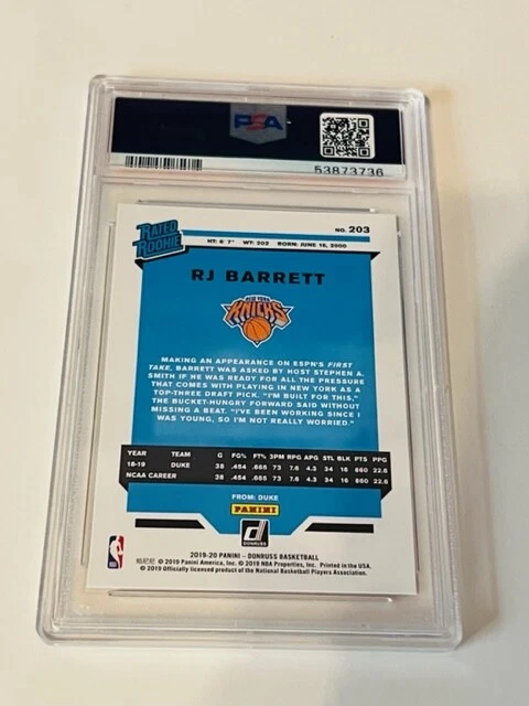 Absolutely awesome and highly collectible RARE 2019-20 RJ Barrett Graded Rookie Card. See all pictures for amazing condition, size, and detail. There are absolutely no returns on graded sports cards as you know exactly what you are getting because it is professionally graded and the market for sports cards changes literally on a daily basis. Check out my store for some of the rarest vintage collectibles online from all eras. Thanks for looking and have a great day! :)