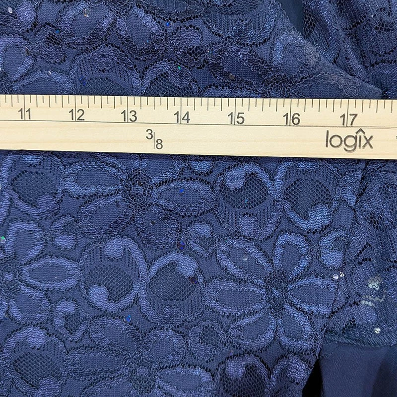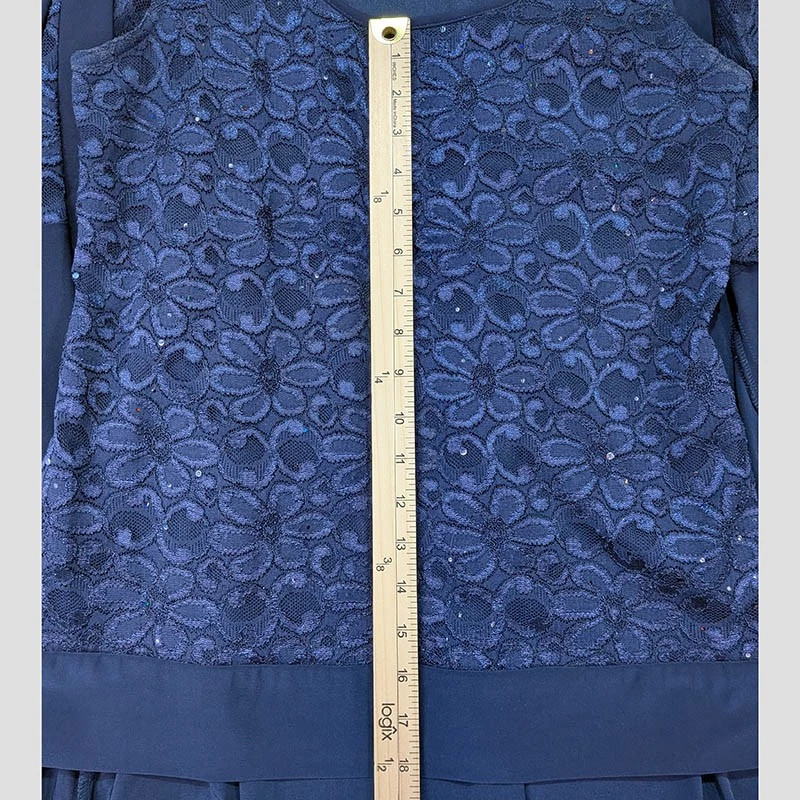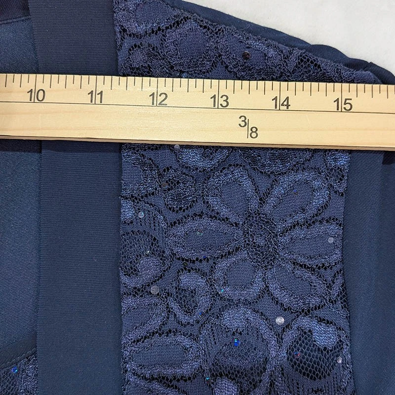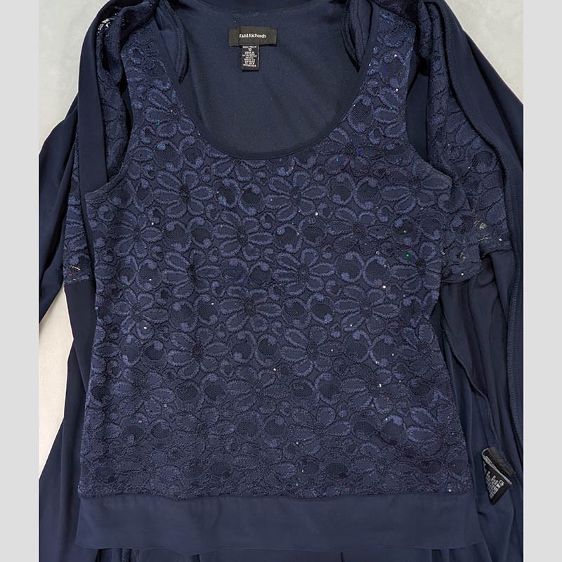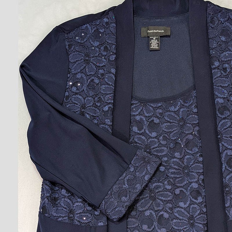 R&M Richards Sequins Cardigan with Sleeveless Shell Top Womens 10 Blue Shoulder Pads Floral Lace Layered Ensemble 95% Polyester 5% Spandex Hand Wash Cardigan: Shoulders 15.5" Length 29" Sleeve 18" Tank: Pit to Pit 17.5" Length 18" All measurements are approximate and done with garment laid flat Measurements in Photos No tears, stains or holes, very good pre-owned condition Fast Shipping! Mother of the Bride Evening Wear Classic Elegant Special Occasion