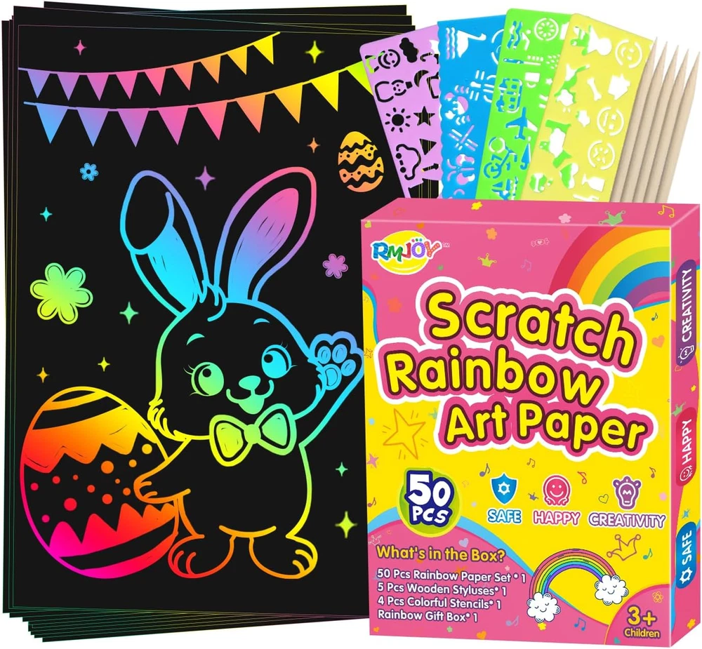Easter Gift for Kids & Easter Basket Stuffers for Toddlers: these funny party favors art toys are super perfect to draw or do coloring painting! Keep spirits high with creative art supplies! Simple and fun crafts for kids are a great way to stay thoughtfully engaged and entertained. Magic boy's gift for Easter, Thanksgiving, Children's Day, Holiday, Birthday, Christmas or just for creative fun Easter Crafts for Kids and Adult: our art sets are suitable for kids who age 3 years and up. As a creative drawing activity, simple painting can develop children's key abilities, including fine drawing skills, imagination or creativity. Kids can use our colorful stencils or get creative to make each works their own! What's more, for parents, it can bring closer to children, increase intimacy Shinny Rainbow Art Paper Craft Set: our art paper sets features 60pcs rich & vibrant rainbow paper pieces that highlight the details of every coloring paper and art project; The valua art set are includes 50pcs scratch paper combined with shining gift box for easy to carry or store, 6 wooden styluses and 4 mini colorful stencils, meet your art project needs Creative Design & Easy to Use: Our craft kit comes with different types of drawing stencils, rainbow papers and wooden styluses for the kids to use! Art painting sets are a great alternative because they will encourage your kids to draw or create everything he likes. It will also increase the likelihood of your kid sticking to art projects because of they are easy to use Safety & Less Mess Craft Sets: our paper craft kits are made of premium paper making it extremely thick and hard to damage or torn; These scratch paper are a portable art set that allows kids to drawing line art or all kinds of patterns. It's a less mess & easy to clean, perfect art kits for all ages people who loves to draw Product Description Easter Basket Stuffers for Toddlers Easter Crafts for Kids! RMJOY art craft kits will be a great choice for you.No ink, no paint, no-mess painting, while support happy and safety for your kids. What a great idea to enjoy the pleasure of the parent-child time! Inspire Children's Artistic Talent Art Decoration for Kids Room Drawing any unique pattern according to your imagination, and then trim it out and used it as an art decoration, which will be a special crafts. Thickness Paper Our rainbow papers are made of good quality & thick paper, won't fade and deform easily that's allow your kids fun for it with a long period No Toxic Powder, Safe & Clean These scratch rainbow art papers no terrible flavor & easy to use that allows your kids spend their time to draw and create their masterpieces. What will the kids get PACHAGE INCLUDES 50 x Rainbow Paper Sets 6 x Wooden Styluses 4 x Colorful Stencils 1 x Rainbow Gift Box Handmade to make you smile. Crafting memories together. Big fun for little hands. Expressions of warmth and love 1 Mess Free Activity 2 Parent-child Fun Time 3 Get Away from Electronics 4 Love Gift Cards Easter Gifts for Kids Rainbow Scratch Paper are perfect gifts for 4 5 6 7 8 years old as birthday gifts, class gifts, Easter gifts, Thanksgiving gifts, Christmas gifts. Kids will find fun in our scratch paper! CLEAN & MAINTENANCE 1. Cleaning *Before drawing, choose a smooth desktop or floor *After drawing, just wipe out the mess with a wet towel 2. Maintenance * Made of paper, not waterproof, please store in a cool, dry place. * After used, place in a box to avoid loss CAUTION * Use the scratch under adult supervision * Not for children under 3 yrs