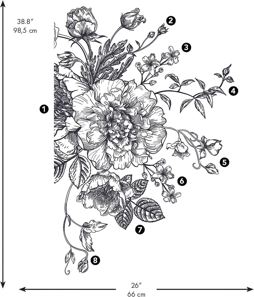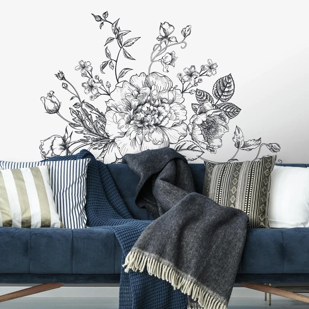 Made in the USA Comes with 10 wall decals; Assembled size 38.8. Inches x 26 inches Easy to apply - just peel and stick Applies to any smooth surface Decals are removable and repositionable with no sticky residue Create a beautiful scene with black and white peony giant wall decal by RoomMates, and watch your room immediately come alive. Created with high quality vinyl ensuring a professional finish, apply Decals in seconds on the wall – just peel and stick. Proven 100% safe for walls, remove, reposition, and reuse as often as needed. Add this unique design to your room decor today.