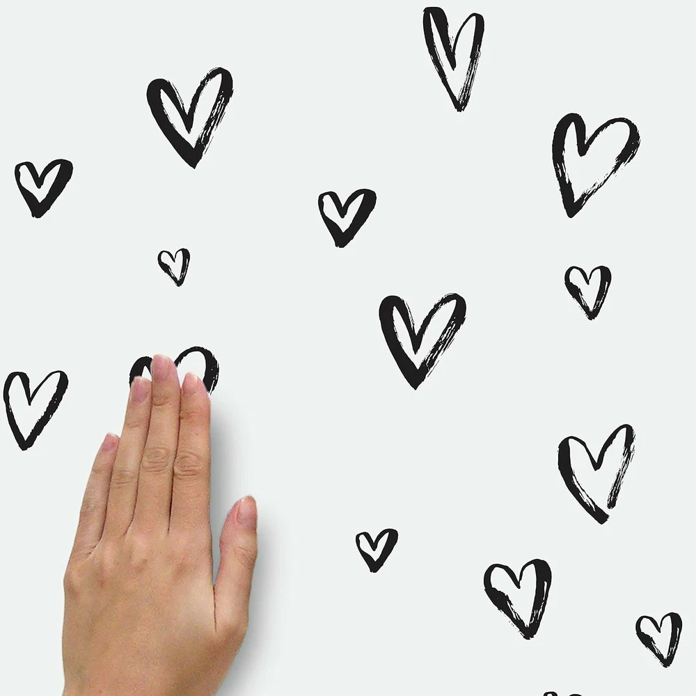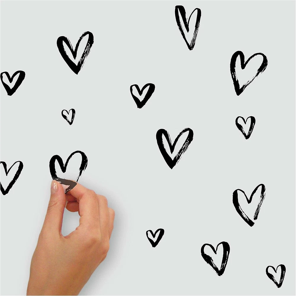 Comes with 76 wall decals; decal range size 1.32 inches x 1.33 inches to 2.48 inches x 3.52 inches Applies to any smooth, clean surface Removable and repositionable with no sticky residue left behind Reuse from one space to the next Perfect for both renters and homeowners Proudly made in the USA, fully CPSIA compliant, free of harmful chemicals and are non-toxic Playfully romantic, these Sketchy Hearts peel and stick wall decals from RoomMates make a happy statement on walls, furniture or lockers. The whimsical doodle heart art is in inky black and coordinates with both bold and simple color palettes and hundreds of décor styles. Feel the love wherever you apply them! RoomMates wall decals are an easy and affordable way to decorate in minutes. Reposition or remove them effortlessly with no remaining sticky residue or damage to walls.