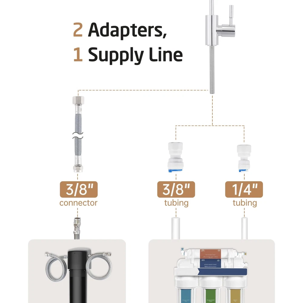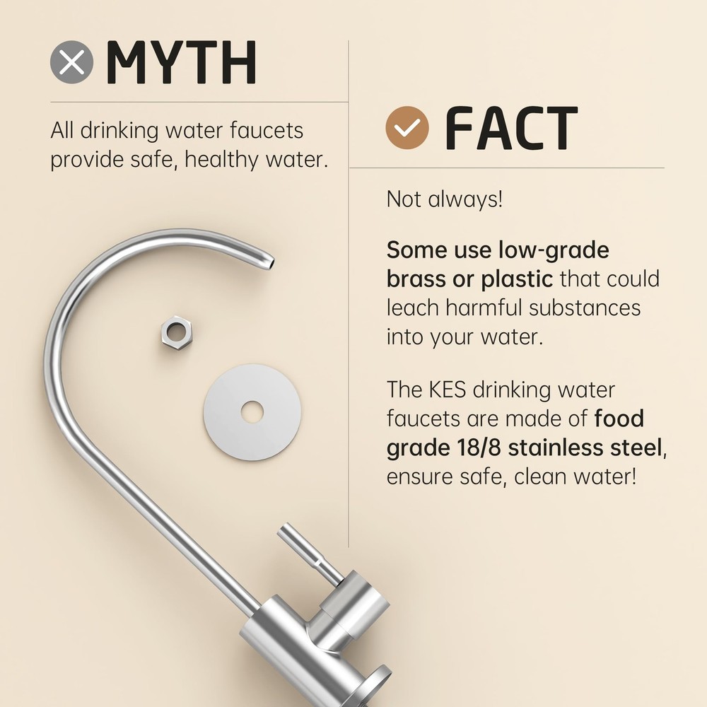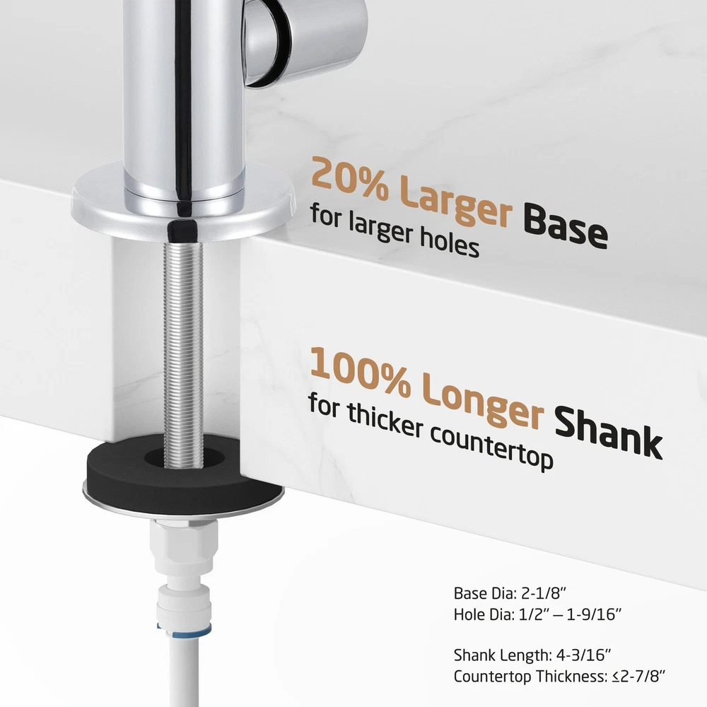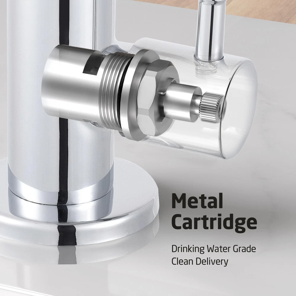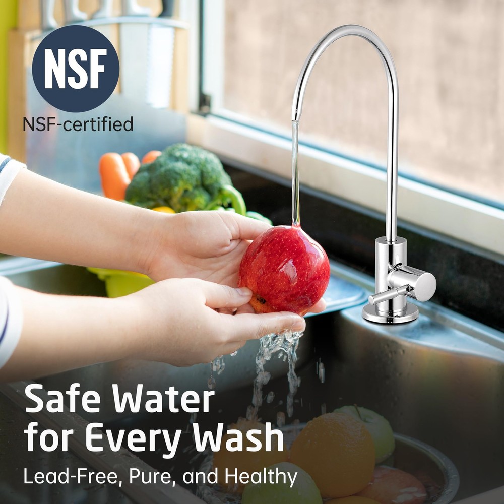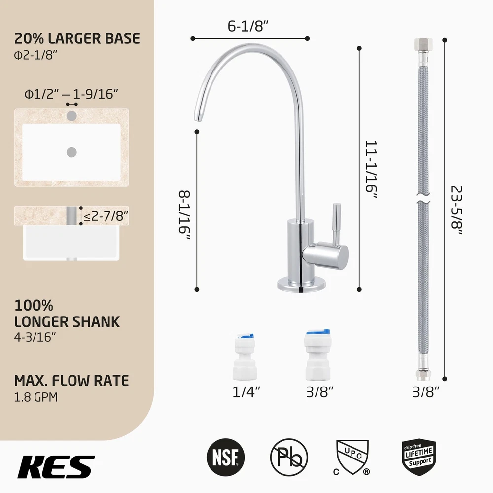 SPECIFICATIONS -Body Material: SUS304 Stainless Steel -Finish: Polished Chrome -Valve Type: Ceramic Disc Cartridge -Faucet Type: Non-air-gap faucet -Installation: Deck-Mounted -Overall Height: 11 1/32 inches -Spout Height: 8 1/32 inches -Spout Swivel: 360 Degrees -Spout Reach: 5 25/32 inches -Deck Hole Size: 7/16 ~ 1 31/32 inches (11~50mm) -Max. Deck Thickness: 2 61/64 inches (75mm) Package Includes 1 x Water Filter Faucet 1 x Deck-Mounted Hardware 1 x 1/4" Quick Connector 1 x 3/8" Quick Connector cUPC NSF Certified: reverse osmosis faucet meets U.S. and Canada high-quality standard (Uniform Plumbing Code), certified by IAPMO. The faucet body is made from premium grade no-lead stainless steel (with less than 0.25% lead content), complied with NSF/AB1953 lead-free regulation, and is safe for drinking water. It is more resistant to high heat and pressure, and more sturdy and hardwearing than zinc alloy faucets so it can last many years without leaking. Perfect for Thick Countertops: This newly upgraded faucet has a longer threaded stem and a larger base. The 4.2” long threaded stem fits countertops that are up to 2.9” thick. The 2.1” base is suitable for kitchen sink faucet holes that are 0.4” to 1.9” in diameter. Elegant 360° Swivel Spout: The swivel spout allows you to easily bring water to any area of the sink and turn the spout to the side when not in use. Ceramic Disc Cartridge. uses a high-quality ceramic disc cartridge (made to exceed 500,000 open/close cycles) to guarantee drip-free performance for the life of the faucet. The flow rate of this faucet is compliant with California water efficiency regulations and you can rest assured to use it. Easy Installation: Everything you need for installation is included: the faucet body, 1/4" & 3/8" quick connectors and deck-mounting hardware. You can install the faucet right away after receiving the package.