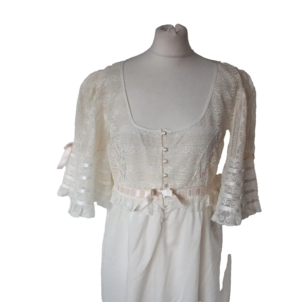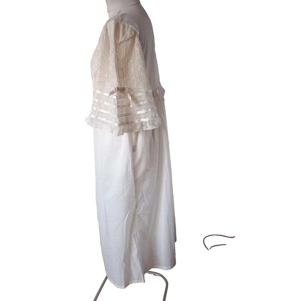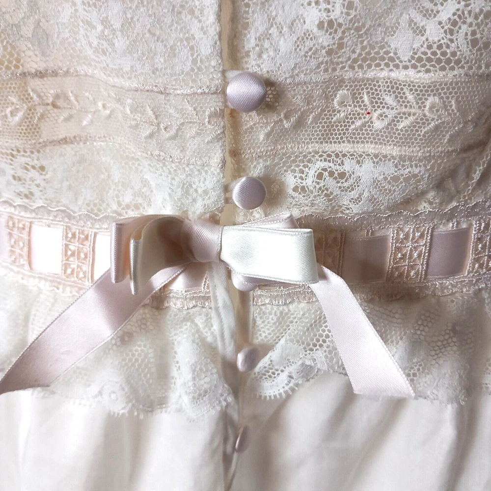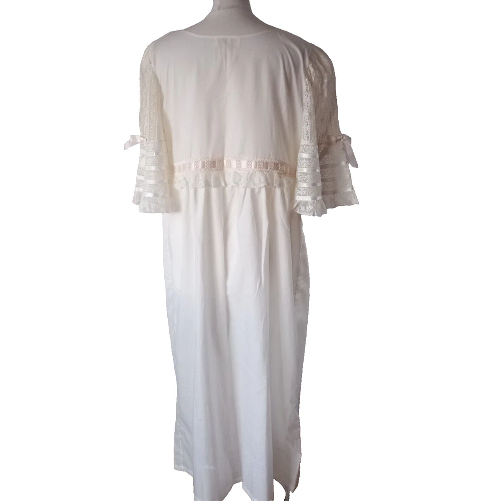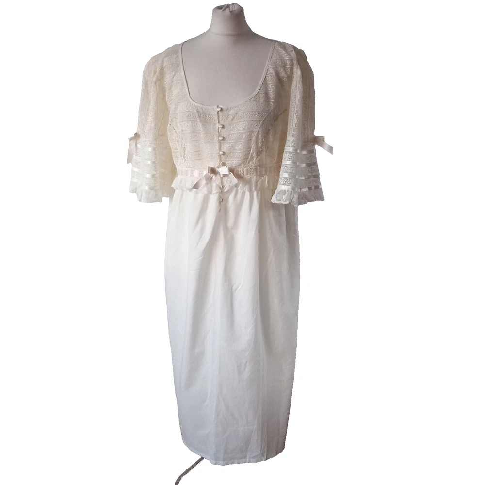 New old Stock amazing night dress long length in 100% cotton with ribbon, lace and tiny roses embroidered at the bust with satin covered buttons to the front. Make is Roberta LASSI and its made in Italy. Measures 22" pit to pit, 19" across the underbust waist area, 28" across hip area approx. Length nape to hem 45".