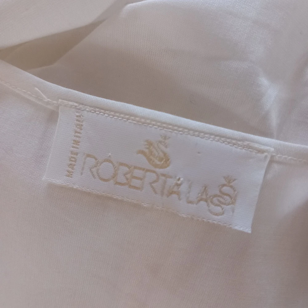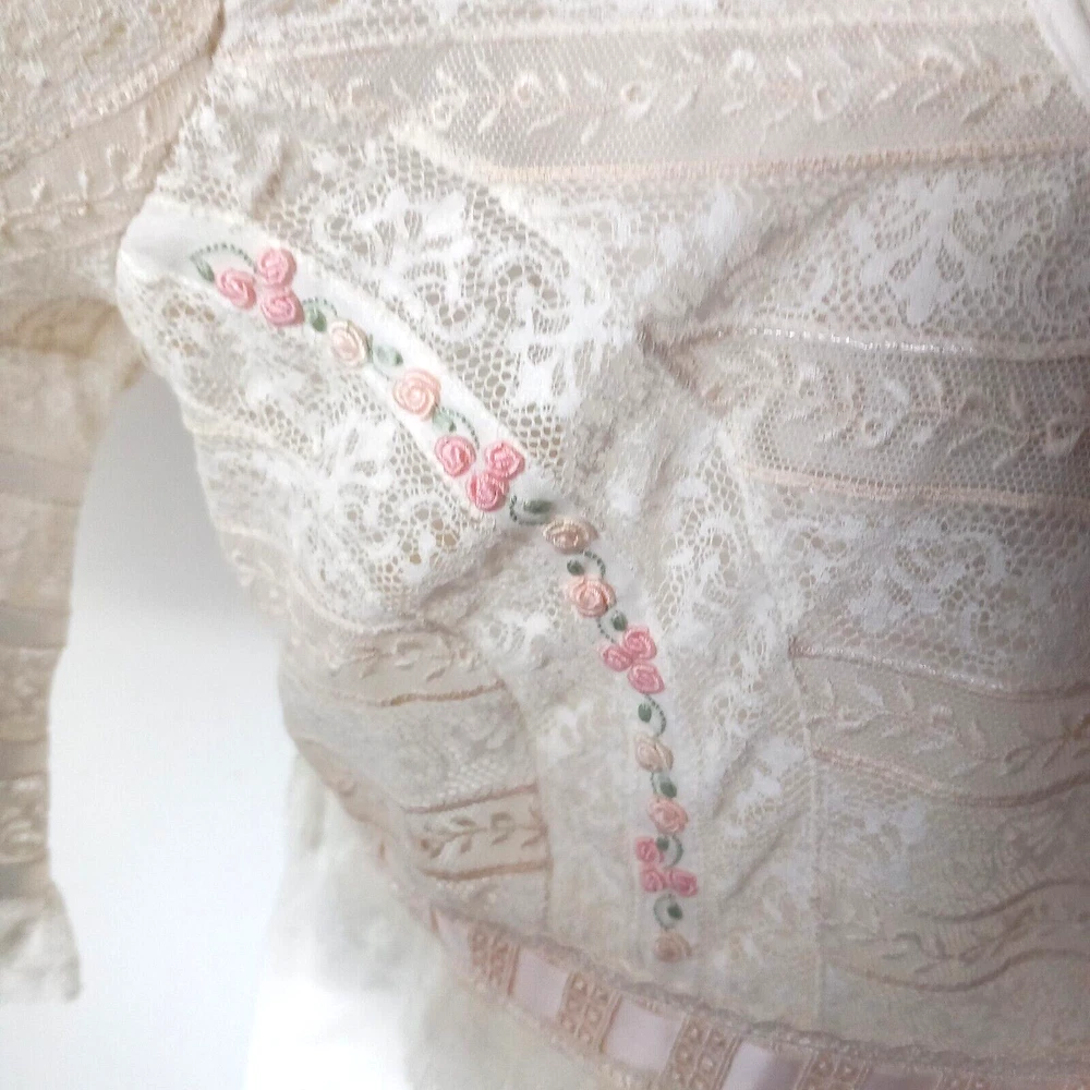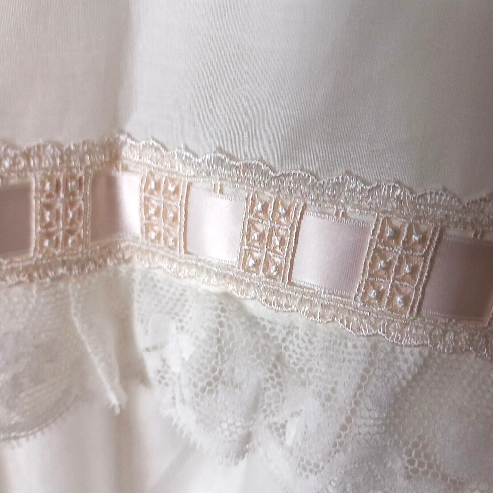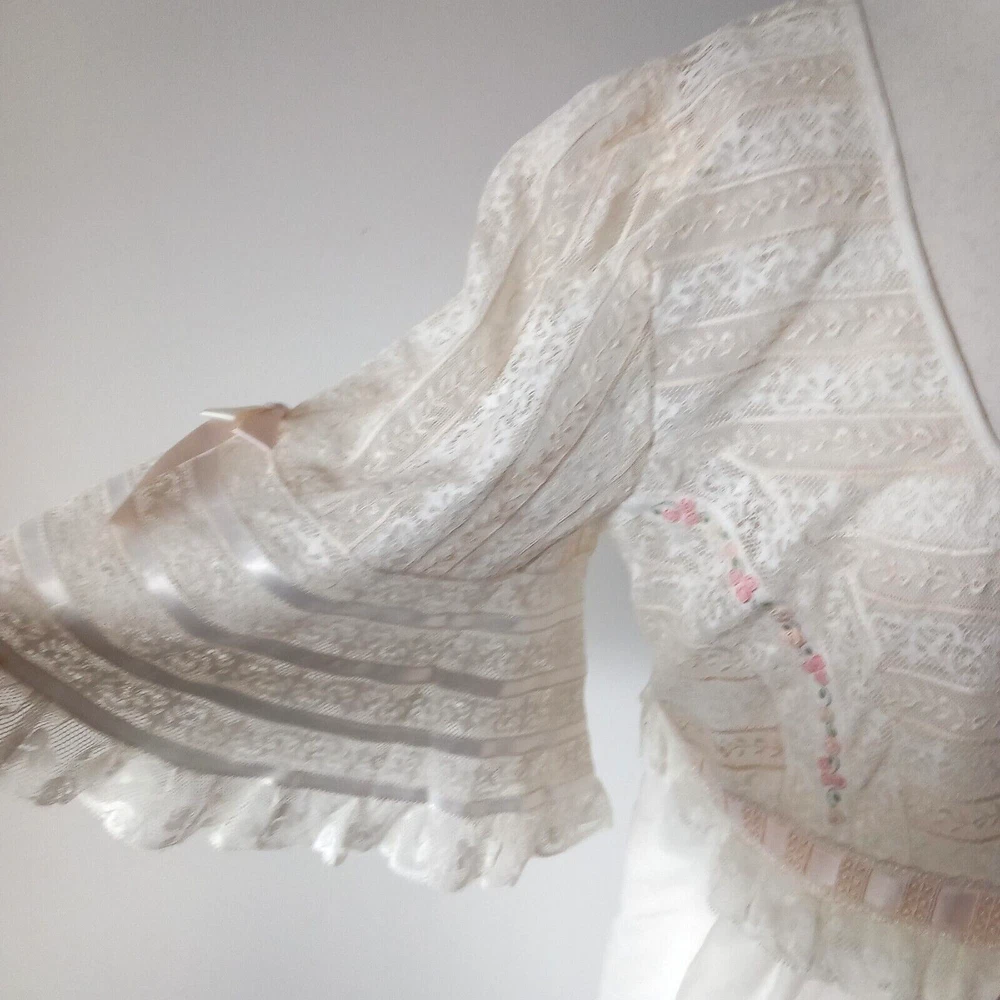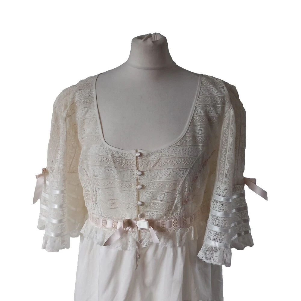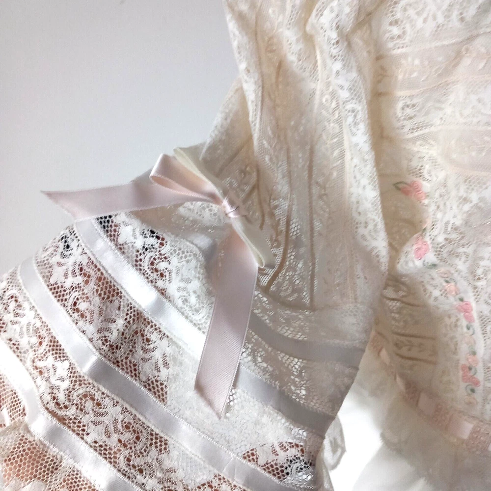 New old Stock amazing night dress long length in 100% cotton with ribbon, lace and tiny roses embroidered at the bust with satin covered buttons to the front. Make is Roberta LASSI and its made in Italy. Measures 22" pit to pit, 19" across the underbust waist area, 28" across hip area approx. Length nape to hem 45".