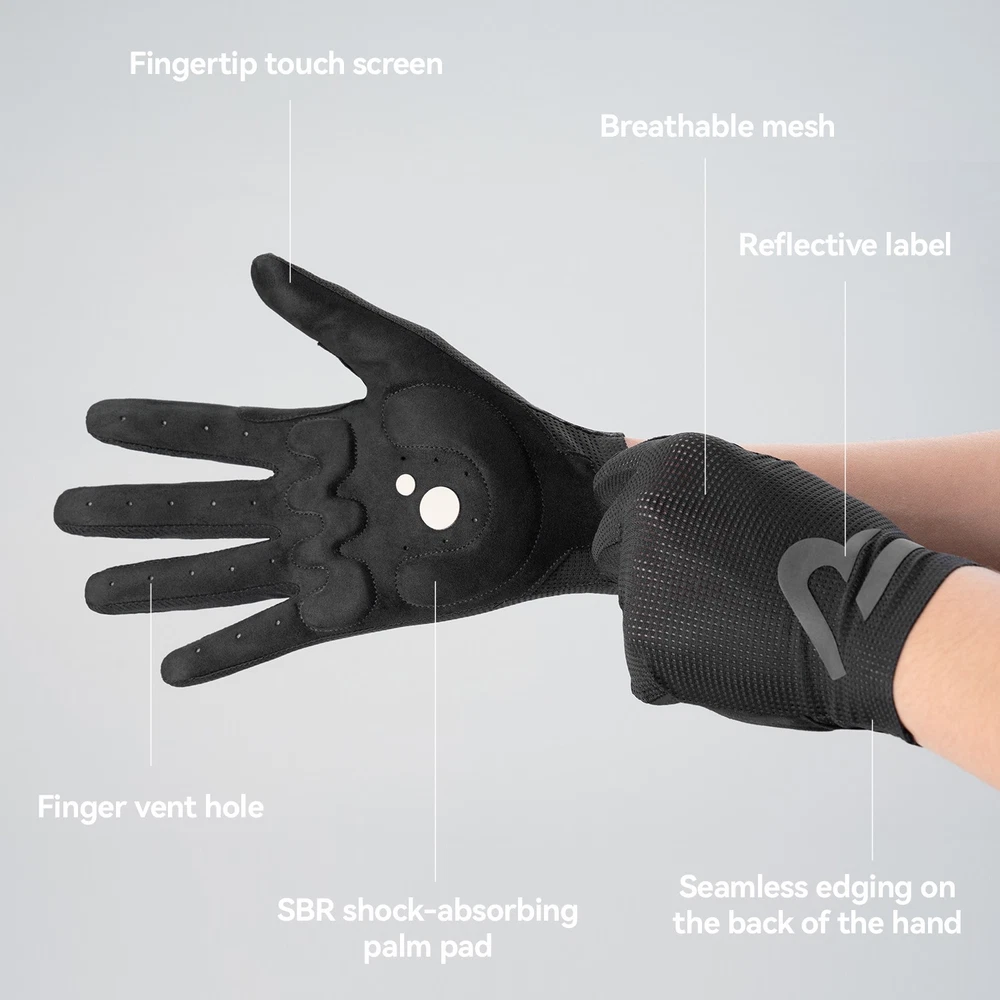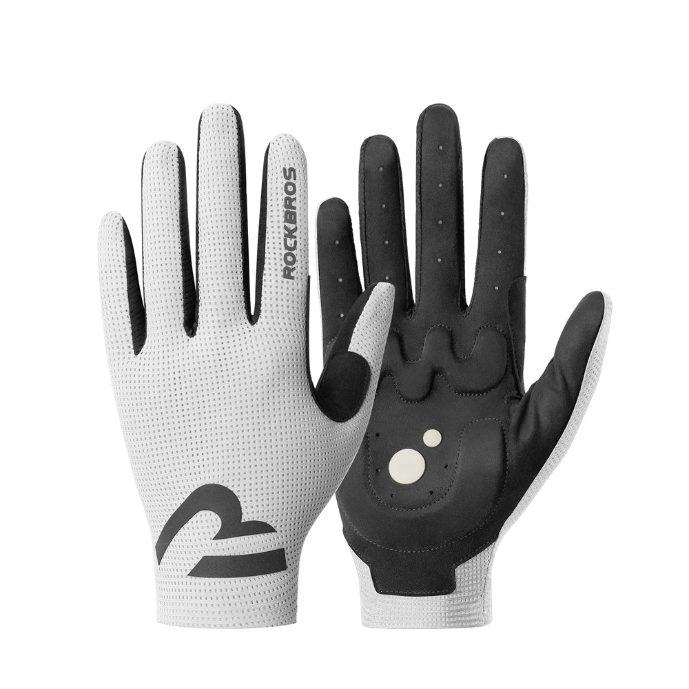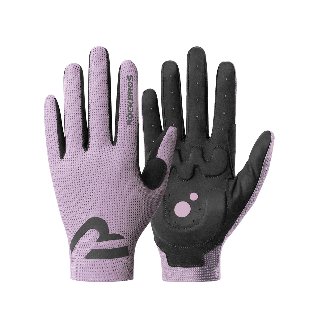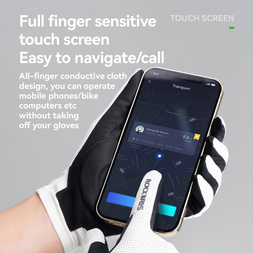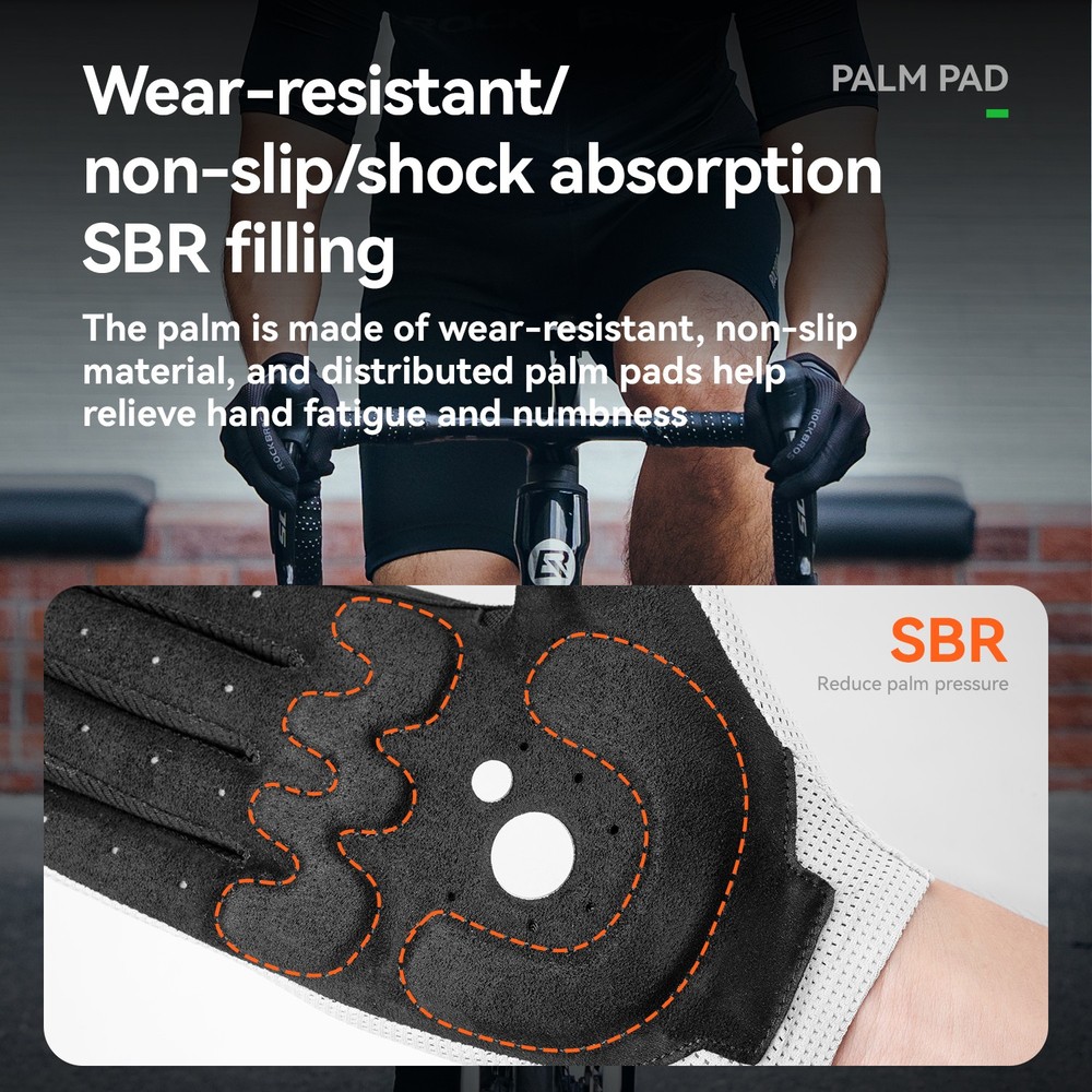 Brand:ROCKBROS Product Name:Cycling Gloves Product Number:16110017 Material:Palm: Hand back: 88% polyester +12% spandex;Palm: 90% polyester +10% spandex; Color:Black/White/Purple/Beige Size:S/M/L/XL/XXL Weight:≈30g±3g(M Size) Product Feature SBR filling,Wear-resistant/non-slip/shock absorption; Full finger sensitive touch screen,Easy to navigate/call; Finger vent hole,Heat dissipation; Seamless edging,Reduce friction; Reflective at night,Safety warning;