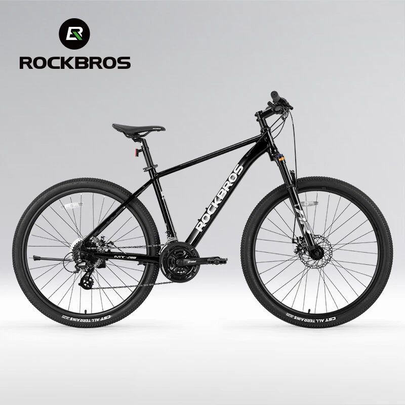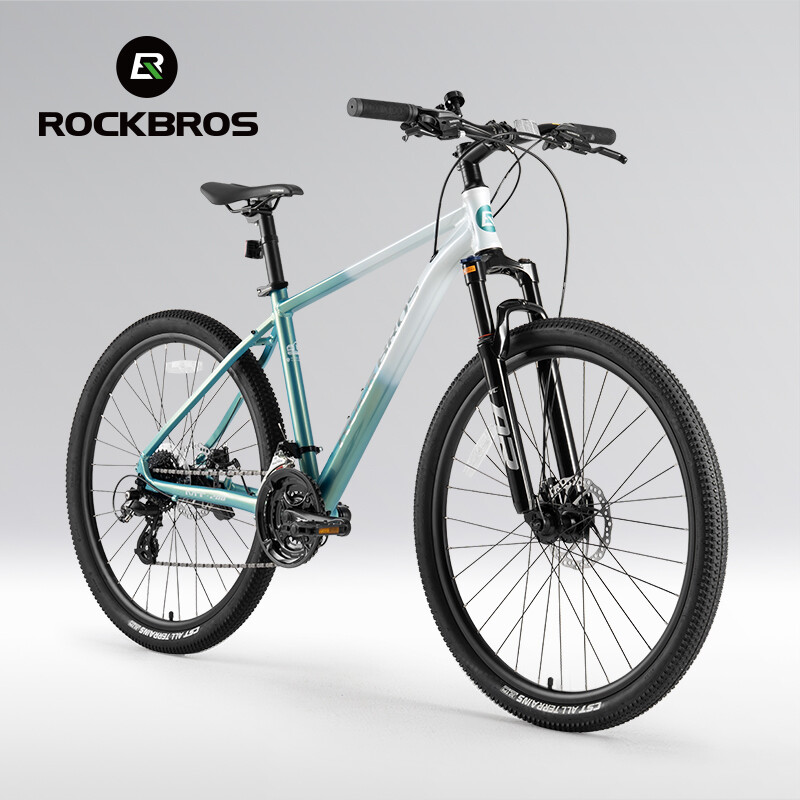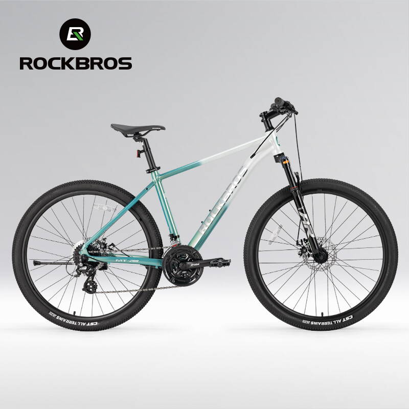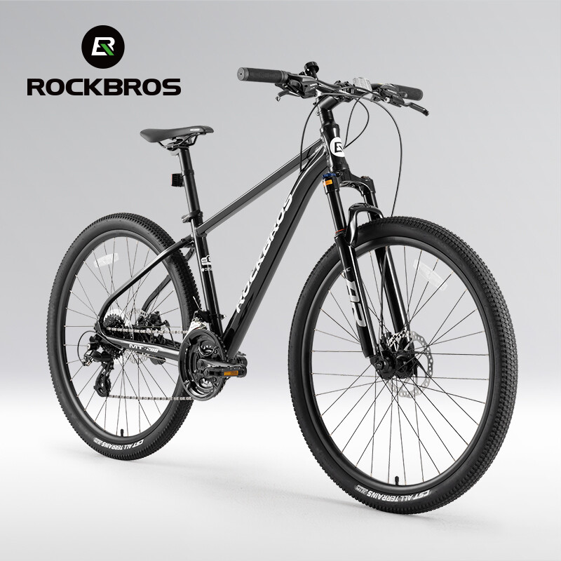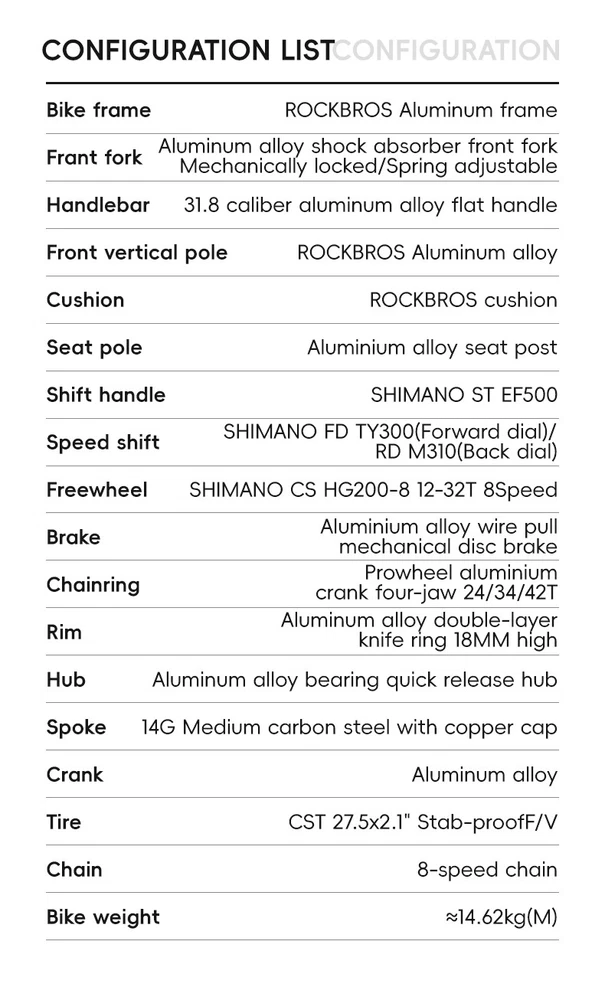 Bike frame: ROCKBROS Aluminum frame Front Fork: Aluminum alloy shock absorber Front fork, Mechanically locked/Spring adjustable Handlebar:31.8 caliber aluminum alloy flat handle Front vertical pole: ROCKBROS Aluminum alloy Cushion: ROCKBROS cushion Seat pole: Aluminium alloy seat post Shift handle: SHIMANO ST EF500 Speed shift: SHIMANO FD TY300(Forward dial)/RD M310(Back dial) Freewheel: : SHIMANO CS HG200-8 12-32T 8 Speed Brake: Aluminium alloy wire pull mechanical disc brake Chainring: Prowheel aluminium crank four-jaw 24/34/42T Rim: Aluminum alloy double-layer knife ring 18MM high Hub: Aluminum alloy bearing quick release hub Spoke:14G Medium carbon steel with copper cap Crank: Aluminum alloy Tire: CST 27.5x2.1" Stab-proof F/V Chain: 8-speed chain Bike weight: about 4.62kg(M) Frame size 16''(S) 18''(M) 21''(L) suitable height 160-175CM 170-185CM 175-198CM recommended weight Within 100KG Within 100KG Within 100KG body length 170cm 170cm 170cm handlebar height 100cm 100cm 100cm handlebar width 61cm 63cm 65cm handlebar length 7cm 8cm 9cm Note: Due to different measurement tools and methods, the data will be slightly different. The specific detailed dimensions are subject to the actual product. Lockable shock absorber – Easily switch between city and off-road modes by locking or unlocking the shock absorber to adapt to various terrains. 24-speed Shimano shifting system – Provides smooth and accurate gear changes for both steep climbs and fast descents. Lightweight aluminum alloy frame – Built for strength and durability, the frame reduces rider fatigue while offering enhanced stability. 27.5-inch large wheel diameter – Ensures a smoother ride over gravel and obstacles, reducing bumps and minimizing side-slipping. CST non-slip tires – High-quality, wear-resistant rubber tires with excellent grip, perfect for a variety of road conditions.