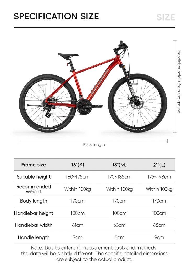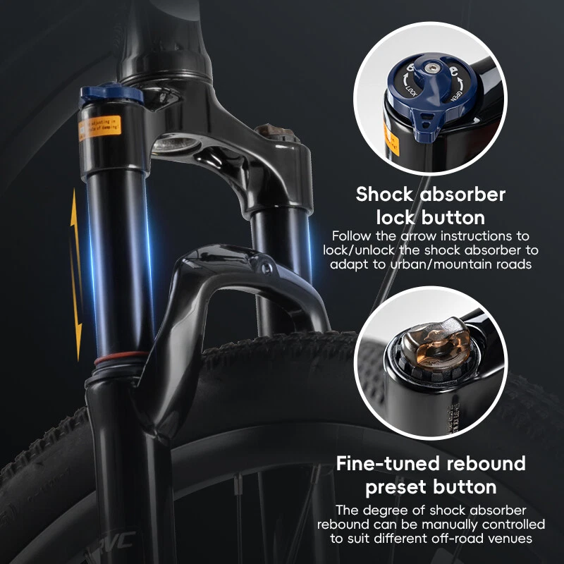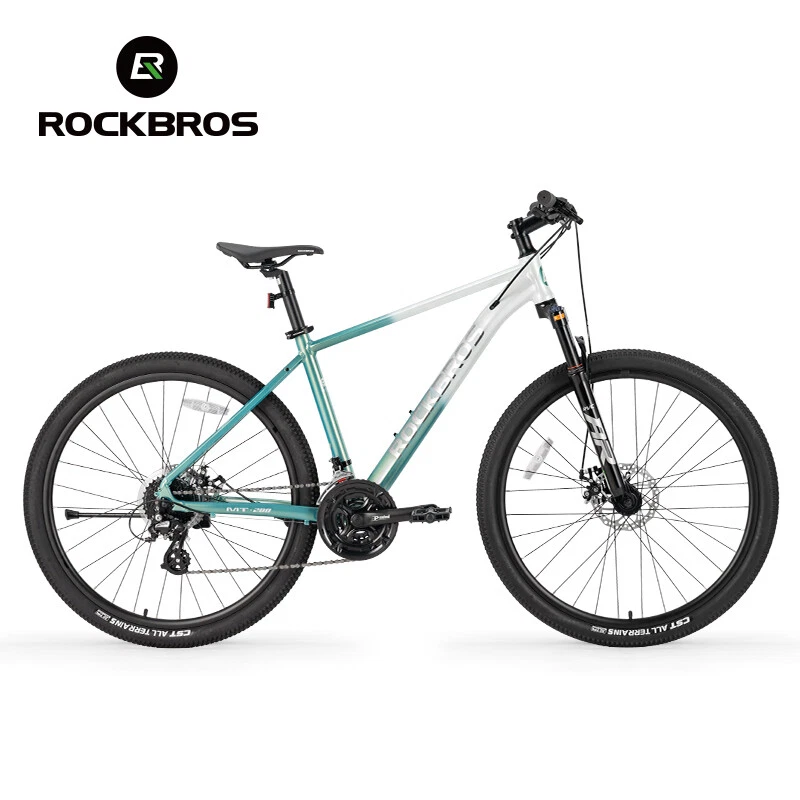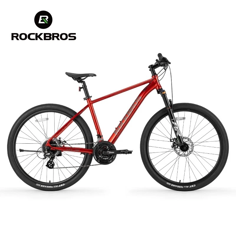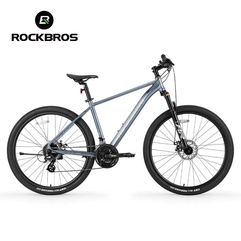 Bike frame: ROCKBROS Aluminum frame Front Fork: Aluminum alloy shock absorber Front fork, Mechanically locked/Spring adjustable Handlebar:31.8 caliber aluminum alloy flat handle Front vertical pole: ROCKBROS Aluminum alloy Cushion: ROCKBROS cushion Seat pole: Aluminium alloy seat post Shift handle: SHIMANO ST EF500 Speed shift: SHIMANO FD TY300(Forward dial)/RD M310(Back dial) Freewheel: : SHIMANO CS HG200-8 12-32T 8 Speed Brake: Aluminium alloy wire pull mechanical disc brake Chainring: Prowheel aluminium crank four-jaw 24/34/42T Rim: Aluminum alloy double-layer knife ring 18MM high Hub: Aluminum alloy bearing quick release hub Spoke:14G Medium carbon steel with copper cap Crank: Aluminum alloy Tire: CST 27.5x2.1" Stab-proof F/V Chain: 8-speed chain Bike weight: about 4.62kg(M) Frame size 16''(S) 18''(M) 21''(L) suitable height 160-175CM 170-185CM 175-198CM recommended weight Within 100KG Within 100KG Within 100KG body length 170cm 170cm 170cm handlebar height 100cm 100cm 100cm handlebar width 61cm 63cm 65cm handlebar length 7cm 8cm 9cm Note: Due to different measurement tools and methods, the data will be slightly different. The specific detailed dimensions are subject to the actual product. Lockable shock absorber – Easily switch between city and off-road modes by locking or unlocking the shock absorber to adapt to various terrains. 24-speed Shimano shifting system – Provides smooth and accurate gear changes for both steep climbs and fast descents. Lightweight aluminum alloy frame – Built for strength and durability, the frame reduces rider fatigue while offering enhanced stability. 27.5-inch large wheel diameter – Ensures a smoother ride over gravel and obstacles, reducing bumps and minimizing side-slipping. CST non-slip tires – High-quality, wear-resistant rubber tires with excellent grip, perfect for a variety of road conditions.