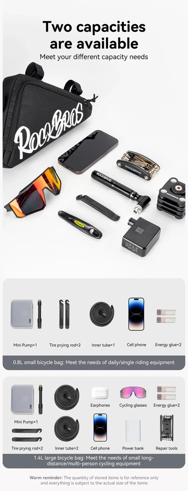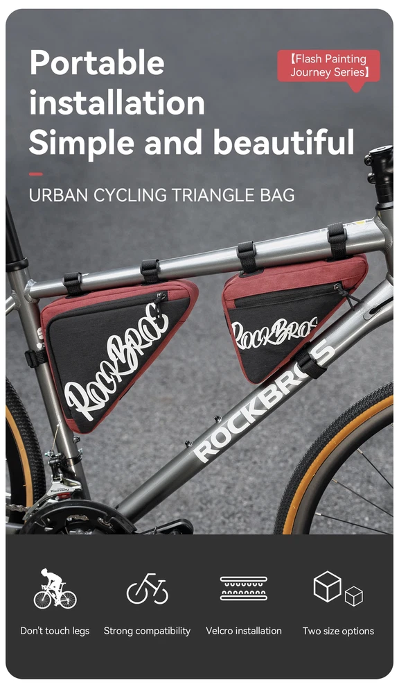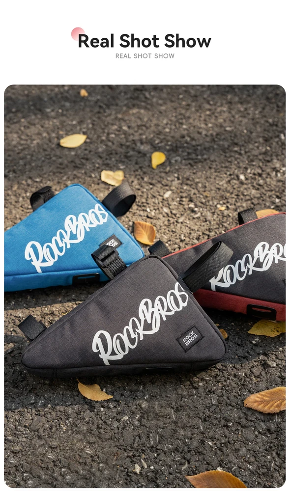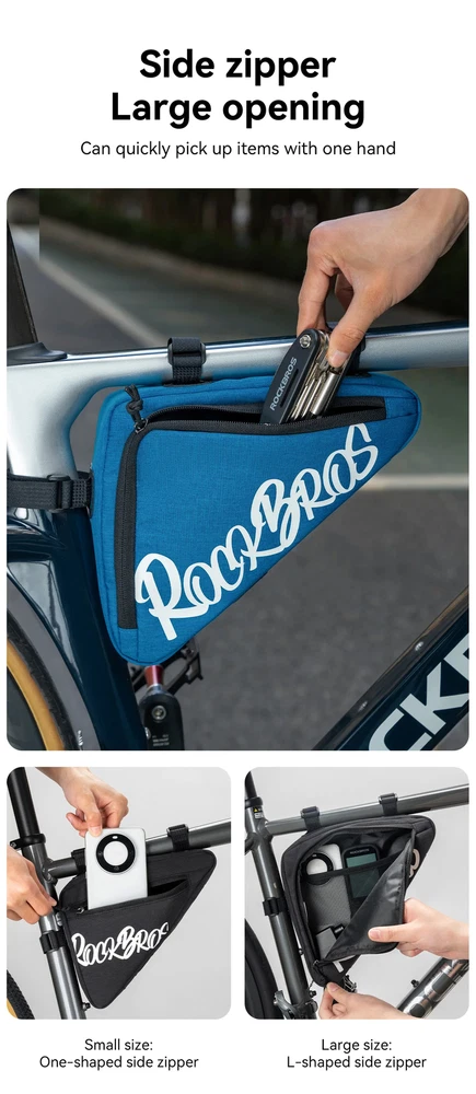 Sport/Activity:CyclingFeatures:High Visibility, Lightweight, Softshell, WaterproofType:Frame BagNumber of Pockets:1Material:PolyesterBrand:RockBrosPosition:FrameSize:MediumCapacity:0.8 L / 1.4 LClosure:ZipCompatible With:All Mountain Bike