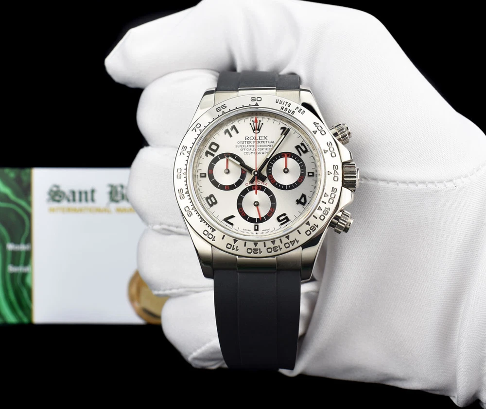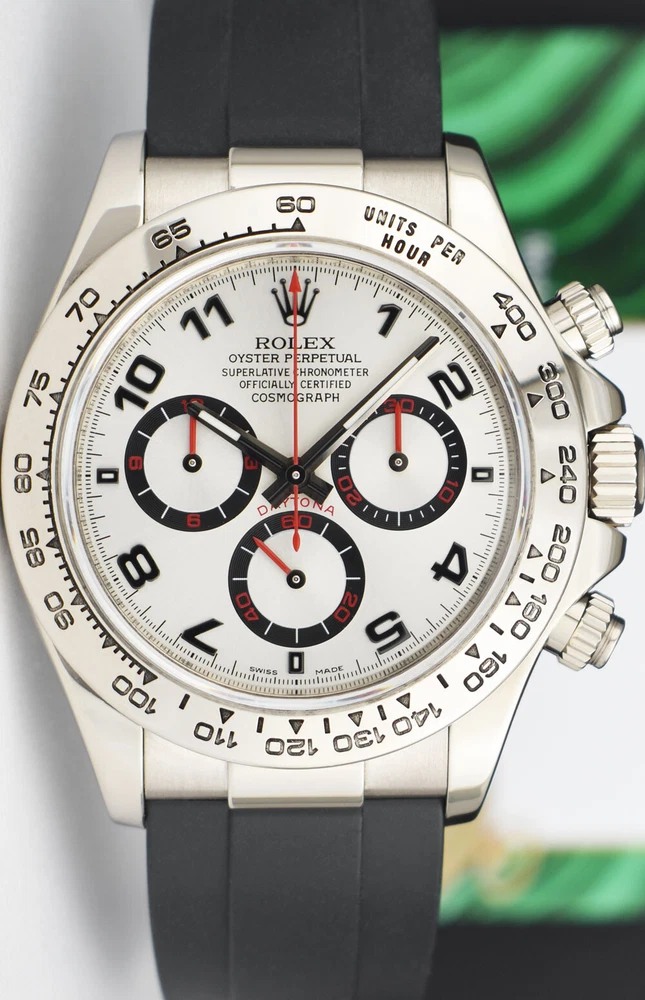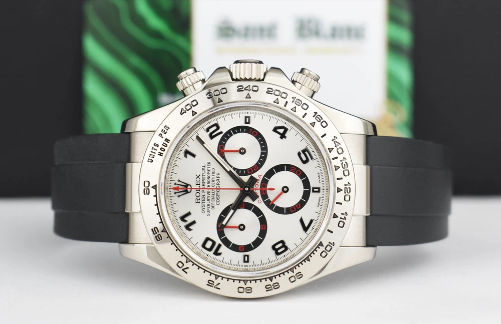ROLEX - 18kt White Gold Daytona - Silver Dial - Model 116519 Authentic Rolex ROLEX - Factory Silver Arabic Dial ROLEX - Men's 18kt White Gold Daytona ROLEX - Men's 40mm Cosmograph Daytona Timepiece Details Absolutely Stunning brilliant Rolex Factory Silver Arabic Dial! This is the 40mm size 18kt White Gold Rolex Daytona model 116519: This is the style with rubber strap. This Rolex is in pristine condition...Priced to sell immediately! Comes with genuine Rolex presentation boxes, Rolex books, Rolex tag, Retail Appraisal And The Sant Blanc Three Year Warranty!...In pristine condition...The Perfect Gift! This Rolex is authentic and stunning. Unconditionally guaranteed to be authentic Rolex. "Please serious bidders only." I have set the reserve well below the current value placed on this timepiece. SANT BLANC is a Swiss watch and timepiece specialist and not a Rolex dealer and have no affiliation with Rolex Watch USA. This Rolex timepiece is unconditionally guaranteed to be authentic. We are the sole warrantors of this timepiece. For questions please contact SANT BLANC. Authentic Rolex. It does not get any better than this! Pictures do not reveal the radiant beauty of this timepiece. This Rolex is authentic and stunning. Unconditionally guaranteed to be authentic Rolex. Returns & exchanges accepted. Returns for refund are accepted.. I have set the reserve well below the current value placed on this timepiece. I am a Swiss Timepiece Specialist and not a Rolex dealer and have no affiliation with Rolex Watch USA. This Rolex timepiece is unconditionally guaranteed to be authentic. No factory warranty attached. We are the sole warrantors of this timepiece. For questions please contact SANT BLANC. Payment must be received within 5 days of the end of the auction Payment Information The winning bidder must contact us within 2 days and payment must be received within 5 days of the close of this auction. If you you are unable to complete payment within 5 days, you must contact us immediately by contact SANT BLANC . Guarantee This article meets or exceeds the demanding standards and specifications set by Sant Blanc. This item is authentic and genuine in pristine condition, functions properly and accurately and comes with a full seven day return money back guaranty. We are not responsible for photography and description errors and omissions in this auction. Changes and modifications to this description may be made at any time, and for any reason with out notice. This auction may be ended at anytime without notice. Warranty SANT BLANC warranty is for a full three years. The dependable operation of this article for a period of three years from the date of purchase. Modification, tampering and abuse void warranty. SANT BLANC is the sole warrantor of this article, the factory warranty no longer apply. SANT BLANC Service & Warranty Division and The SANT BLANC Service Center, services and repairs Swiss Made watches and timepieces. The SANT BLANC Service and Warranty Division has over 30 years experience as Swiss Timepiece specialist factory trained and certified "Watchmaker". The credentials include AWCI CW21 certified as one of the world's leading watchmaker. Our watchmaker is a certified graduate watchmaker with continuing Swiss Watch education including training from the Rolex Dallas Training Facility. Sant Blanc is dedicated to setting the highest standards in Swiss Timepiece excellence. We have a complete Swiss watch service center. We do our own in-house photography, and research. Please contact us if we can be of service to you. Shipping Information FedEx/UPS shipping is included.. This item is professionally packaged and shipped fully insured, adult signature required at delivery. We ship via FedEx, UPS, Brinks, Private Courier and United States Express Mail. Items are typically shipped within two business days of receipt of payment. You will be notified when your item has been shipped. We are not responsible for shipping and/or delivery delays resulting from acts of nature, theft, strikes, or shipping company errors affecting the shipment and/or delivery. This shipment is fully insured.. We ship world-wide fully insured by: UPS, FEDEX, BRINKS, Private Courier, and United States Express Mail. ATTENTION International Customers. NOTICE: International shipments are shipped at the customers risk to shipping delays, international and national regulations, Customs fees, taxation, and damage due to and/or resulting from shipping. We are not responsible for shipping delays, damage, theft, acts of nature affecting the shipment, Customs duties, fees, taxation or regulatory import restrictions . This disclaimer applies only to shipments outside the United States, and does not apply to shipments within the United States. Arrangements must be made for delivery to PO boxes. Provide a physical address, and contact contact SANT BLANC through eBay through eBay number with your payment. If payment is made by PayPal, and your shipping address is different than your confirmed address in PayPal, you must contact us directly to let us know of the requested change. Address change approval will be sent to you, otherwise this item will be sent to your confirmed PayPal address. About Sant Blanc SANT BLANC is a Swiss Timepiece Specialist Company, located in Branson Missouri USA. The Sant Blanc Service Center is a state of the art service facility, servicing all Swiss Made watches and is open to our customers by appointment. The Sant Blanc Sale Division specializes in offering the finest Swiss Made Timepieces. Notice: SANT BLANC is not an official nor an authorized dealer for any product offered or sold and SANT BLANC has no affiliation with the manufacturer. All brand names and trademarks are the property of their respective owners and are used for identification purposes only. SANT BLANC is the sole warrantor. the factory warranty no longer apply. Rolex is a registered trademark of Rolex Watch USA Inc. SANT BLANC is not affili