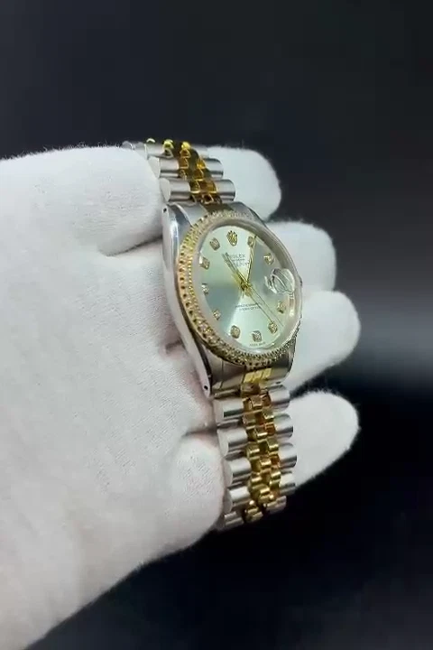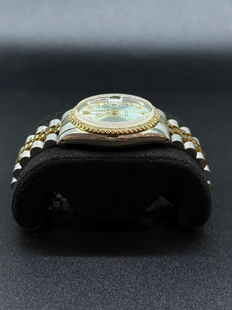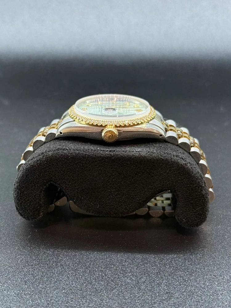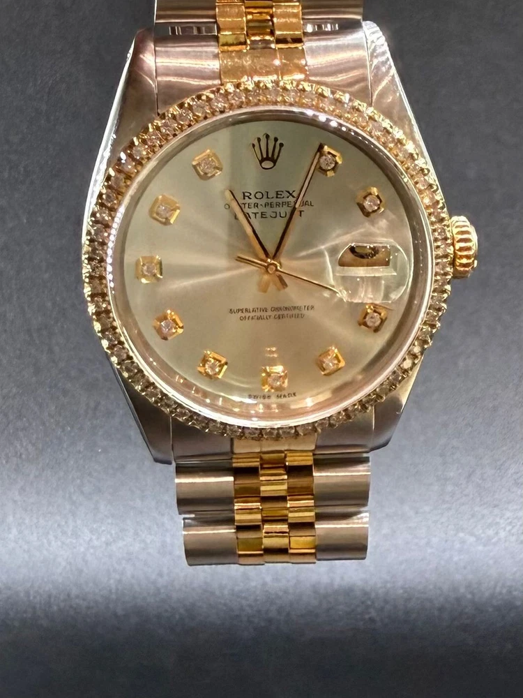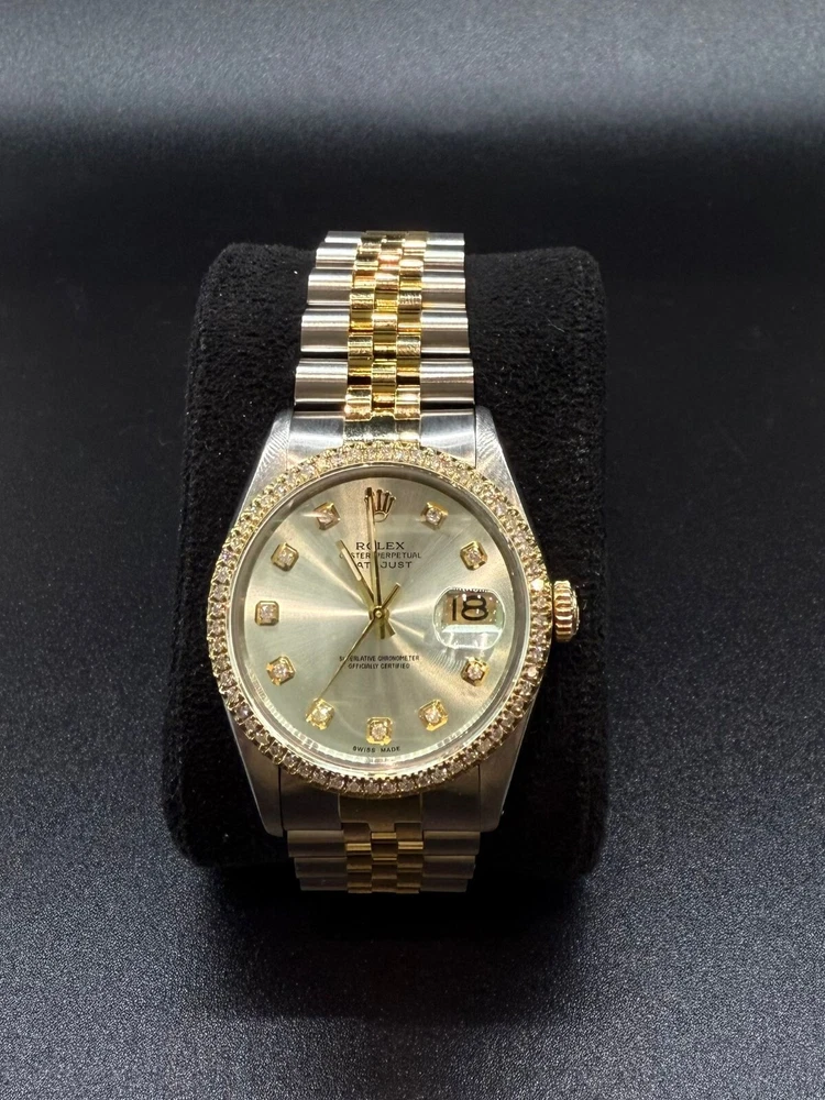 Rolex Date Just 36mm, 16013 Custom Silver Diamond Jubilee Custom 1.5ct Diamond, Aftermarket Dial, Bracelet and Bezel. The Rolex 16013 is a vintage watch model from Rolex's Date Just series that was produced from the late 1970s to the early 1990s. It is a popular and highly sought after watch model among collectors and enthusiasts. The Rolex 16013 features a 36mm case made of stainless steel. The Rolex 16013 is powered by a self-winding movement with a power reserve of approximately 48 hours. One of the unique features of the Rolex 16013 is its two-tone design and quickset feature. This 2tones combination creates a versatile and timeless look that can be worn for both formal and casual occasions. The Quickset feature is achieved through a mechanism that allows the user to change the date by simply pulling out the winding crown to the second position and turning it in a clockwise or counterclockwise direction. This causes a quick-change mechanism to engage, allowing the wearer to advance the date forward or backward by one day. Before the introduction of Quickset, Rolex watches required the wearer to rotate the hands through a full 24 hours to adjust the date, which could be time-consuming and potentially damaging to the movement if done repeatedly. The Quickset feature is a valuable addition to Rolex watches, as it allows for easy and efficient date adjustment, making the watch more convenient and user-friendly. Today, most modern Rolex watches come equipped with the Quickset feature. This Beautiful Watch Comes Fully Serviced, Time-Tested, Air/Water Pressure Tested with aftermarket Rolex Watch Box & Watch Appraisal Included from Seller. Comes to fit 7.5 Inch But Can Accommodate Larger or Smaller Upon Request.