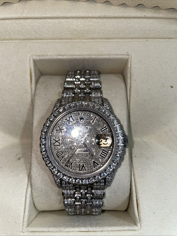 This is a genuine Rolex Datejust wristwatch with a silver bracelet and a 36mm round silver case. The watch features a diamond pattern on a black dial with Roman numerals and diamond markers as indices. It has a solid case and a water resistance of up to 160 meters. The watch is customized with 10-15ct of natural diamonds. but does not come with papers but has the original box/packaging. The watch was manufactured in Switzerland between 1980-1989 and has a stylish and luxurious design, perfect for dress/formal occasions or as a celebrity accessory.