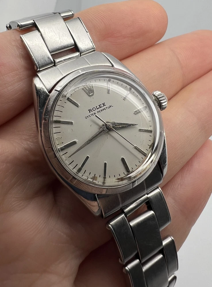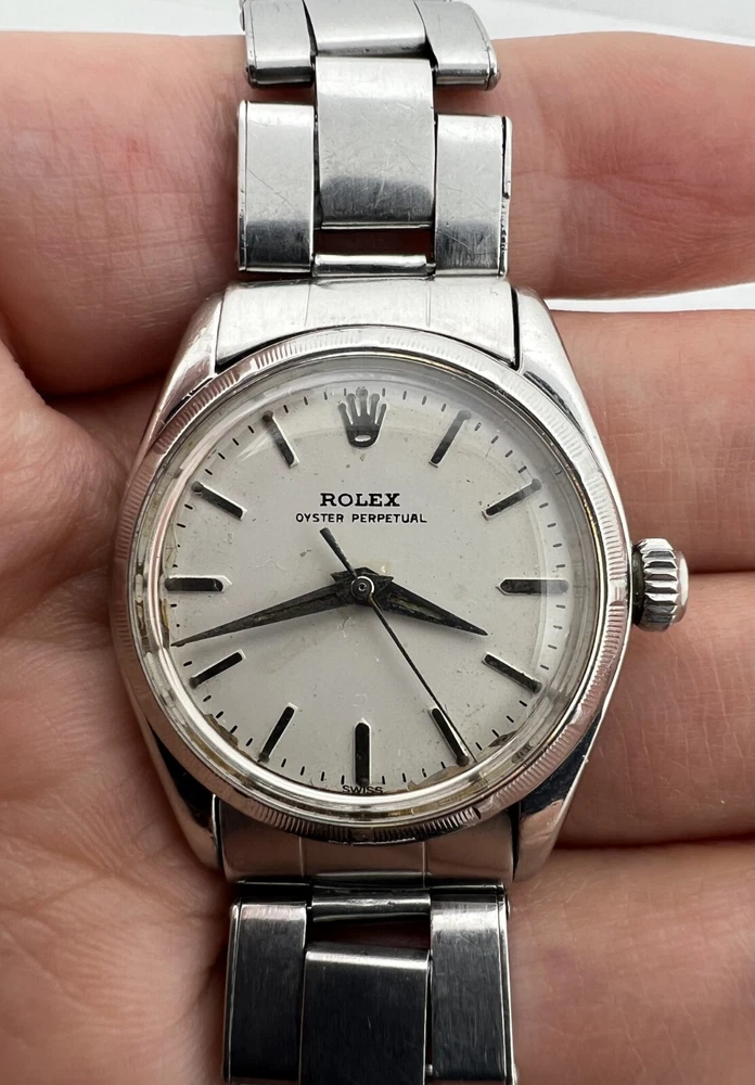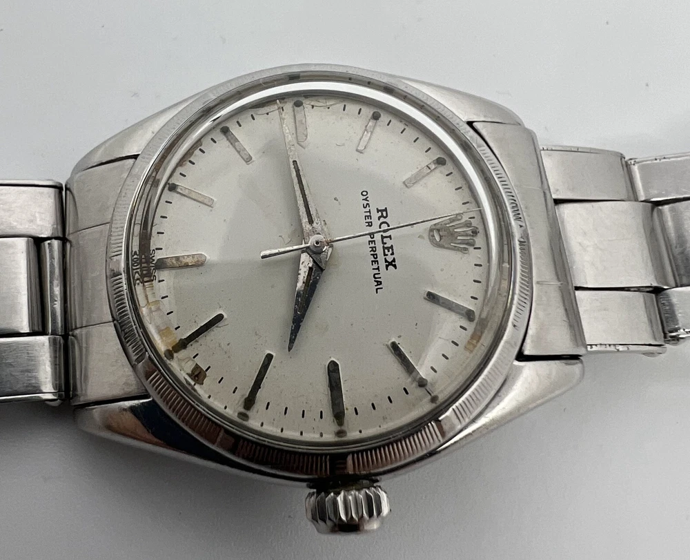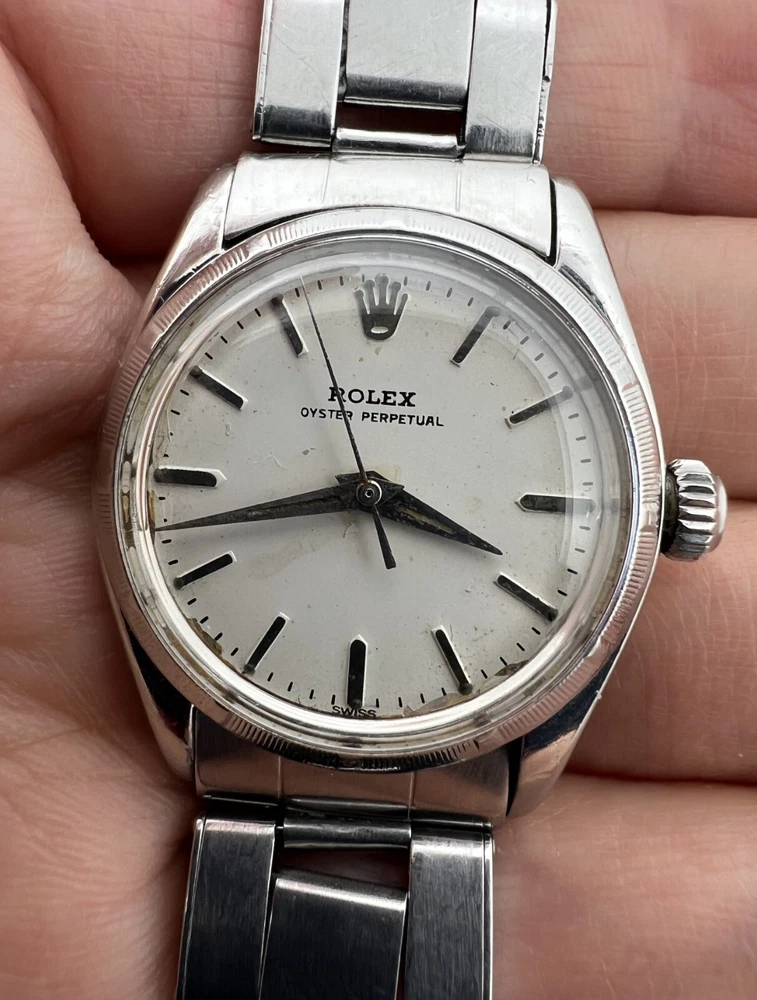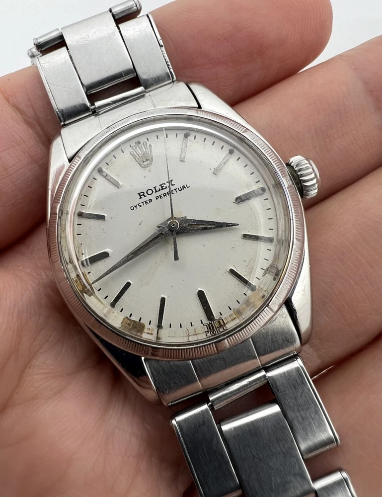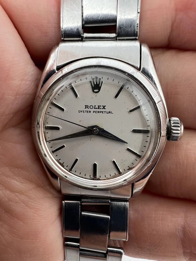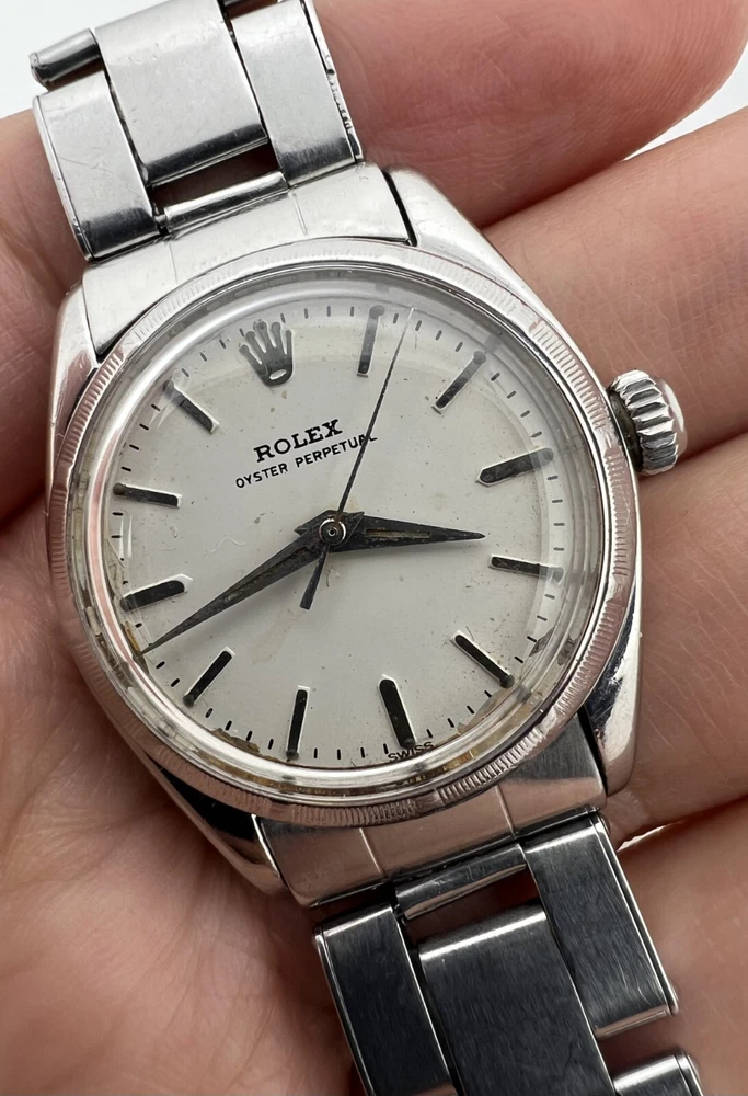 ROLEX OYSTER PERPETUAL AUTOMATIC BUTTERFLY ROTOR REF 6549 CALIBER 1130 G. FRERES BANDS WATCH 30mm THE WATCH IS IN VERY GOOD CONDITION LIKE YOU SEE THE PHOTOS AND KEEP THE TIME VERY WELL. THE DIAL IS IN GOOD CONDITION. IT HAS TINY DAMAGES AT THE CHAPTER RING INSIDE AS YOU CAN SEE FROM THE PHOTOS. THIS WATCH IS VINTAGE FROM 1958. THE MOVEMENT IS AUTOMATIC BUTTERFLY ROTOR CALIBER 1130 IN VERY GOOD CONDITION LIKE YOU SEE THE PHOTO THE CRYSTAL IS PLASTIC IN VERY GOOD CONDITION THE CROWN IS ORIGINAL IN VERY GOOD CONDITION LIKE YOU SEE THE PHOTO THE CASE IS S.STEEL IN VERY GOOD CONDITION. IT IS 30 mm WITHOUT CROWN AND 34 mm with crown.IT HAS TINY SCRATCHES AS NORMAL USE. THE BANDS ARE ORIGINAL AND THEY ARE VERY RARE FOR COLLECTORS .THEY ARE WITH SIGN G .F. BANDS AND THEY ARE IN GREAT CONDITION LIKE YOU SEE THE PHOTOS.THE BANDS ARE MEDIUM SIZE FOR YOUNG LADYS IT HAS TINY SCRATCHES AS NORMAL USE. I SELL AS IT IS IN THE PHOTO THANK YOU