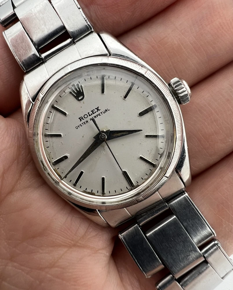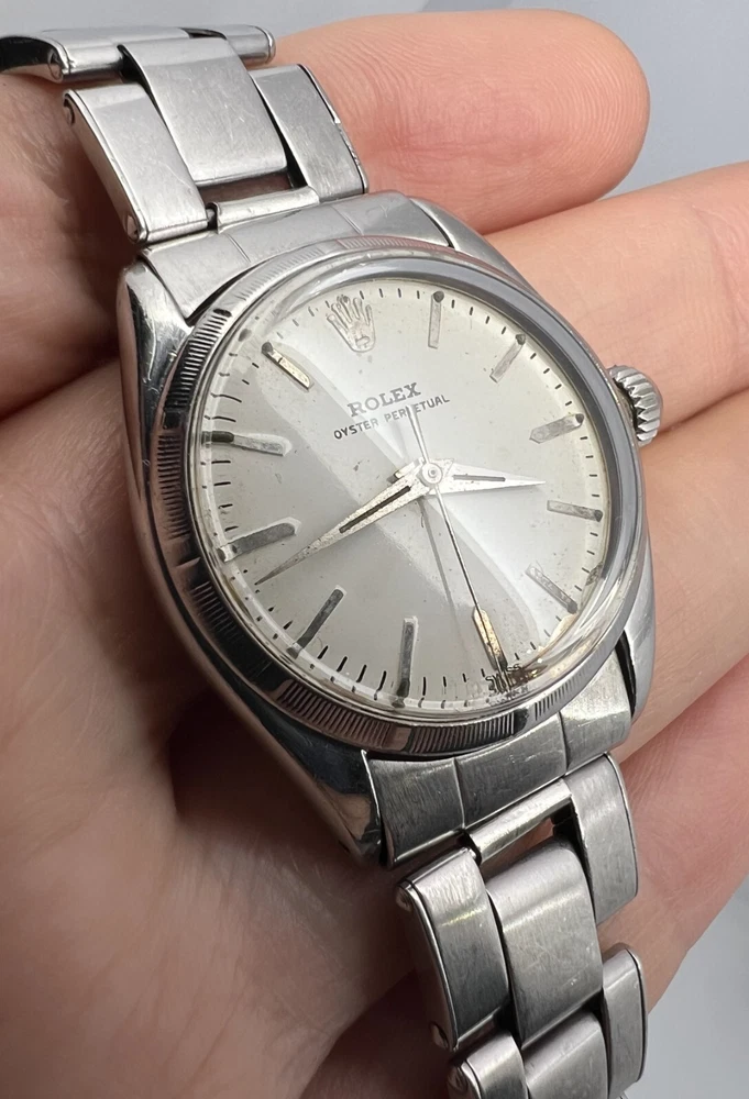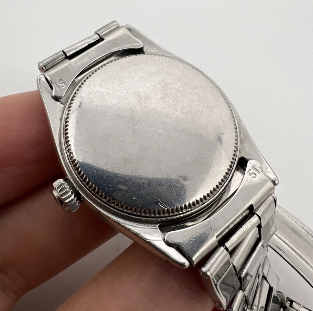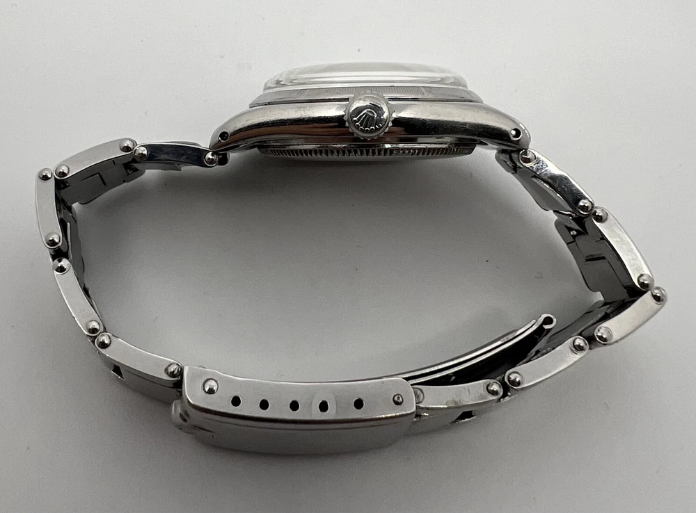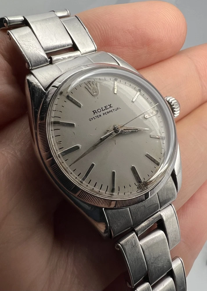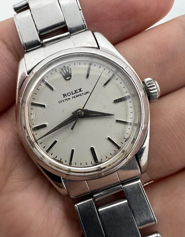 ROLEX OYSTER PERPETUAL AUTOMATIC BUTTERFLY ROTOR REF 6549 CALIBER 1130 G. FRERES BANDS WATCH 30mm THE WATCH IS IN VERY GOOD CONDITION LIKE YOU SEE THE PHOTOS AND KEEP THE TIME VERY WELL. THE DIAL IS IN GOOD CONDITION. IT HAS TINY DAMAGES AT THE CHAPTER RING INSIDE AS YOU CAN SEE FROM THE PHOTOS. THIS WATCH IS VINTAGE FROM 1958. THE MOVEMENT IS AUTOMATIC BUTTERFLY ROTOR CALIBER 1130 IN VERY GOOD CONDITION LIKE YOU SEE THE PHOTO THE CRYSTAL IS PLASTIC IN VERY GOOD CONDITION THE CROWN IS ORIGINAL IN VERY GOOD CONDITION LIKE YOU SEE THE PHOTO THE CASE IS S.STEEL IN VERY GOOD CONDITION. IT IS 30 mm WITHOUT CROWN AND 34 mm with crown.IT HAS TINY SCRATCHES AS NORMAL USE. THE BANDS ARE ORIGINAL AND THEY ARE VERY RARE FOR COLLECTORS .THEY ARE WITH SIGN G .F. BANDS AND THEY ARE IN GREAT CONDITION LIKE YOU SEE THE PHOTOS.THE BANDS ARE MEDIUM SIZE FOR YOUNG LADYS IT HAS TINY SCRATCHES AS NORMAL USE. I SELL AS IT IS IN THE PHOTO THANK YOU