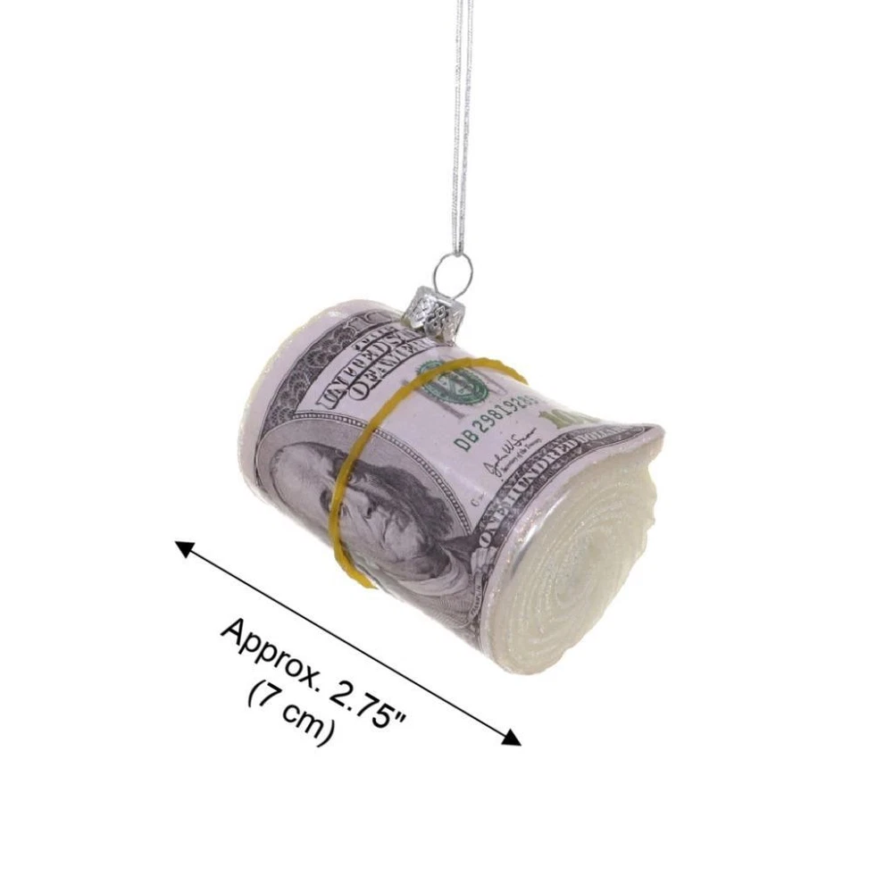 ROLL OF CASH CHRISTMAS TREE ORNAMENT 2.75" Glass Funny Wad of Money Gag Gift