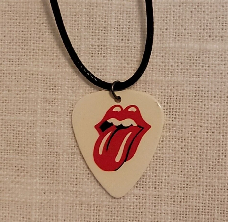 NEW ROLLING STONES GUITAR PICK ON 18" LEATHER CORD NECKLACE WITH LOBSTER CLAW CLOSURE CHECK OUT OUR EBAY STORE FOR MORE GREAT BAND AND MUSIC THEMED GIFTS AND ACCESSORIES