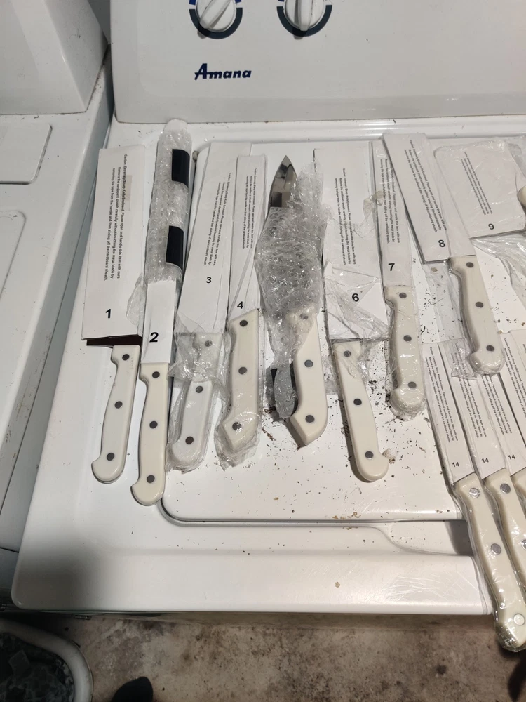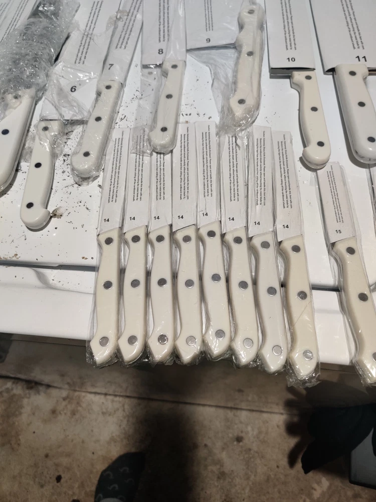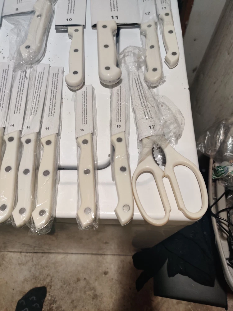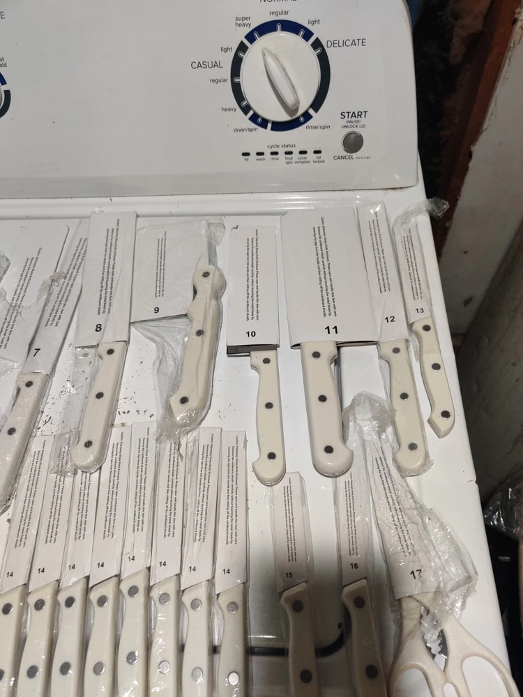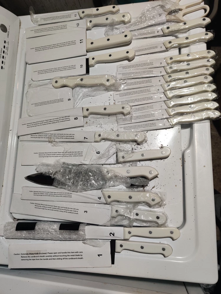 Color:WhiteBlade Edge:StraightCustom Bundle:NoBrand:Ronco Showtime Six StarMPN:Does Not ApplyFeatures:Dishwasher Safe, Reusable, Easy CleanBlade Length:variousHandle Material:Stainless SteelSet Includes:Fillet & Larding KnivesNumber of Items in Set:24Country/Region of Manufacture:ChinaFood Compatibility:MeatModel:#3Type:Fillet & Larding KnivesBundle Description:NoneUPC:Does not applyMaterial:Stainless Steelgtin13:Does not apply
