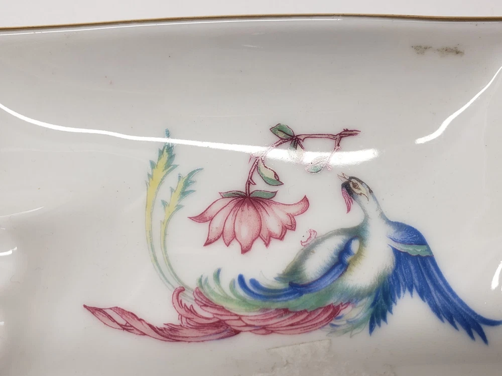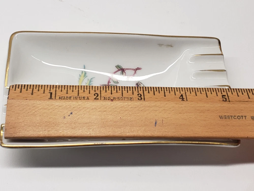 This Rosenthal porcelain ashtray is a beautiful piece featuring an ivory color with a gold rim, adorned with a floral and bird design. Its rectangle shape and vintage original production style make it a unique addition to any collection. The backstamp is printed and it was made in Germany, specifically in Kronach. The ashtray is perfect for those who appreciate fine porcelain and decorative pottery. It is a must-have item for collectors of Rosenthal brand pieces. Its history and origin make it a valuable item for those who appreciate the beauty of vintage and antique porcelain.