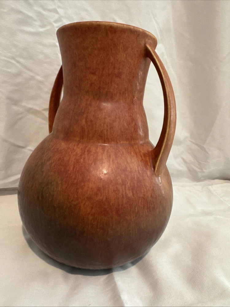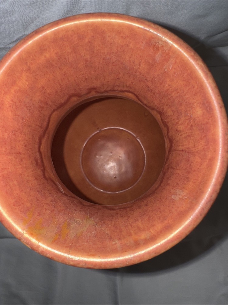 The ROSEVILLE-Windsor #528-9 Molted Rust Fern Vase from 1932 is a rare and beautiful piece of vintage American pottery. This 9" tall vase was produced in the United States using an arts and crafts/mission style design. This color and style are increasingly hard to find. The low luster finish adds to the unique charm of this original Roseville piece, making it a stunning addition to any decorative pottery or glassware collection. Estate fresh, no damage or alterations. This vase embodies the elegant style and craftsmanship of early 20th-century art pottery.