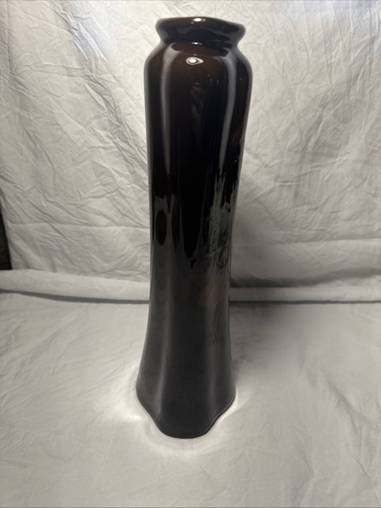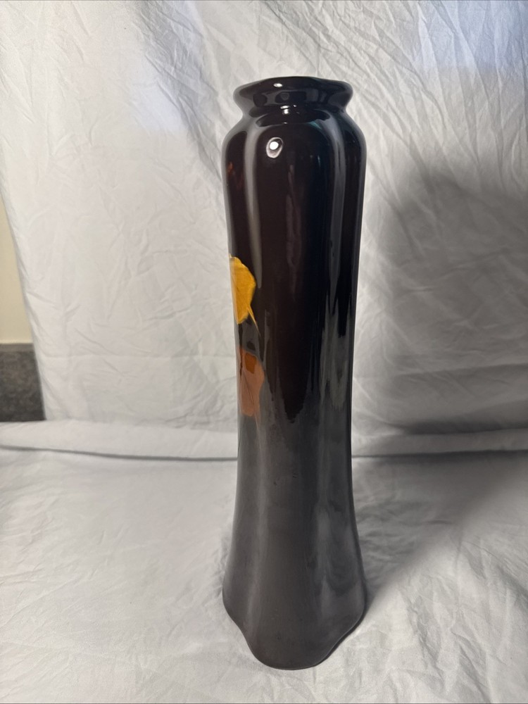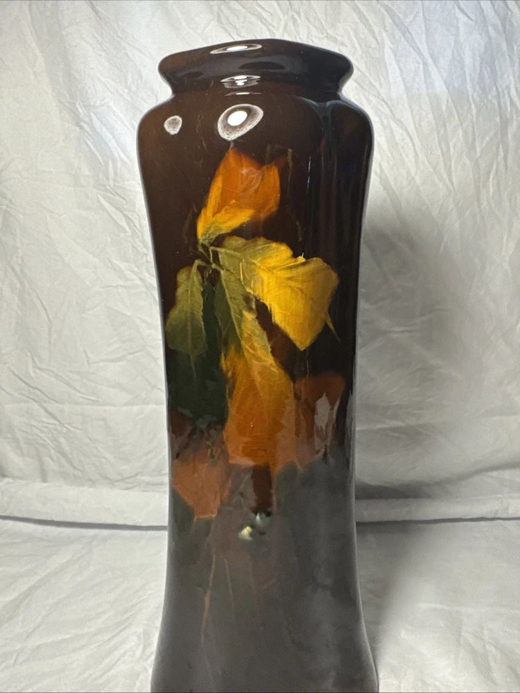 The ROSEVILLE Rozane Ware Royal 11' Floral Vase is an antique, vintage piece from the Arts & Crafts/Mission Style era. Made in the United States between 1900-1919, this decorative pottery vase features a brown color with an embossed stamp, showcasing intricate floral patterns to mimic classical oil paintings. Crafted with a lustrous finish, this original piece of pottery by Roseville is a unique addition to any collection of decorative pottery and glassware.
