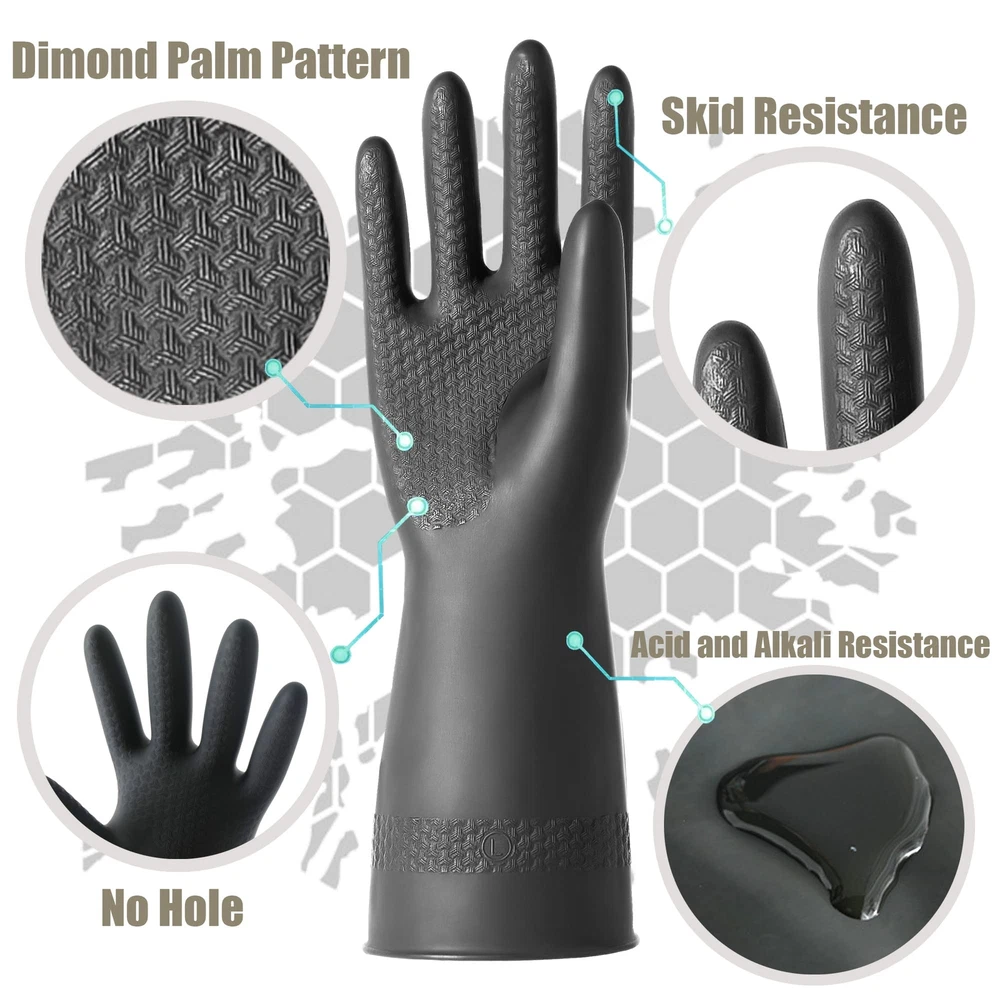 Size: Small 12" Medium 12.2'' Large 12.6'' X-Large 12.9'' SPECIFICATIONS - Size:Small,length 305mm/12",Width 95mm/3.75",Thickness 1.27mm/0.05". -Size:Meidum, length 310mm/12.2'',Width 110mm/4.3'',Thickness 1.27mm/0.05". - Size:Large,length 320mm/12.6",Width 115mm/4.53",Thickness 1.27mm/0.05". - Size:X-Large,length 330mm/12.9",Width 119mm/4.7",Thickness 1.27mm/0.05". -Material:High- grade Natural latex. -Color:Black. -Weight:(Small:80g)(Medium:90g)(Large:100g)(X-Large:110g). -Packing:1 pair glove in one Plastic bag. KEY FEATURES -Unique crimping design makes the sleeves firm and not easy to slide. MULTIPLE USES - Automotive:Protect hands when handling oily equipment. -Furniture Renovation:avoid direct contact between paint and hands to protect the skin of your hands. -Household Cleaning:A good helper for dishwashing, protect your hands from chemicals, and keep your hands dry and clean. -Yard Work:Protect your hands from injury and keep your hands clean. -Laboratory:resist acid, alkali, protect your hand when you use chemical. !!!ATTENTION: -In order to make the gloves more durable,please wash it with water after using and store it in a ventilated place after airing. -Cannot used to stab and cut. -Can not touch high temperatures, can not be burned with fire. Rubber has the advantages of elasticity, wear resistance, cold resistance, and air leakage Diamond pattern increases friction and has a better grip. It is flexible to handle small things and not easy to slip off when grasping objects. Our gloves can protect your hand from the corrosion of alkalis, alcohols, acetone. ect. No bad smell on your hand after using! Easy to take off after touching water. MULTIPLE USES- Ideal for chemical experiments, machinery manufacturing, farms, gardening, construction, automobile industry, gardens, yards, bathrooms, swimming pools, etc.