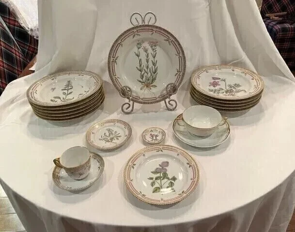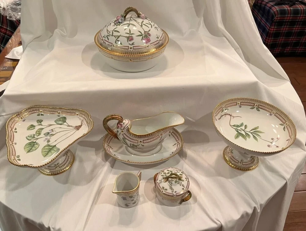 One of our good friends asked us to sell this beautiful Royal Copenhagen porcelain dinner set with Flora Danica pattern. The set is service for 12 including service pieces. Here is a list of what is included: 12 Dinner plates,12 salad plates, 12 bread plates, 12 butter plates, 12 soup bowls, 12 tea cups with saucers, 1 creamer, 1 sugar bowl. There is also, which is included, a covered tureen, 1 standing triangular plate, 1 round fruit plate, a 14.5 inch oval platter and one 18.5 inch oval platter. The Flora Danica design has just celebrated its 232 anniversary. Flora Danica is one of the world's most prestigious and luxurious porcelain collections. They still carefully make all there porcelain by hand. If you have any questions, please contact us and we will be glad to answer them for you. Settlement must be within 3 days after the end of this listing. Please contact us prior to purchase for payment and shipping information.