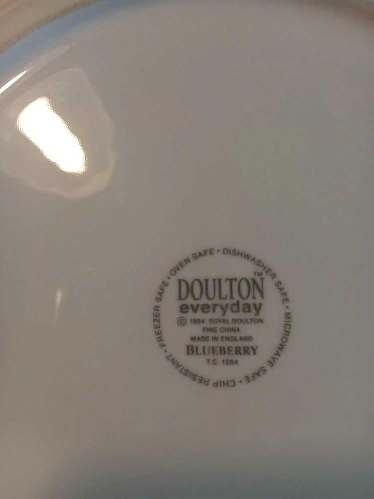 ROYAL DOULTON EVERYDAY BLUEBERRY FINE CHINA - PLATE 10.75 MADE IN ENGLAND-EUC FEATURES: · BRAND NAME:ROYAL DOULTON DESIGN: BLUEBERRY MEASUREMENT: 10.75 · CONDITION: PRE-OWNED - GUC! Disclaimer: We encourage open, honest communication to settle problems before choosing to leave negative or neutral feedback Payment: Payment is due within 4 days of the auction ending. Non-paying buyers will be notified via the dispute console. Payment is made via PAYPAL . *** Policy: Items are described and sold AS-IS. I make no intention to mislead the buyer in any way. If the item is not what you expected, items can be returned but only the auction cost will be returned. No exceptions!!! Shipping costs both ways are the sole responsibility of the buyer and the item must be returned in the exact condition as it was delivered. All items, new and used, are mainly from third parties, so any injuries or liabilities caused by using the items purchased are not my responsibility. Returns must be made within 1 week. Shipping methods: Items may be shipped via USPS, UPS, or FEDEX. Items are shipped no later than 1 day of payment unless it is paid on the weekend or just before the weekend. LOCAL PICK-UPS ARE ALWAYS WELCOMED!!!! Illinois buyers: Buyers from Illinois will be charged a 10% state tax Damages or Lost: For damaged items, please notify me ASAP. A claim will be filed, and if cleared by the shipping company , a refund will be issued ASAP. Claims take 3-7 weeks to clear so please be patient. In the event of a loss, items will be handled on a case to case basis. Contacting: Please ask any and all questions via “my messages” folder located in Ebay and NOT through my email address. I get over 400 emails a day so if it is sent to my inbox there may be a chance I might not read it. International and buyers outside contiguous 48 states: Hawaii, Alaska, Puerto Rico, APO addresses, or international buyers must contact me for a shipping quote. Flat Rate quote doesn’t apply to buyers in these locations. Items going to these areas will only be shipped via USPS PARCEL POST (4-6WKS). If USPS priority post is desired (1-2 weeks), additional funds will be incurred. *In the event of overcharging due to ebay’s shipping calculator, I will refund the difference if it is substantial. * Import duties are not included in the item price or shipping cost. These charges are the buyer's responsibility. Contact your local customs office regarding duties before bidding.