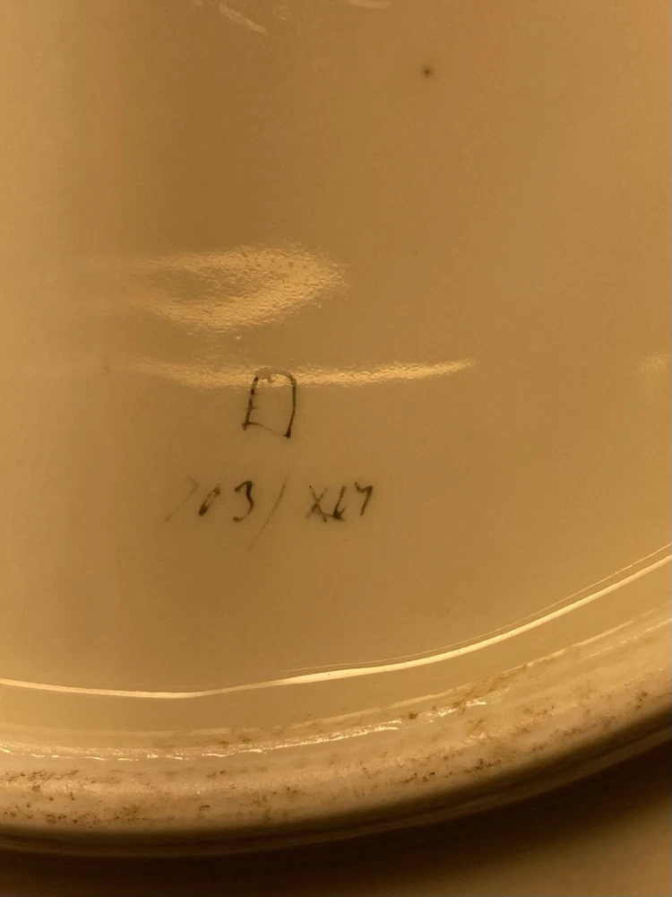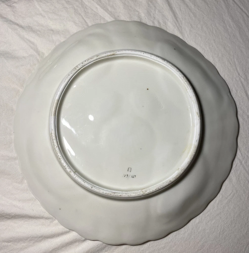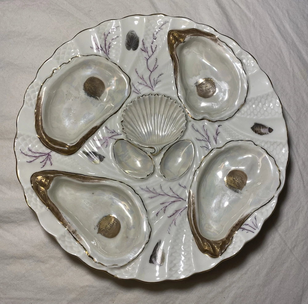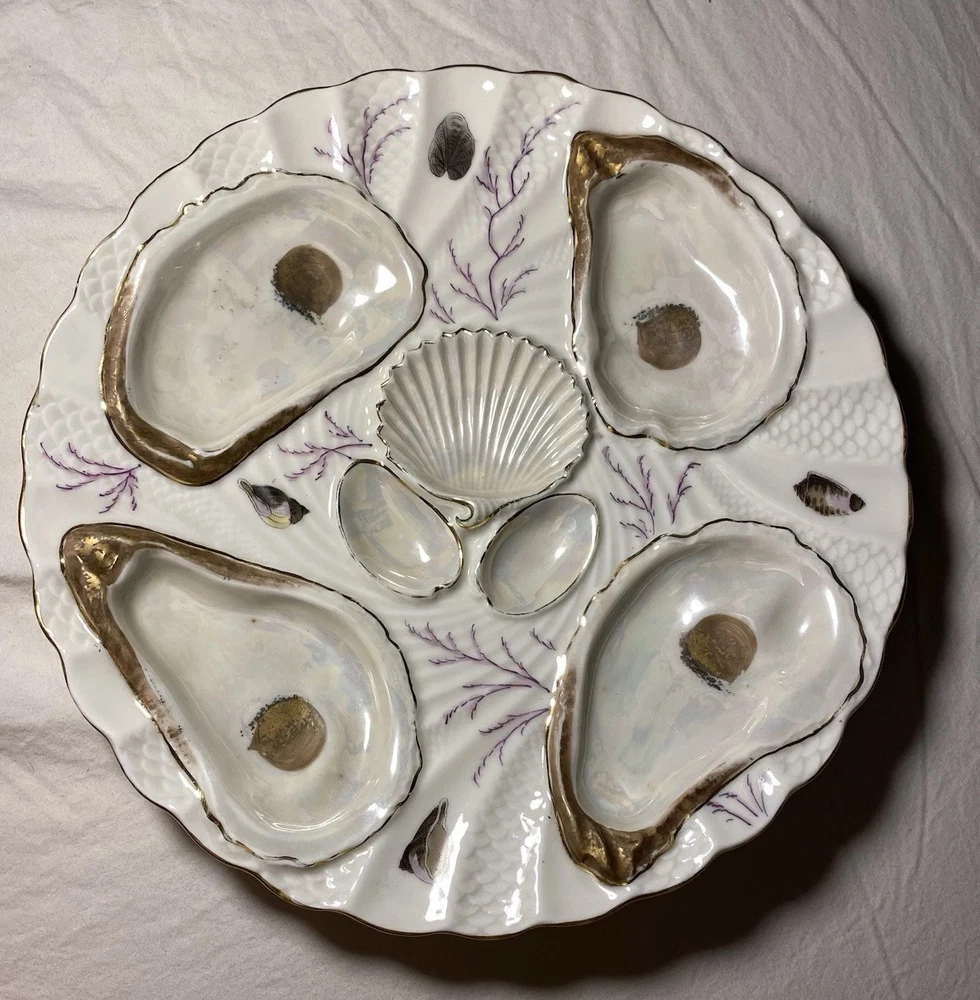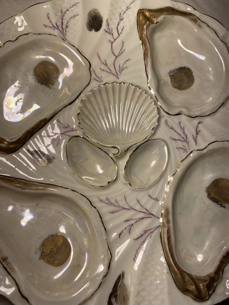What I have up for auction is a royal Vienna oyster plate it is white and gold with purple running through it a reef scene, there are 4 wells and the back is marked 703/xL7 REGISTIRT. I believe This plate is 19th century. Dimensions: 8 1/4th wide 8 3/8ths long and a inch inch and 1/4th tall Condition: No cracks chips or any flaws it is in good used condition PLEASE LOOK AT PICTURES FOR FURTHER DETAIL SOLD AS IS