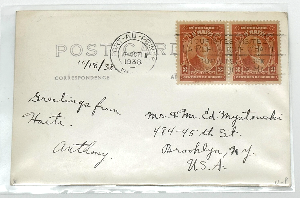 Vintage RPPC of a fleet of Haitian sailboats by photographer Couba, showing dockside activity in the 1920s–30s. Features bilingual title and strong maritime detail. A fine collectible from early Haitian nautical life.
