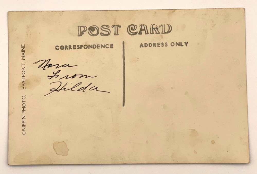 Original real photo postcard (RPPC) studio portrait of a young woman in a ruffled blouse and striped sash. This expressive and finely detailed image was taken by Griffin Photo, Eastport, Maine, noted on the left margin. The reverse bears an inscription: "Nora from Hilda," suggesting this was a personal memento.