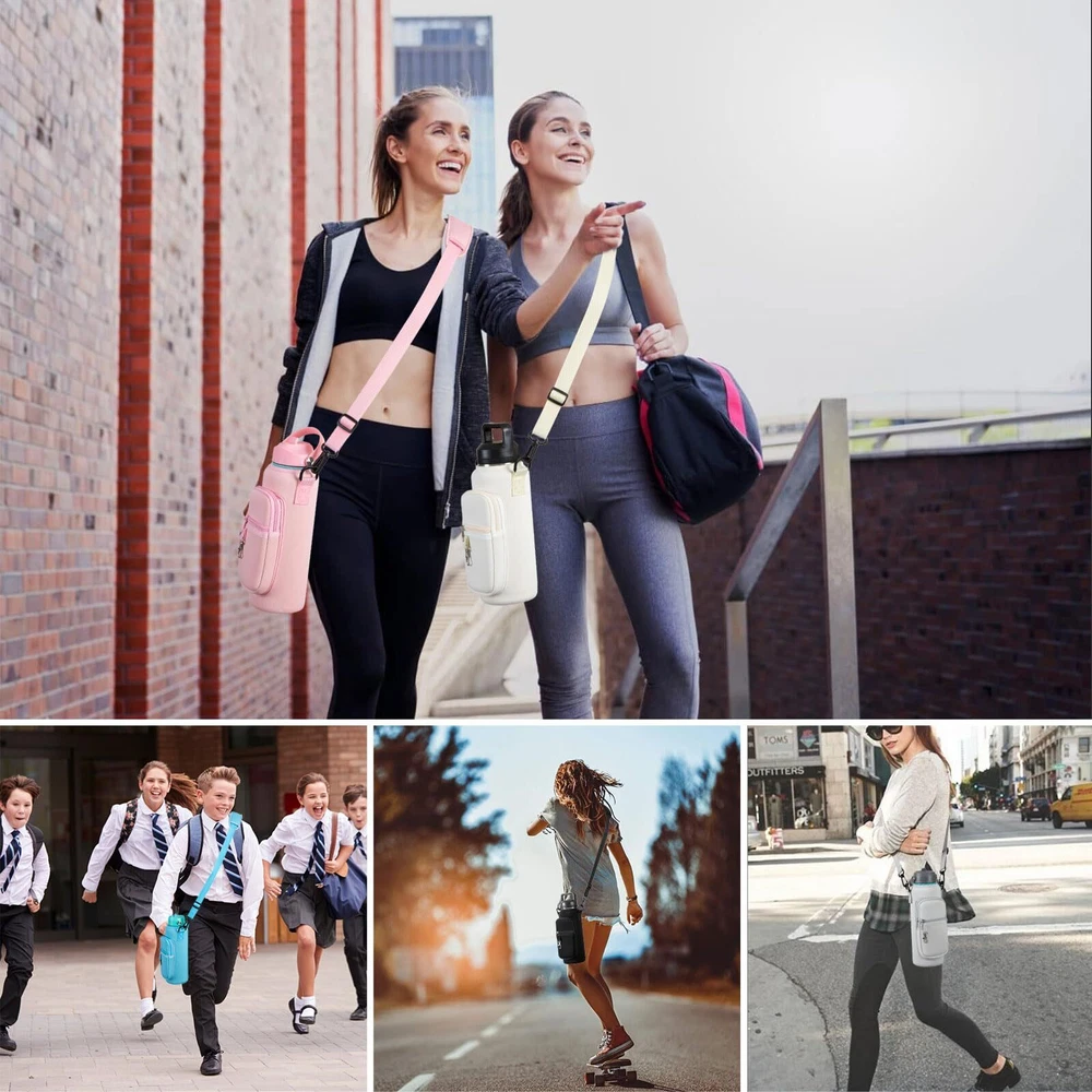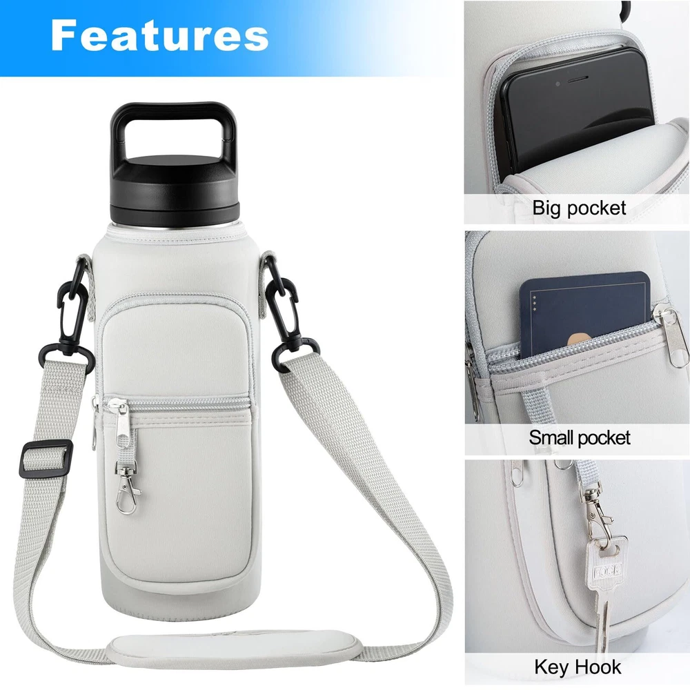 đăDurable Constructionă: Made from high-quality, water-resistant fabric, the holder ensures that your bottles are well-protected from scratches and exposure to moisture. This resilient material withstands daily use, outdoor adventures, and potential weather conditions, preserving the integrity of both the holder and the bottles inside. đăUniversal Compatibilityă: With dimensions of 4" x 5" x 12", this water bottle carrier comfortably accommodates a wide variety of bottles, including vacuum bottles, sports bottles, and feeding bottles from different brands. It is specifically designed to fit bottles ranging in size from 32oz to 40oz, ensuring compatibility with many popular models on the market. đăTemperature Regulationă: The insulated interior efficiently maintains the ideal temperature of your beverages, whether hot or cold. This feature allows you to enjoy perfectly tempered drinks throughout the day, regardless of external conditions, thanks to effective heat retention properties. đăOrganized compartmentsă: In addition to the primary bottle compartment, the carrier boasts multiple pockets for convenient storage of your essentials.Two zippered compartments, complete with a key leash, provide secure storage for your smartphone, keys, and other small valuables. đăVersatile Usageă: This water bottle carrier is suitable for adults engaging in various activities, such as work, walking, hiking, camping, beach trips, and other outdoor pursuits. Its adaptable design, combined with its durability and functionality, makes it a practical choice for individuals with active lifestyles or those who value convenience on the go.