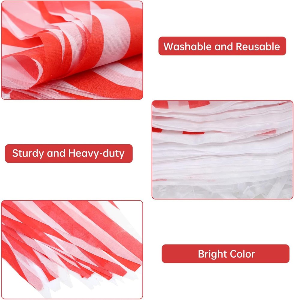 RUBFAC 170ft 120pcs Red and White Striped Pennant Banner, Product Details Brand: rubfac Color: Red and White Material: Polyester, nylon Item Length: 2040 Inches Item Weight: 0.17 Kilograms Polyester,nylon Package Includes: 120 red and white striped banner flags, 60 flags per banner, a total of 2, each is 85 feet, a total length of 170 feet. Product Size: Single flag - 18cm x 28cm / 7 inches x 11 inches (width x length), total banner length - 52 meters / 170 feet. Washable and Reusable: The banner will not fade after cleaning and can be reused. Perfect Choice: Top quality polyester fabric with thick nylon rope for durability. The pennant is cut neatly and will not fall off or break easily. Decoration: This banner is colorful and eye-catching, suitable for any occasion such as carnival circus, children's birthday party, Christmas or grand opening, etc.