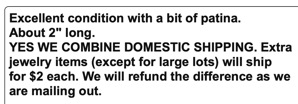 Excellent condition with a bit of patina. About 2" long. YES WE COMBINE DOMESTIC SHIPPING. Extra jewelry items (except for large lots) will ship for $2 each. We will refund the difference as we are mailing out. We are so thankful for our customers! We have thousands of listings, and therefore receive hundreds of messages, every single day. So, if you are asking about a price drop, or a shipping price drop, or asking for extra measurements, or to add additional photos, please allow me to answer you here, No thanks. If your question is not one of those questions, we will be happy to answer you individually. YES...WE DO COMBINE DOMESTIC SHIPPING. Extra jewelry items ship for $2 each (except for large jewelry lots). We will refund the difference as we are mailing out.....we hope you enjoy shopping with us!