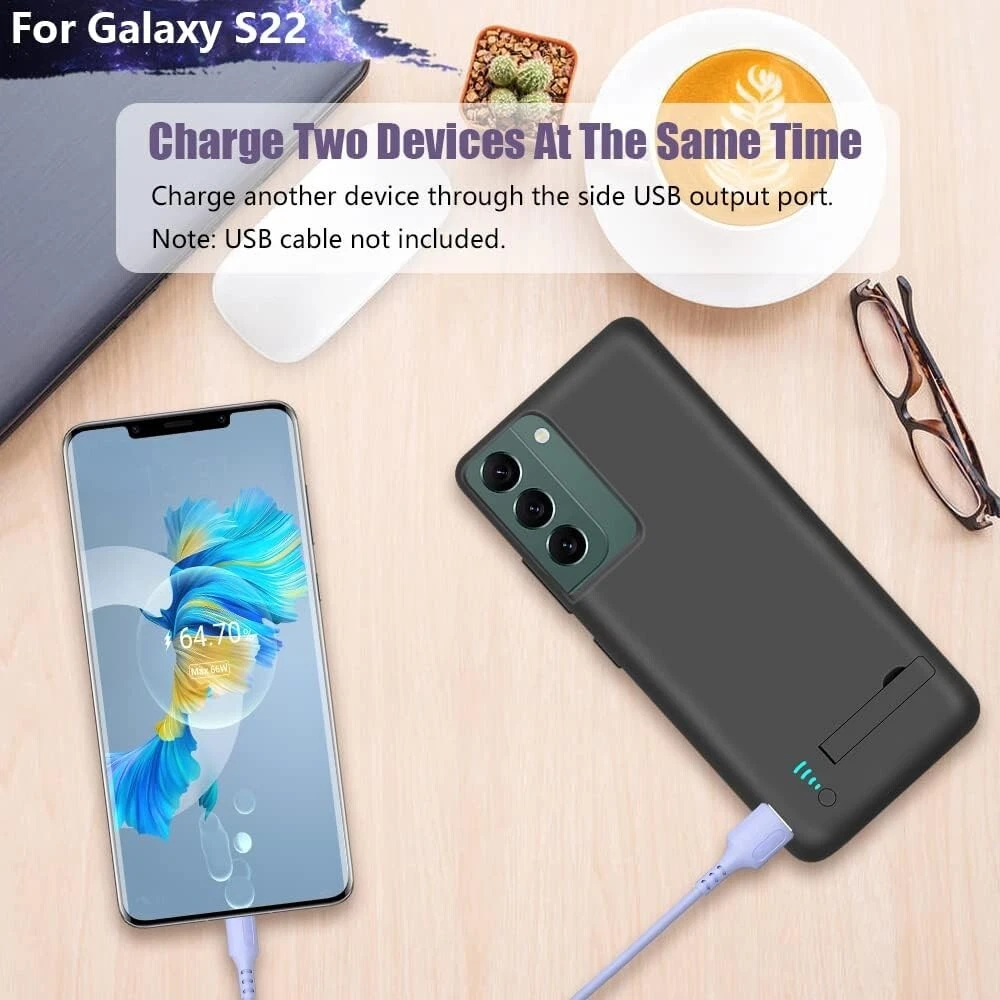 2-in-1 Charging & Protection : Simultaneously charges and protects your Galaxy S22. Includes built-in short-circuit and overcharge protection for added safety. Convenient Power Management : Integrated power switch lets you quickly turn charging on/off. LED indicators display battery status, with each light representing 25% power. Slim & Travel-Friendly Design : Compact and lightweight, perfect for travel or outdoor activities. Provides easy access to phone buttons and ports without removing the case. Durable & Protective : Made of high-quality materials for a comfortable grip and 360º protection against bumps, scratches, and dust. Note: Screen protector not included. Extended Battery Life : Equipped with a powerful 4800mAh lithium-ion battery to provide up to 100% extra juice for long trips or busy days. Compatibility : Exclusively designed for Galaxy S22 (6.1"). Not compatible with Galaxy S22+ or Galaxy S22 Ultra. Type-C wired headphones, Android Auto, quick charging, wireless charging, and Samsung Pay are not supported while using the case