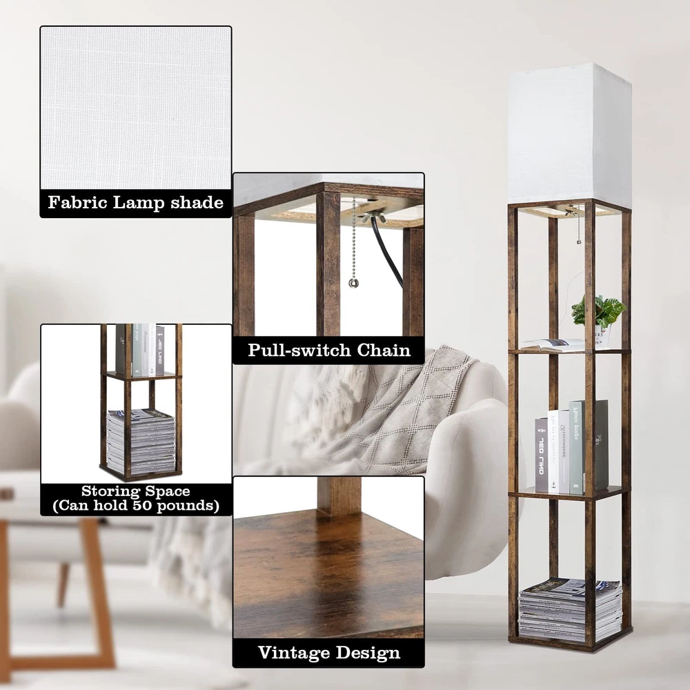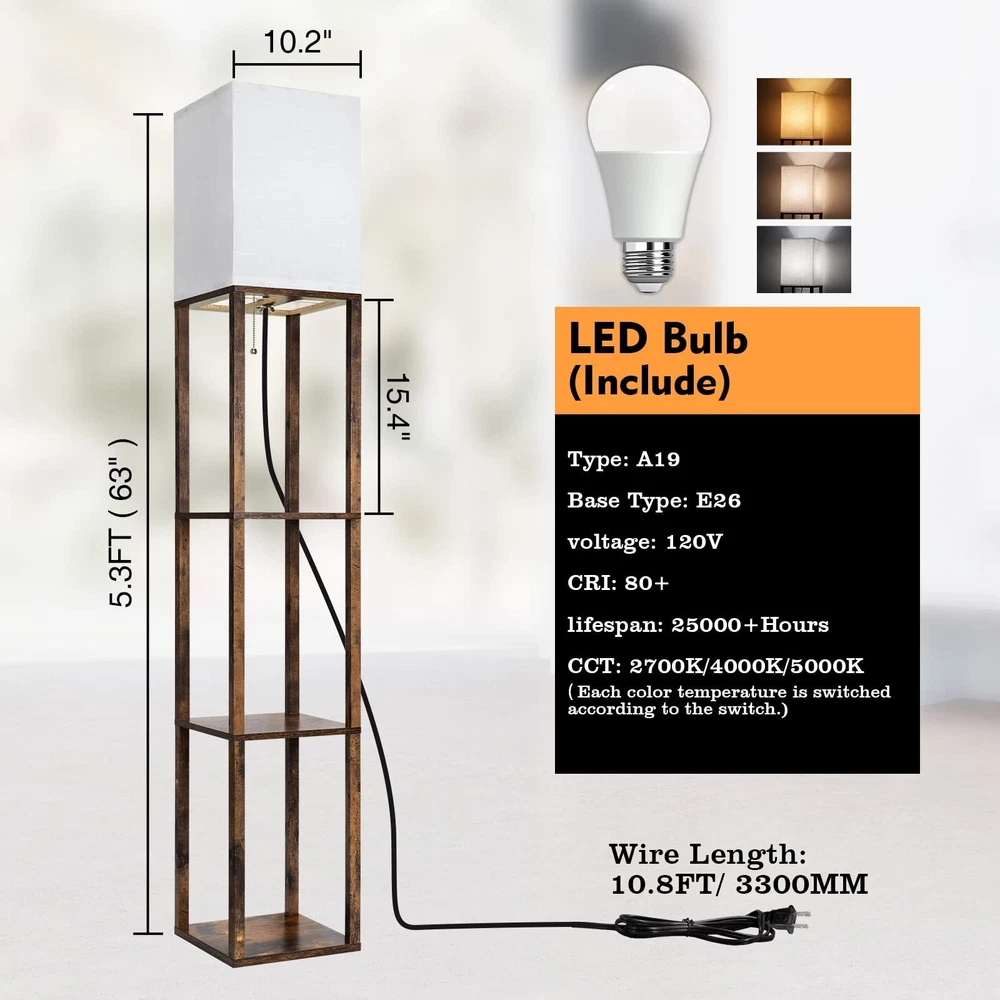 š”š”ćTriple Display Shelves Lampć: RUNTOP 63inch high shelf floor lamp with 3 brown tiers provides a display and storage space for your valued family photo, plant, magazines and other sundriesļ¼which loads up to 50 pounds max. It's convenient and practical in your bedroom, guest room, or office. š”š”ć3 Color Temperature Floor Lampć: You can control the brightness of your floor lamp for bedroom with the ability to adjust color temperature(2700K, 4000K, 5000K ) by pulling the chain. To adjust your favorite atmosphere of your space. š”š”ćSmart Floor Lamps Designć: This floor lamp with shelves is equipped with an E26 base compatible with various bulbs. A 8W A19 LED bulb included.CRI 80+ of the bulb can show the color of the object more realistically. When you adjust the standing floor lamp to the brightness, the last mode will be saved you set, which is convenient for your life. š”š”ćPremium Fabric lampshadećThis floor lamp for living room is designed with off-white cloth lampshade.The simple and stylish design complements the medieval or modern decoration style, which creates a elegant and comfortable atmosphere to your study, den, dorm room, foyer. š”š”ćEasy to Assembleć The modern floor lamp is easy to assemble within 10 minutes, no tools needed.Easy to install and powerful in functionality, so it can be used as a corner lamp to decorate your living room or as a nightstand with lamp to bring you life convenience.