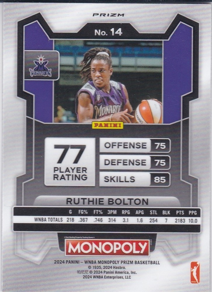 Shipping: $2.99 for 1st Item; $4.99 for 2 items or More (only when paid all on the same invoice & won within a 48 Hr Period ~ Invoices periodically update!!!) (If you buy 2 or more cards shipping total is capped at $4.99) Item: 2024 Panini Monopoly Red Prizm #14 card of WNBA Basketball Star Ruthie Bolton Condition: All cards are in Nrmt-Mt condition unless otherwise stated Payments: Due within 3 days of auctions end by Paypal Shipping: Worldwide shipping is available, $6.99 flat rate for items won in a 48 hour period Policy: Customer Satisfaction is #1, if for any reason you are not 100% happy with your purchase contact me and I will fix any problems. Good Luck Bidding & please come back soon! I am always listing new items! Powered by SixBit's eCommerce Solution