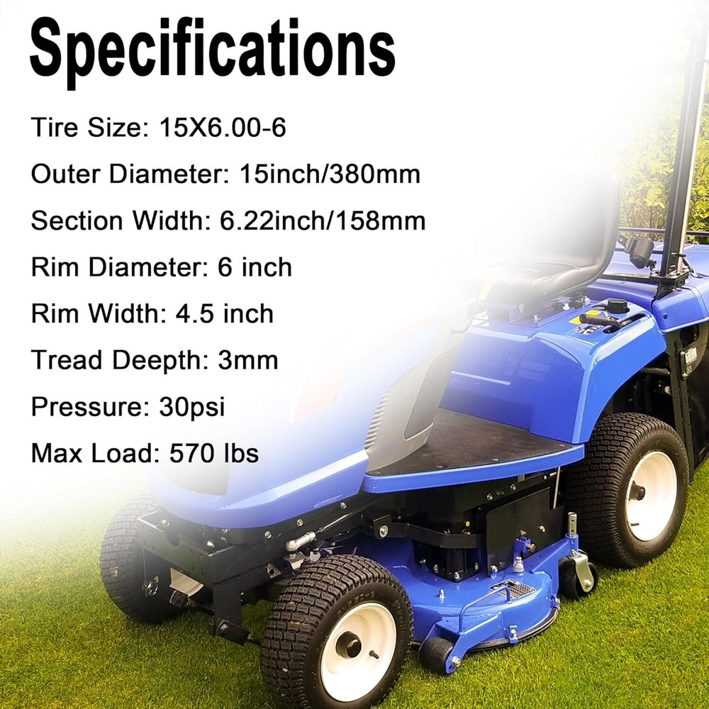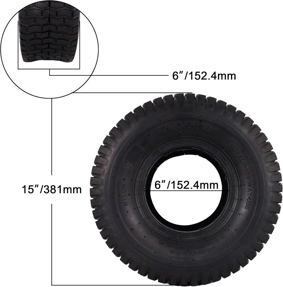Store New Arrivals Add to Favorite View Feedback Contact RUTU 15x6.00-6 Lawn Mower Tires & Inner Tubes Set (2 Tires + 2 Tubes) - Durable, Wear-Resistant RUTU 15x6.00-6 Lawn Mower Tires & Inner Tubes Set (2 Tires + 2 Tubes) - Durable, Wear-Resistant Product Description: Overview: The RUTU 15x6.00-6 Lawn Mower Tire and Inner Tube Set is designed to provide high-quality performance for a variety of outdoor equipment. This set includes two 15x6.00-6 tires and two matching inner tubes, perfect for riding lawnmowers, garden tractors, wheelbarrows, and more. Featuring a wear-resistant rubber construction, these tires ensure durability and stability, even on the toughest surfaces, making them ideal for year-round use. Key Features: Complete Set: The set includes two 15x6.00-6 outer tires and two 15x6.00-6 inner tubes. Please note that rims are not included . Wide Compatibility: These 15x6.00-6 tires are suitable for a wide range of equipment, including riding lawnmowers, yard tractors, lawn wagons, garden trailers, wheelbarrows, and tillers. Ensure you verify your tire size before purchasing to ensure a perfect fit. Wear-Resistant Outer Tires: Crafted from high-strength, wear-resistant rubber, these tires are built to last. They offer excellent durability and can roll easily on various surfaces, providing reliable performance in all seasons. High-Quality Inner Tubes: The 15x6.00-6 inner tubes are made from premium rubber, offering superior air tightness and elasticity. These tubes are resistant to ozone cracking and dry rot, ensuring long-lasting durability even in tough outdoor conditions. Superior Traction & Stability: The tires feature small, transverse tread blocks that provide optimal traction and stability, even on wet, muddy grass. This allows for easy handling and protects the turf from damage during operation. Specifications: Tire Size: 15x6.00-6 Included: 2 tires + 2 inner tubes (Rims not included) Material: High-strength, wear-resistant rubber (Tires), premium rubber (Inner Tubes) Compatibility: Riding lawnmowers, garden tractors, wheelbarrows, tillers, and more Tread Design: Small, transverse blocks for superior traction and stability Why Choose This Tire & Inner Tube Set? This tire and inner tube set offers an affordable and reliable solution for your lawn care equipment. Built for durability, easy handling, and stability, it’s the perfect replacement set to keep your outdoor equipment in top shape throughout the year. FAQs: Do the tires come with rims? No, this set includes only the tires and inner tubes. Rims are not included. Will these tires fit my lawn mower? These tires are designed for equipment that requires 15x6.00-6 tires, such as riding lawnmowers, yard tractors, and garden trailers. Please verify your tire size before purchasing. Are these tires suitable for use in all seasons? Yes, the tires are made from durable, wear-resistant rubber and can perform well in any season, providing reliable traction even in wet or muddy conditions. How do I know if these inner tubes will fit my equipment? These inner tubes are made to fit the 15x6.00-6 tires. Ensure your equipment uses the same size before purchasing. What kind of tread design do the tires have? The tires feature small, transverse tread blocks, offering excellent traction and stability, ideal for use on grass and other surfaces. Are these inner tubes resistant to cracking or dry rot? Yes, the inner tubes are made of high-quality rubber and are resistant to ozone cracking and dry rot, ensuring they last longer. Can these tires be used on wheelbarrows? Yes, these tires are suitable for wheelbarrows, as well as other lawn and garden equipment such as lawnmowers and garden trailers. How durable are the tires? The tires are made from high-strength, wear-resistant rubber, ensuring long-lasting durability even under heavy use. Are the tires easy to install? Yes, these tires are easy to install with the inner tubes. Just mount the tire on the rim and inflate the tube. Can I use these tires in muddy or wet conditions? Yes, the tires are designed with tread blocks that ensure great traction and stability, even in wet, muddy grass. Speed Rating A3 Rim Size 6 Inches Tire Aspect Ratio 65 Tire Diameter 15 Inches Maximum Pressure 30 Pound per Square Inch Section Width 6.22 Inches Item Diameter 15 Inches Load Capacity 570 Pounds Rim Width 4.5 Inches Load Index 63 Speed Rating A3 Tread Type Non-Directional Seasons Year Round Load Index 63 Tread Depth 3 Millimeters Ply Rating 4-Ply Rim Size 6 Inches Tire Aspect Ratio 65 Size 15X6.00-6nhs Tires and Tubes PRODUCT DIMENSIONS : . Weight: 11.88 lb About Us Welcome to Perishey, your premier destination for high-quality products at unbeatable prices. Our commitment to excellence ensures that you receive top-notch service and premium items across a variety of categories. Our professional customer support team is always ready to assist you with any inquiries or needs, ensuring a seamless shopping experience. We take pride in serving you and strive to bring a smile to your face with our exceptional service and products. Visit our eBay store to explore our full range of offerings and discover the great deals we have in store for you. Thank you for choosing Laelegencia. Payment policy We have eBay Managed Payments, allowing you to pay with any payment method that eBay accepts. Please ensure that your shipping addresses are accurate. Immediate payment is required before we can send out your package. Shipping policy We are always working hard to ensure your package arrives as soon as possible. Please understand that some factors like weather, high postal traffic, and the performance of shipping companies are outside of our control. In most cases, your package will arrive before due time as it is a high priority for us. If there are any unexpected delays, please let us know and we will take care of it immediately. We have multiple locations in the US; residents of these states will be charged tax acco