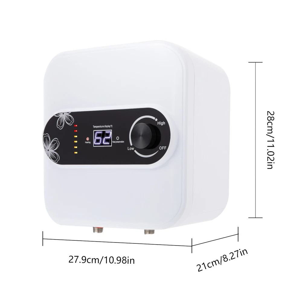 Specification Material: Plastic, Stainless Steel Color: White Screen Type: LED Surface Treatment: Injection Molding Process Style: Modern Shape: Rectangle Water Outlet Method: Lower Water Outlet Amount Type: Wall Mounted, Free Standing Power Source: Corded Electric Plug Type: US Standard Capacity: 8L/2.11gal Rated Voltage: 110V Temperature Range: 30-65°C/86-149 ℉ Power Cord Length: About 1m/3.28ft Heating Time: 15-30min Wire Cross-section Requirement: 1m ³/ 35.31ft ³ Rated Power: 1500W Model: SY-8 Rated Frequency: 60Hz Rated Pressure: 0.75Mpa Waterproof Grade: IPX4 Gross Weight: 4.5kg/9.92lb Product Size: 27.9*21*28cm/10.98*8.27*11.02in Package Size: 33*32*37cm/12.99*12.6*14.57in Package Included 1*Electric Water Heater 1*Safety Relief Valve 2*Screws 1*Hose 1*English Manual RV 8L 110V Storage Electric Hot Water Heater Shower Compact Mini-Tank Storage Description The electric water heater is safe to use because of its protection functions that can protect you from the risk of burns, electrical leaks, or other injuries. The water is quickly heated to eliminate the long wait because of the 1500W power, which is more time-saving. The unit's sleek and modern design is also a visual delight, adding to its aesthetic appeal. In conclusion, the electric water heater is a smart and efficient appliance that is worth investing in for its numerous benefits and features. Key Features Build to Last: The high-quality plastic shell, stainless steel inner liner, and injection molding process make the product very heat-resistant, corrosion-resistant , and durable. Large Capacity: You can wash multiple sets of utensils at once because of its 2.11gal ca pacity, which can meet the heating needs of the family's daily life. Convenient to Use: The digital temperature display visualizes the temperature and the temperature knob allows you to adjust the temperature freely from 86-149℉, which is also convenient for the elderly and children. Low Water Pressure Start: It is suitable for water pressure of 0.75Mpa, and can work stably even under low water pressure without worrying about not having enough water in the upper floors or during peak water use. Less Loss of Heat: The design of near outlet, shorter pipes and 360° polyurethane foam technology effectively reduce heat loss, resulting in better insulation. Easy and Flexible Installation: The top outlet design, clear plumbing connection markings, compact size (10.98*8.27*11.02in), and two optional mounting styles (wall-mounted/free-standing) make installation easy and convenient, even for novices. Quick Heating: The 1500W of high power and stainless steel inner liner allow the product to heat water(15-30mins) efficiently, evenly and permanently without preheating. High Safety : High-temperature protection, high voltage protection, anti-dry burning protection, grounding protection, isolation protection, power outage protection mechanisms, as well as the plug with leakage protection switch, can effectively prevent accidents during use and ensure your safety. Excellent After-Sales Service: We aim to provide quality products and services, if you have any problems, please feel free to contact us. We will reply and solve the problem for you as soon as possible. Protective Packaging: Anti-collision foam can effectively avoid losses caused by normal vibration and collision during transportation, ensuring the integrity of the products you can receive to a certain extent. Details Heating Indicator Light: It displays the heating status, and you can easily see its working status at a glance. Long Power Cord : Approximately 3.28ft of power cord gives the product a longer usage distance, breaking through the shorter distance limit of traditional products. Exquisite Patterns: Flower patterns add a refined and elegant feeling to simple and atmospheric products, making them more attractive. Application It can be used in kitchens, wash benches, balconies, bathrooms, and other places to provide domestic water, kitchen water, washing water, and cleaning water. Specification Material: Plastic, Stainless Steel Color: White Screen Type: LED Surface Treatment: Injection Molding Process Style: Modern Shape: Rectangle Water Outlet Method: Lower Water Outlet Amount Type: Wall Mounted, Free Standing Power Source: Corded Electric Plug Type: US Standard Capacity: 8L/2.11gal Rated Voltage: 110V Temperature Range: 30-65°C/86-149 ℉ Power Cord Length: About 1m/3.28ft Heating Time: 15-30min Wire Cross-section Requirement: 1m ³/ 35.31ft ³ Rated Power: 1500W Model: SY-8 Rated Frequency: 60Hz Rated Pressure: 0.75Mpa Waterproof Grade: IPX4 Gross Weight: 4.5kg/9.92lb Product Size: 27.9*21*28cm/10.98*8.27*11.02in Package Size: 33*32*37cm/12.99*12.6*14.57in Package Included 1*Electric Water Heater 1*Safety Relief Valve 2*Screws 1*Hose 1*English Manual Notes Please note that each host has been tested before leaving the factory, so it is normal to have water inside. Please note that this project requires water before installation and then power on during the installation process. It is recommended to install this item vertically to ensure a longer service life. Please ground the grounding wire correctly and prohibit the use of mobile sockets. Please note that this product is not suitable for showering. Please strictly read the English manual before using it. Please allow the slight color difference caused by the shooting light and the 1-3 cm error due to manual measurement, and make sure you do not mind before ordering. Payment Delivery details Terms of sales About us Contact us Payment We accept ebay payment 。 Fees such as import duties, taxes are not included in the item price or shipping costs. These charges are the buyer's responsibility. Delivery details Shipping: 2-9 working days to: USA Terms of sales We maintain high standards of excellence and strive for hundred percent customer satisfaction. Feedback is very important to us. We hope that you contact us immediately before you give neu