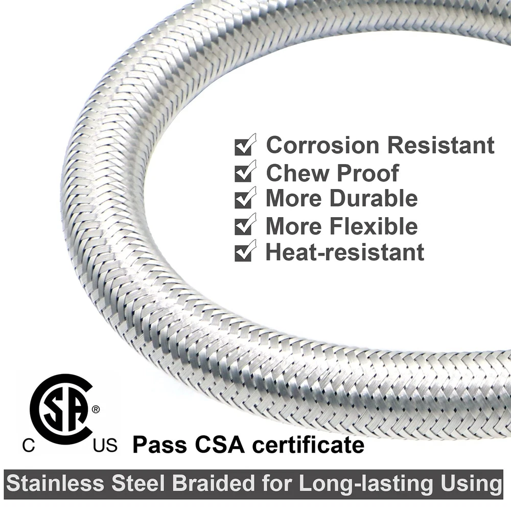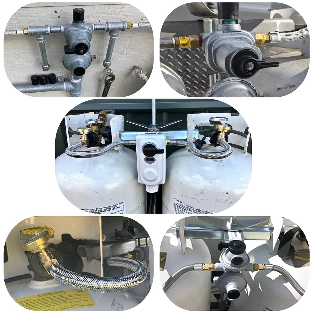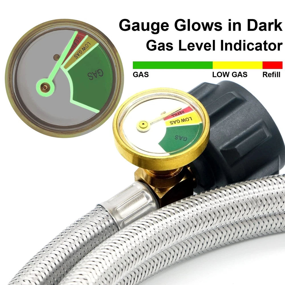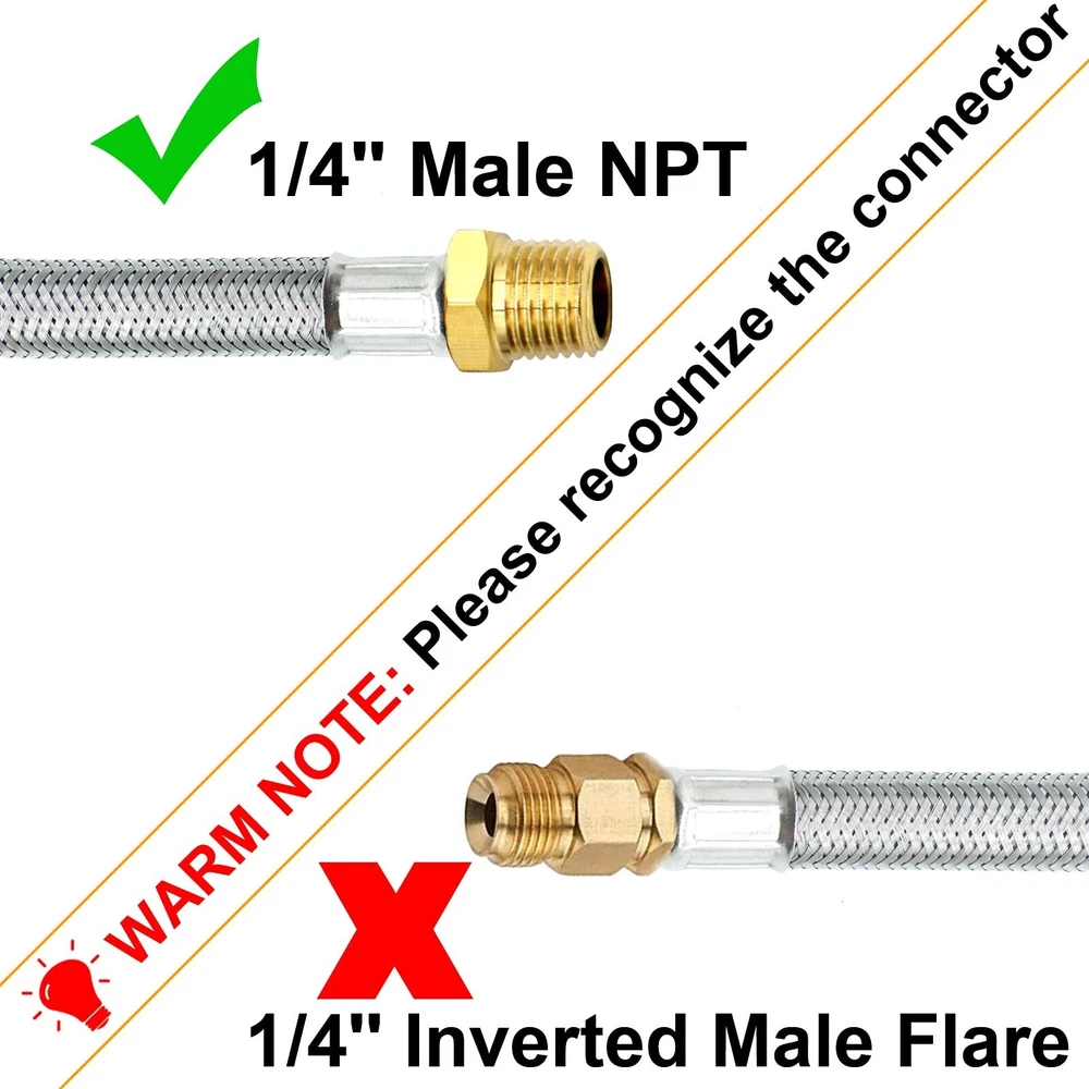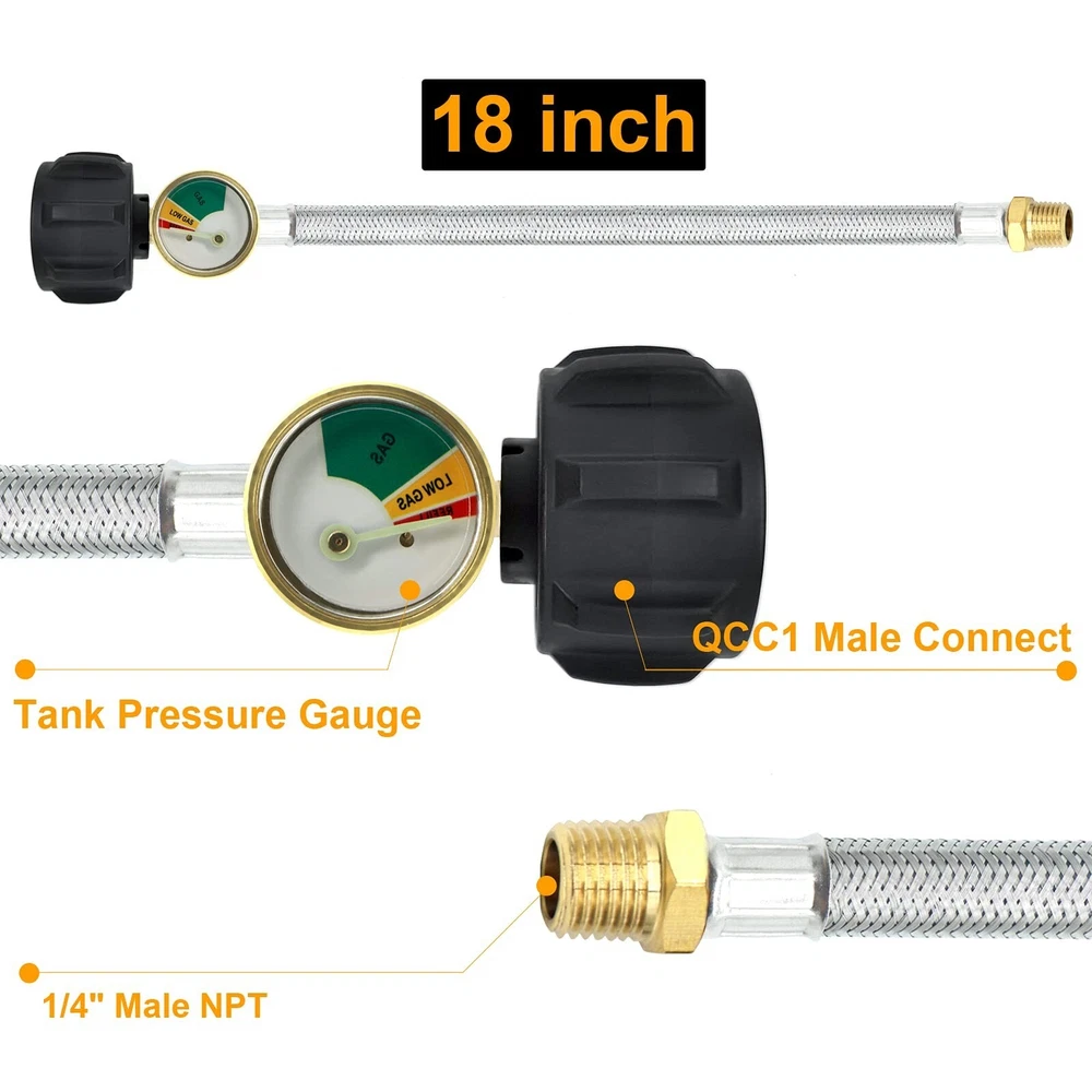 2 Packs RV Propane Hoses with Gauge, 18 Inch Stainless Steel Braided Camper Tank Hose,Rv lp Gas Hoses Connector for Standard Two-Stage Regulator, 40Lb 250PSI, 1/4" NPT /QCC1 Fittings Size: 1/4" Male NPT /QCC1 Fittings Brand NQN Material Stainless Steel Color Silver, Gold, Yellow, Black Maximum Pressure 250 Pound per Square Inch Item Length 18 Inches Manufacturer NQN About this item 🔥【NQN Upgraded Stainless Braided QCC1 1/4" NPT RV pigtail propane hose】1/4" NPT stainless steel braided RV propane pigtail hose to 1/4" Female NPT. (Note: Not the 1/4” inverted flare. Please check your connector before you order it.) This propane tank hose come with tank gauge level indicator, also with 3 different colors Dial Gauge can glows in dark, which allows you to read and monitor the gas level without necessarily removing the tank, and can detect the leaks. 🔥【Premium Material】1/4” Female NPT x Acme Nut(NOT 1/4" Inverted Flare), Gauge, and 3/8" Male Flare Fitting Connector are made of 100% Solid Brass. 18 inch QCC1 1/4" NPT RV pigtail propane hose is made of durable stainless steel braided, with weather resistance, anti-corrosion, anti-aging, air tightness, heat-resistance, flexibility features. Durable solid brass provides secured connections between appliance and tank. This Propane Hose with CSA Certification, ensures air tightness and stability. 🔥【 Easy to Install & Wide Application】The QCC1 Male side can connect with hand wheel easily. And the 1/4 inch Male NPT x Acme Nut side can tighten easily with the free wrench. The pigtail hose can also be used to connect to an installed 4-Port Tee as an auxiliary propane supply. Fits for RV, Camping, BBQ, tailgating, heating needs or having an outdoor cooking. Add 2 Velcro easy to store and use: Buckle Velcro to hang and Small Velcro to fix, save your space after using. 🔥【Compatible】This 18" RV pigtail propane hose can connect a 5-40 lb refillable propane tank or LP gas tank to your camper's 1/4" NPT standard with 2-stage regulator. This RV Propane Hose with1/4" male NPT (NOT 1/4" Inverted Flare), NOT FIT 2-stage auto-changeover regulator with 1/4" female inverted flare fittings. 🔥【Packaging & Two Years 100% - Satisfaction Guarantee】The set includes: 2 Pcs 18 inch Stainless Steel Braided QCC1 1/4" NPT RV Pigtail Propane Hose with Gauge + 1 pc Wrench + 1 pc Roll Yellow Sealing Tape + 1 pc Buckle Velcro + 1 pc Small Velcro. If you're not satisfied with this item at any time within two years after purchased, we'll provide a refund or replacement. (Item does not ship to Miami&Doral, FL), have any problem please contact us !