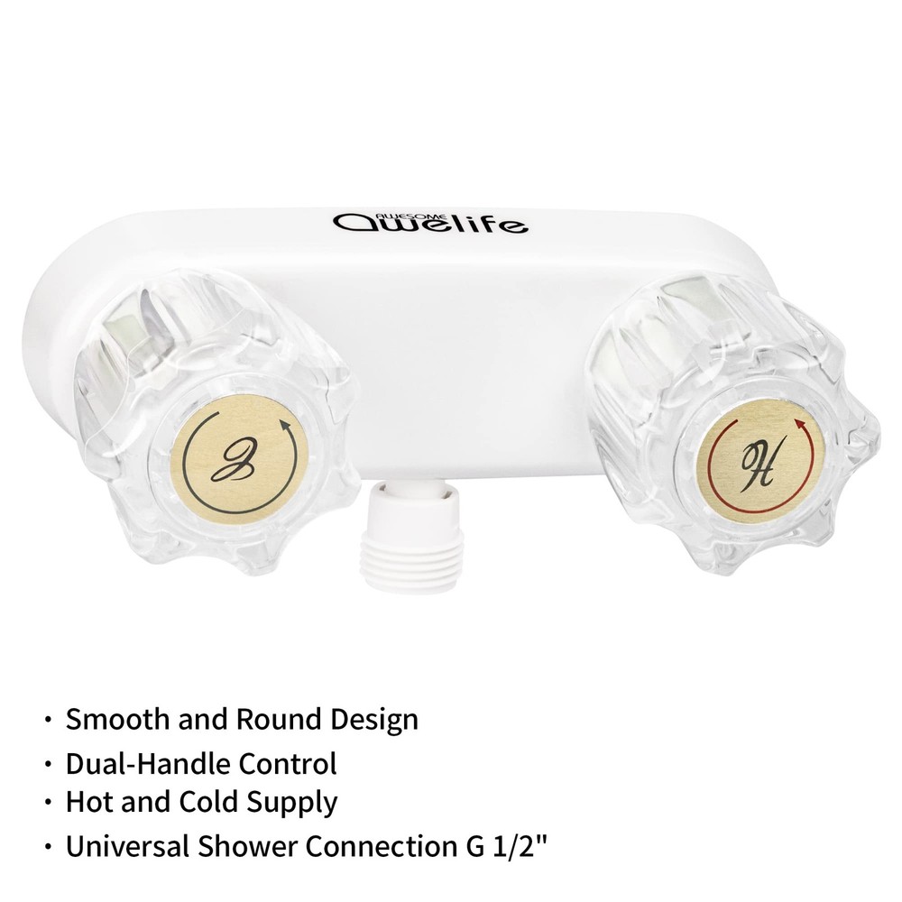 FEATURES | This faucet boasts a classic, fully functional diverter, and crystal acrylic knob operation, to quickly adjust temperature and aerated water pressure. DESIGN | The classic styling of this faucet is the perfect solution for updating your shower hardware, and is made using premium grade lightweight synthetic waterways and sturdy plastic construction. QUALITY | This dual knob faucet comes with a durable easy-to-turn design, and provides a desired smooth turning action and unwanted dripping. The diverter accommodates all standard shower hoses. INSTALLATION | If you are concerned about enough space in your shower to accommodate this faucet, don’t worry! It was made with a recreational vehicle’s space in mind, and no plumber is needed. SPECIFICATIONS | Works on any 2-hole, 4” center to center installation. Flow rate is a powerful 2.4 GPM for those that are looking for powerful stream.
