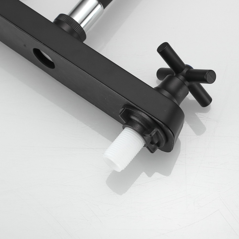 The valves are 8 inches apart for standar rv sink Design for faucet, chrome finish, ABS made main body, Silicone arch Package Includes Faucet 24 inch (60 cm) long Hot & Cold Water Hoses Mounting Hardware Movable and Bendable: The RV kitchen faucet designed with 360 degree rotatable tap head and flexible arch allow the rv faucet to rinse the entire sink! It is very easy to move and bend to any spot in the sink and quick to change from a spray to a stream Sleek Design for RV Sink: RV kitchen sink faucet is constructed of silicone arch and lightweight ABS plastic 8-inch body, replacement faucet for RVs, motorhomes, campers, trailers; Black finish easy to match most sink Versatile Water Flow: Enjoy the convenience of two water flow modes: Shower Mode and Bubbler Mode. Easily switch between the two modes for different washing tasks. Enjoy a comfortable and customized washing experience with just a simple turn of the knob. Easy Temperature & Flow Control: The classic cross knob switch design provides effortless operation and allows you to easily adjust the water temperature and flow according to your preference. Easy Installation: Camper faucet kitchen with 1/2 threaded male inlet shanks; Compatible with most standard RV kitchen sink; Easily install without plumber
