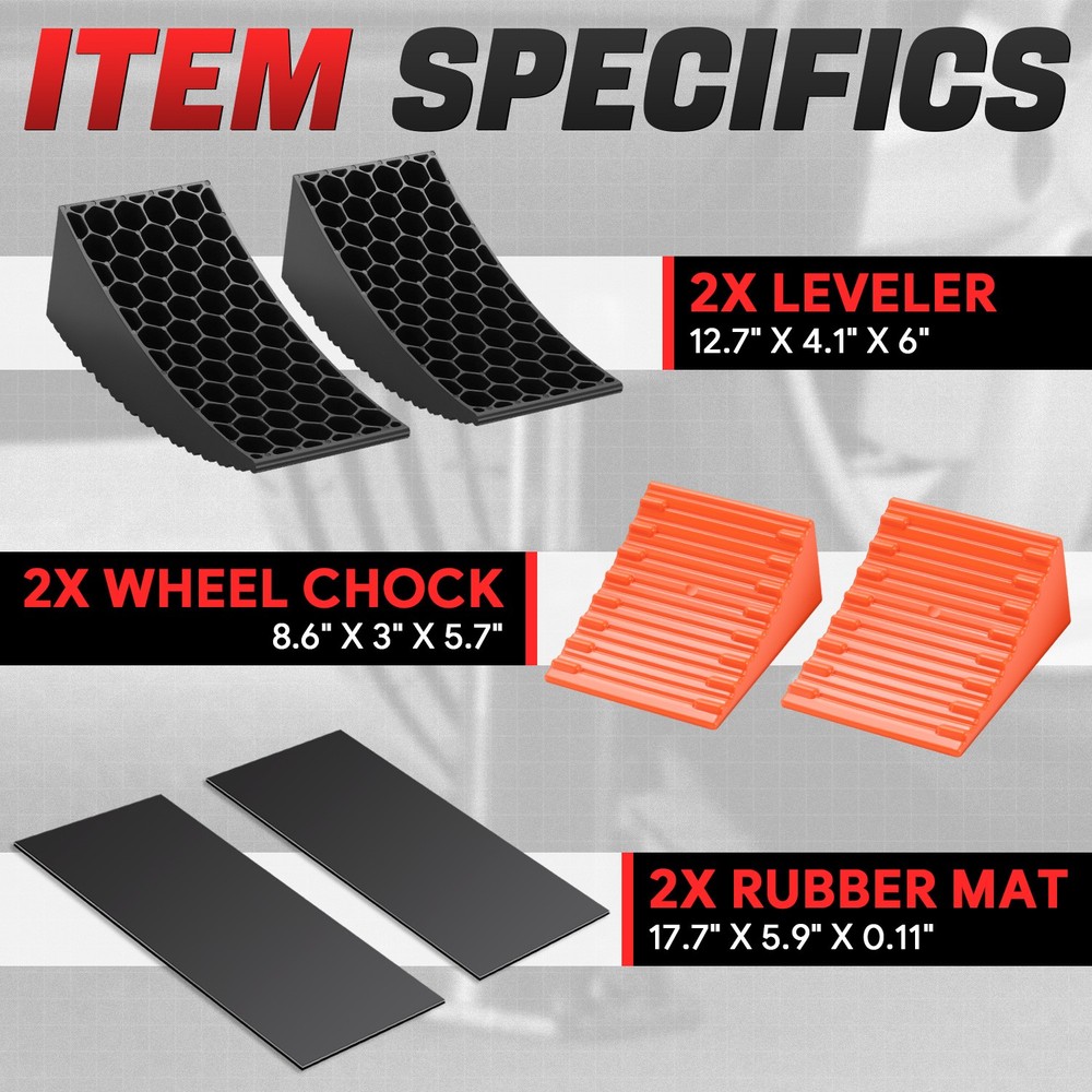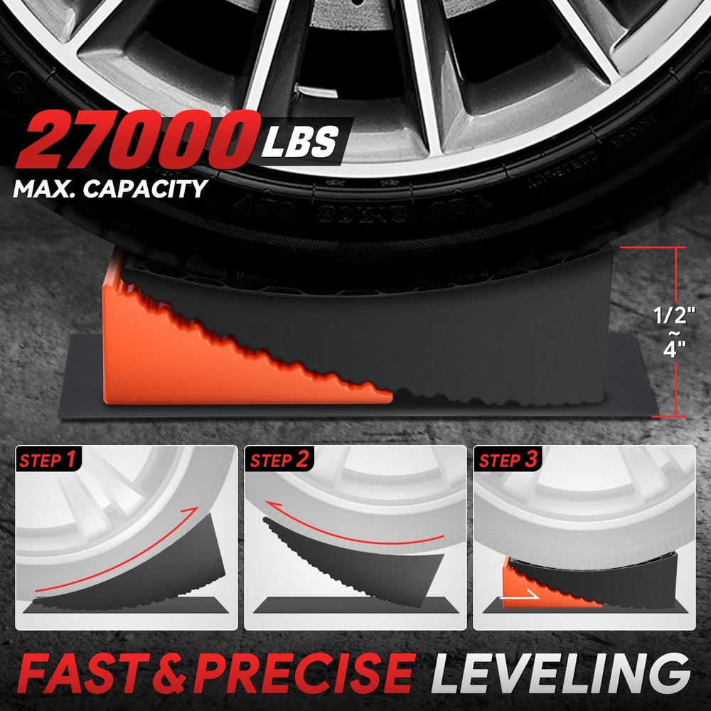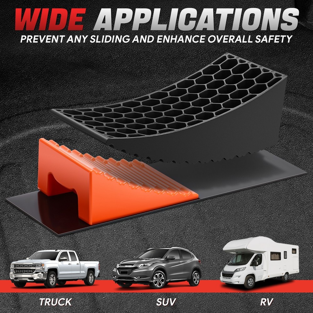These leveling ramps are a game-changer for RV trips! Super sturdy and easy to use, they hold weight like a champ while the non-slip design keeps everything secure. The included mats and chock add extra stability, and the carry bag makes storage a breeze. Perfect for quick, hassle-free leveling—highly recommend for smoother camping adventures!