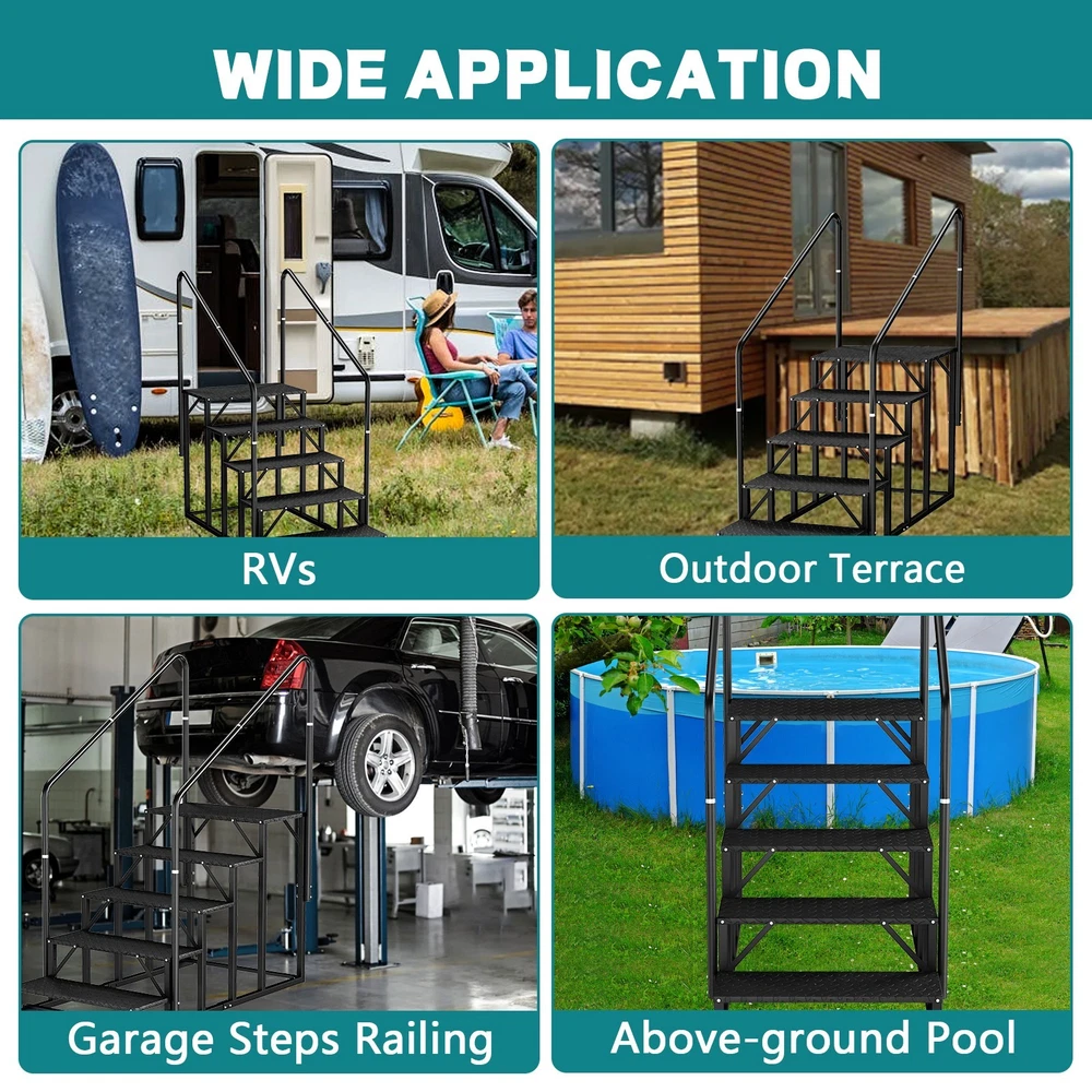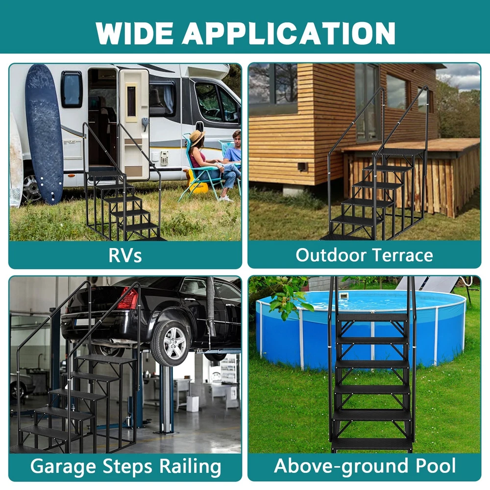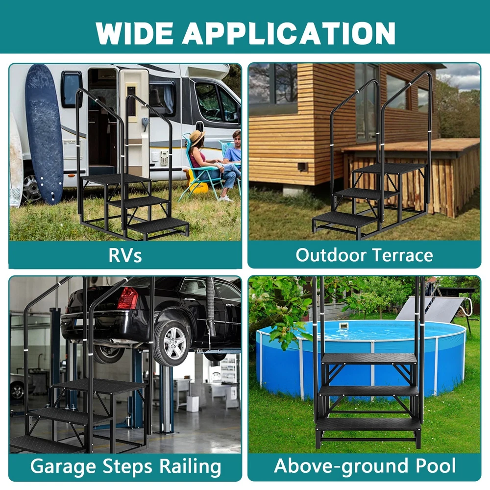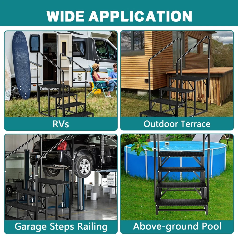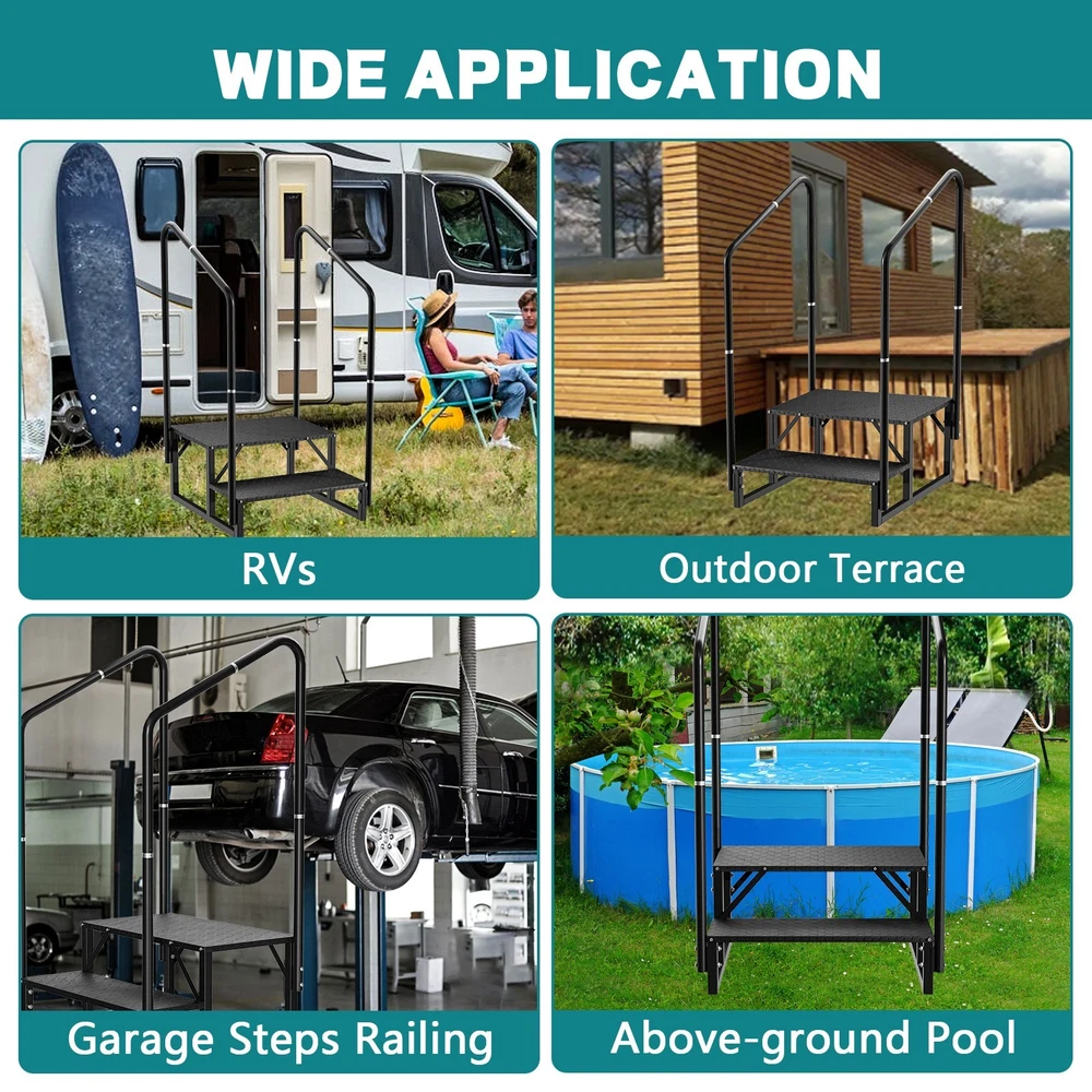 【Sturdy Construction】This RV steps is made from heavy-duty alloy steel, highly resistant to corrosion and deformity. With 500lbs weight capacity, it features triangular bars for added stability, reducing wobbling and the risk of falling. 【Entry Assist Handrail】The mobile RV stair is equipped with handrails that added support when entering and exiting your RV, especially in wet and slippery or nighttime conditions. 【Multiple Size Available】Our camper steps come in different steps to suit your needs, which is 2 to 6 steps. The ladder bookshelf has mounting holes on both sides, allowing for flexible handrail placement. 【Anti-slip Wide Steps】The RV entry steps equipped with thickened panel allows you to step on it more stable, it is not easy to damage and does not need to be pasted that keeping your family and friends safe. 【Wide Application】Our RV step ladder is suitable for various scenarios, such as RVs, travel trailers, campers, swimming spas, and hot tubs, providing support for elderly, children, and other mobility-impaired individuals.