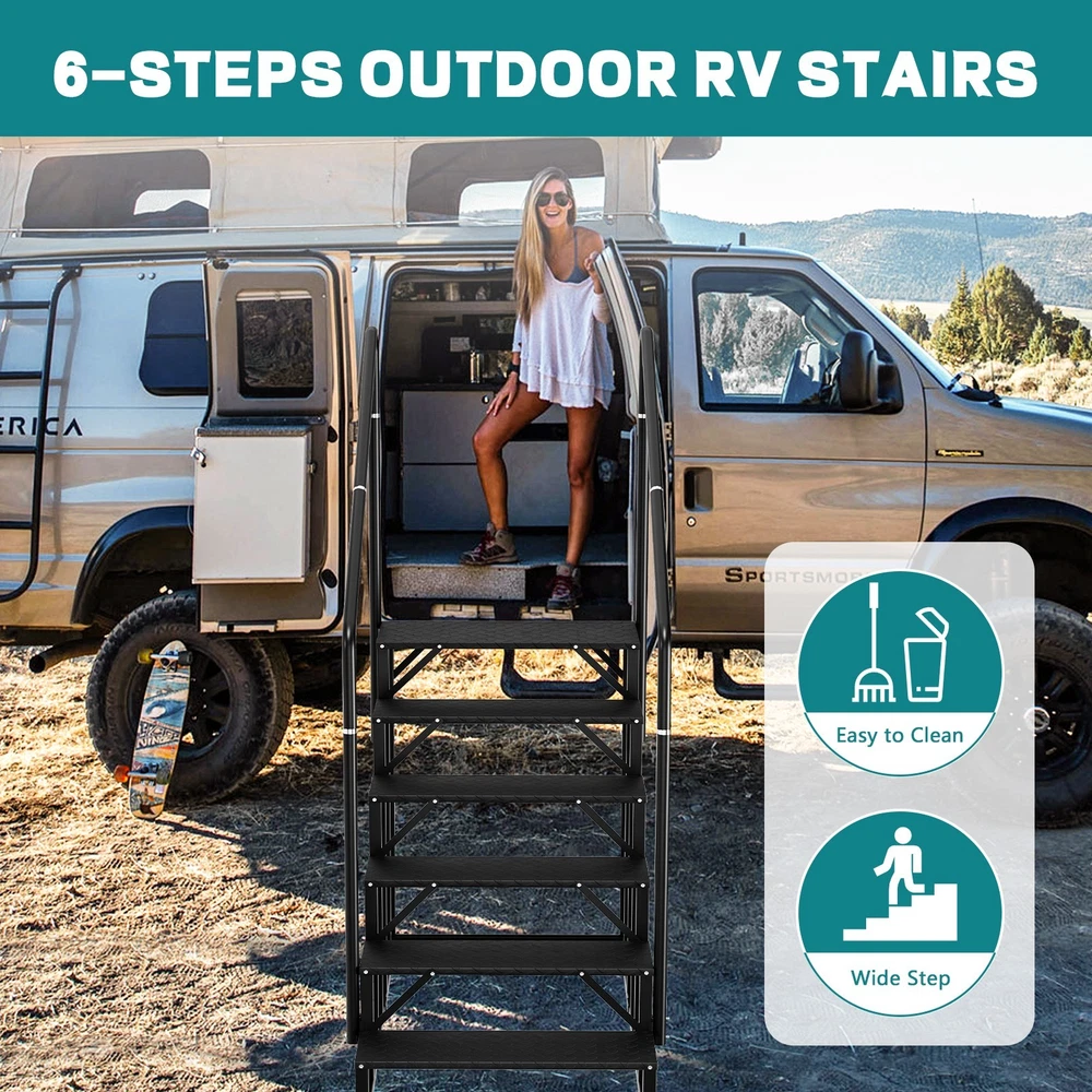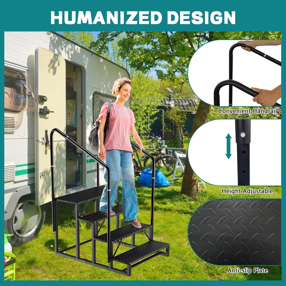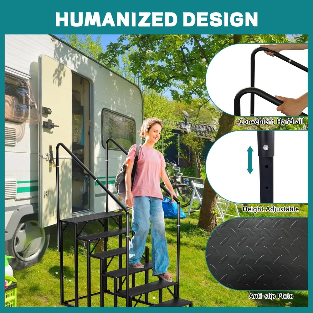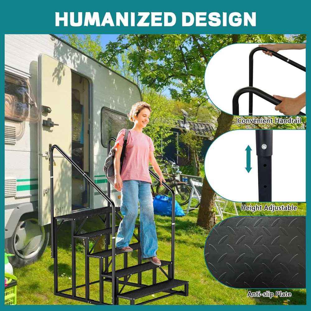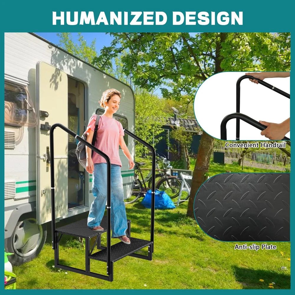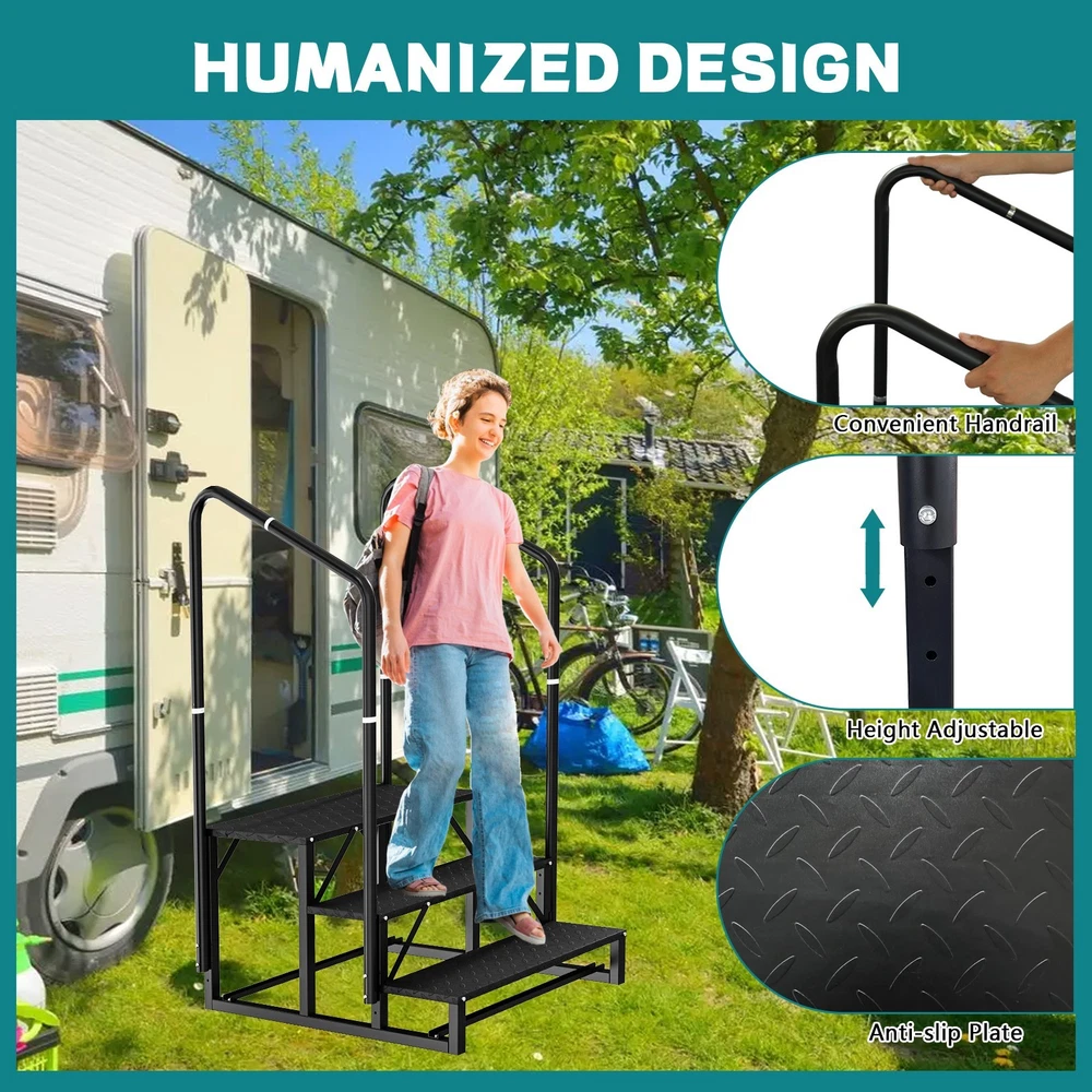 【Sturdy Construction】This RV steps is made from heavy-duty alloy steel, highly resistant to corrosion and deformity. With 500lbs weight capacity, it features triangular bars for added stability, reducing wobbling and the risk of falling. 【Entry Assist Handrail】The mobile RV stair is equipped with handrails that added support when entering and exiting your RV, especially in wet and slippery or nighttime conditions. 【Multiple Size Available】Our camper steps come in different steps to suit your needs, which is 2 to 6 steps. The ladder bookshelf has mounting holes on both sides, allowing for flexible handrail placement. 【Anti-slip Wide Steps】The RV entry steps equipped with thickened panel allows you to step on it more stable, it is not easy to damage and does not need to be pasted that keeping your family and friends safe. 【Wide Application】Our RV step ladder is suitable for various scenarios, such as RVs, travel trailers, campers, swimming spas, and hot tubs, providing support for elderly, children, and other mobility-impaired individuals.